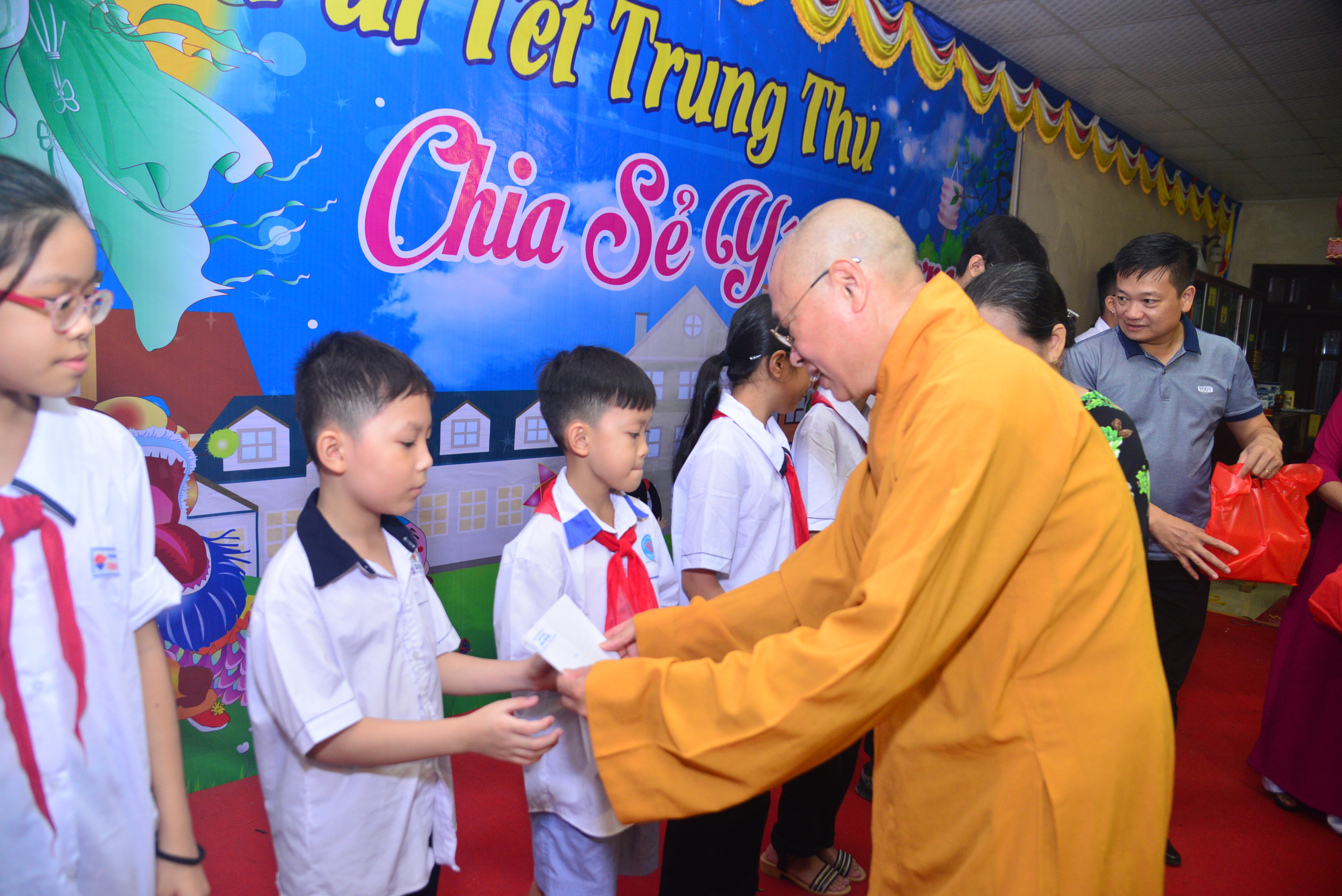 Dịp tết trung thu năm nay, HT. Thích Thanh Giác, cùng chư tăng, Phật tử chùa Phổ Chiếu đã trao tặng 20 phần quà, mỗi phần quà trị giá 700 ngàn đồng, bao gồm 1 phong bì tiền mặt 500 ngàn đồng và 1 túi quà 200 ngàn đồng cho các cháu mồ côi, học sinh nghèo vượt khó và các cháu có hoàn cảnh đặc biệt khó khăn đang sinh sống tại 6 tổ dân phố khu Miếu.