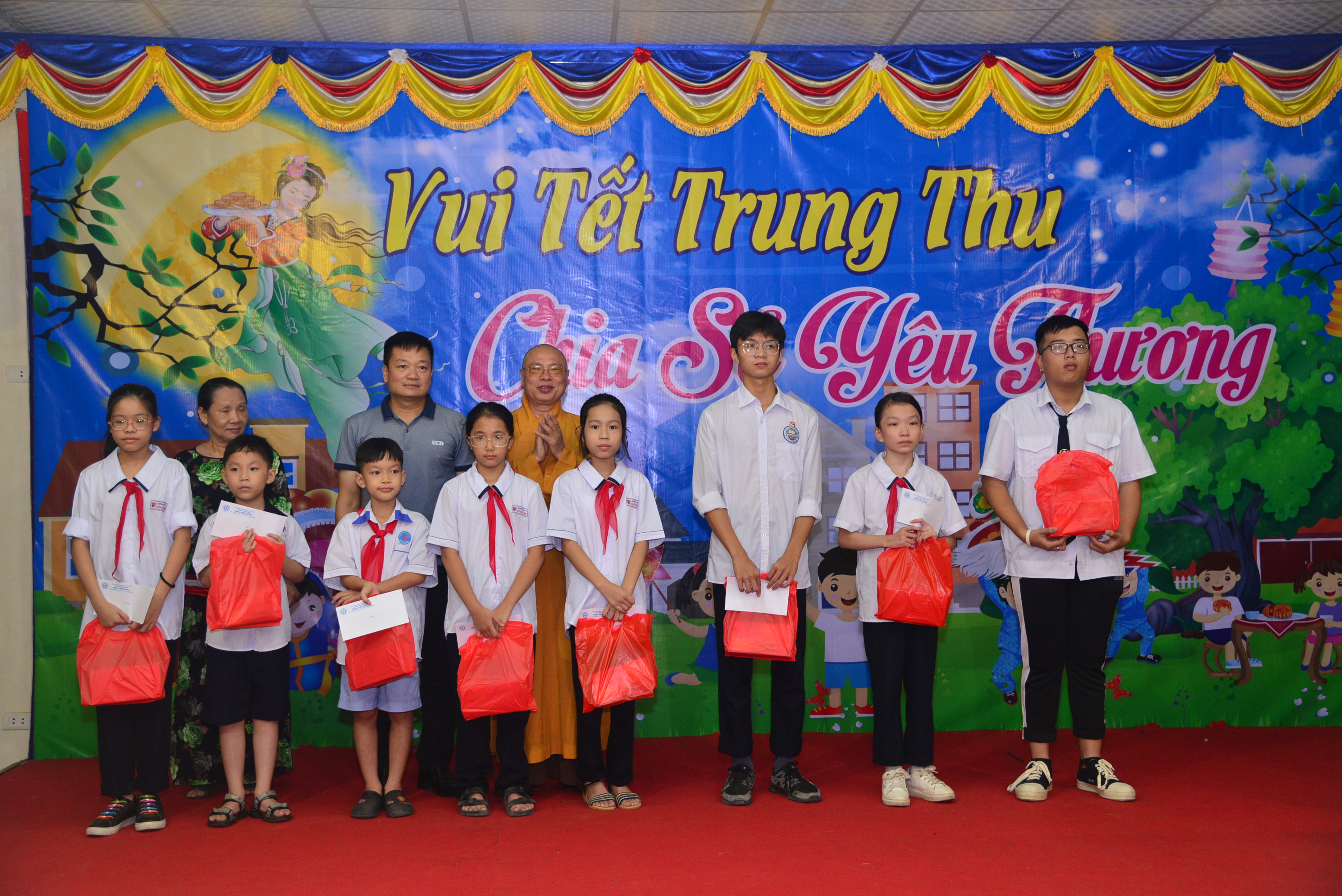 Kết thúc chương trình, các em đã được phá cỗ dưới tăng, vui tết trung thu cùng Chư tôn đức trong chốn trụ xứ và các cô bác lãnh đạo chính quyền địa phương trong không khí vui tươi, phấn khởi, ấm áp tình thân.