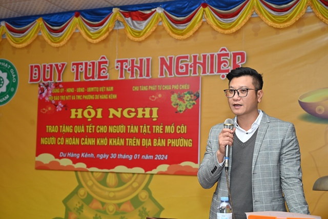 Thay mặt cho chính quyền địa phương, ông: Nguyễn Trọng Đại – Quận Ủy viên, Bí thư Đảng ủy phường Dư Hàng Kênh đã lên phát biểu tri ân Hòa thượng Thích Thanh Giác, chư Tăng, Phật tử chùa Phổ Chiếu nhiều năm qua đã luôn đồng hành, chung tay cùng các cấp chính quyền địa phương, góp phần đảm bảo an sinh xã hội trên địa bàn phường, không để ai bị bỏ lại phía sau. Đặc biệt, năm nay tuy kinh tế gặp rất nhiều khó khăn nhưng bà con nhân dân vẫn nhận được sự trợ duyên, sự phát tâm của chư tăng, Phật tử chùa Phổ Chiếu nên ai cũng thấy ấm lòng khi nhận được những món quà rất ý nghĩa và ấm áp tình người.