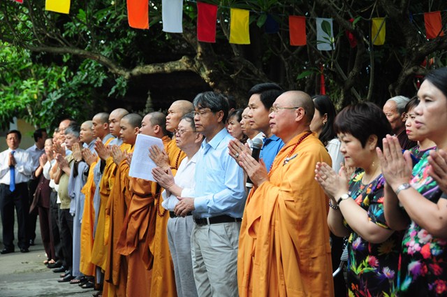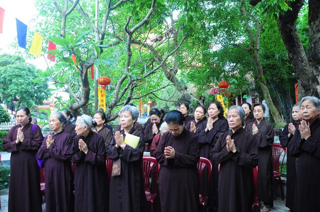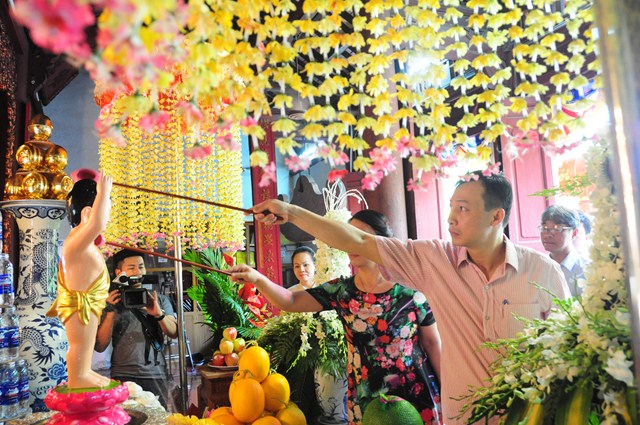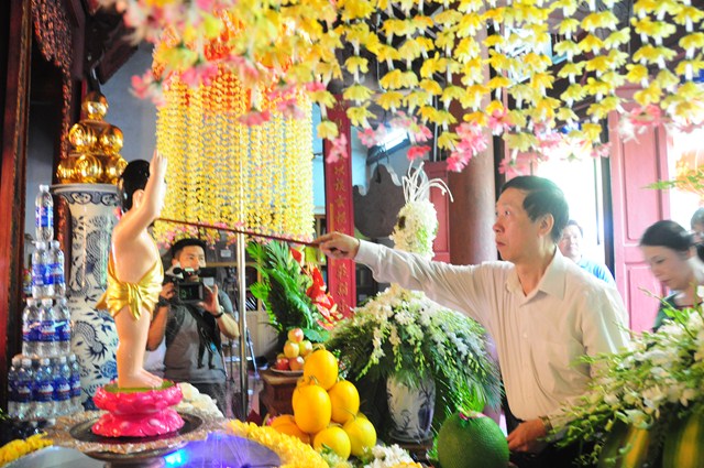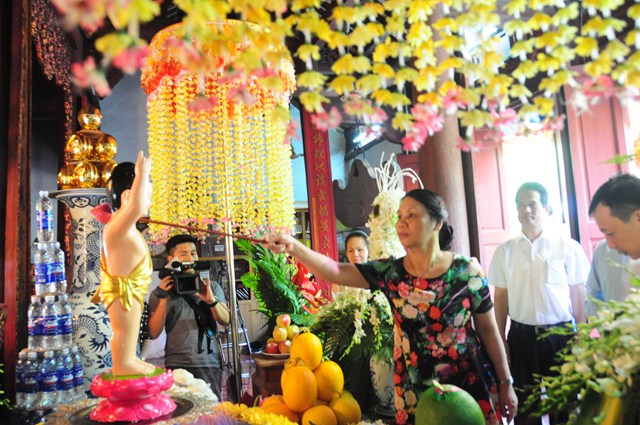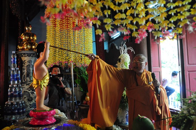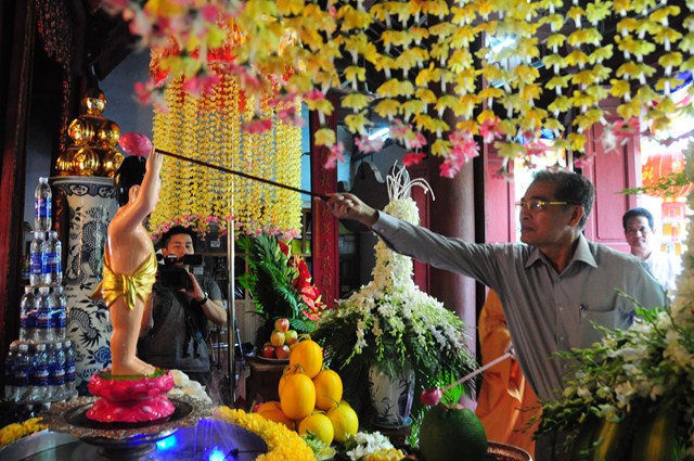 Trước khi kết thúc buổi lễ, Chư tôn đức Tăng Ni, các cấp chính quyền của thành phố, quận Lê Chân và đông đảo các Phật tử đã cử hành nghi lễ niêm hương, bạch Phật, thả bóng bay cầu nguyện thế giới hòa bình, chúng sinh an lạc và nghi lễ tắm Phật theo nghi thức truyền thống của Phật giáo trong không khí hoan hỷ, ấm tình đạo vị nhân ngày đức Phật ra đời.