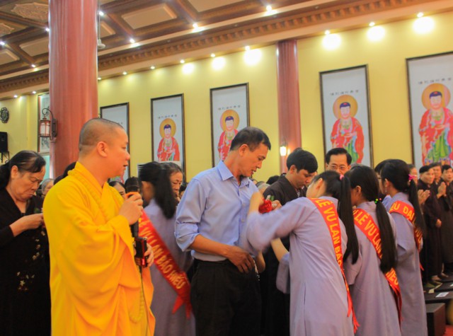 Một phần nghi lễ rất quan trọng trong mỗi chương trình Vu Lan đó là nghi lễ Bông hồng cài áo. Trước khi các phật tử cài trên ngực mình những bông hồng với hai màu tượng trưng là màu đỏ và màu trắng, màu đỏ dành tặng cho những ai còn mẹ và màu trắng là dành cho những ai đã mất mẹ với dòng chữ trên mỗi bông hoa: “Tâm hiếu là tâm Phật, hạnh hiếu là hạnh Phật”, Phật tử Diệu Thanh đã lên tuyên đọc ý nghĩa cài hoa hồng với giọng đọc trầm ấm, đầy xúc cảm khiến cho các phật tử có mặt tại buổi lễ đã không khỏi xúc động khi nghĩ nhớ về công ơn của cha mẹ.