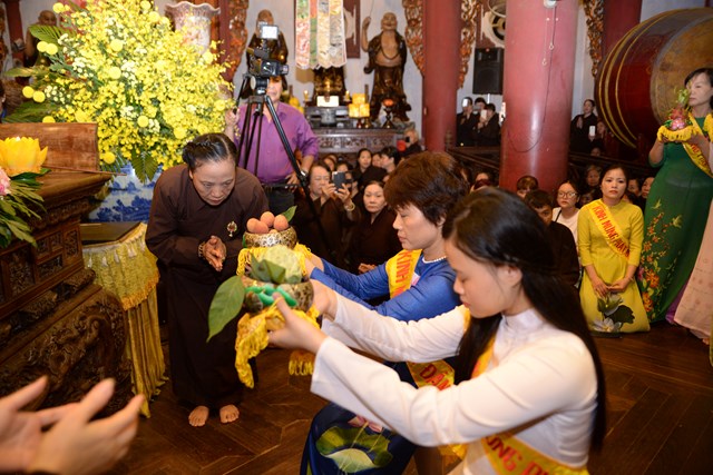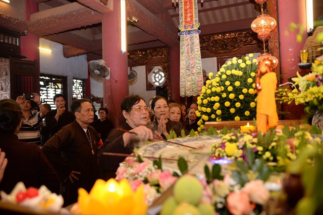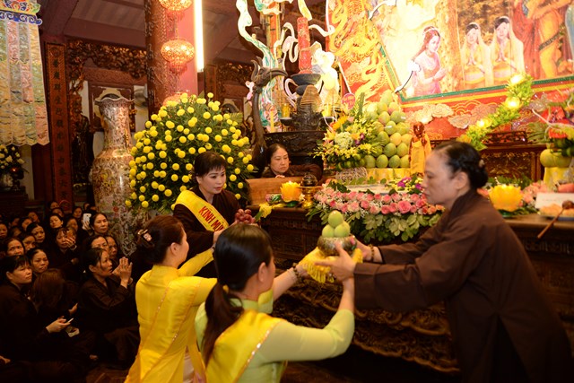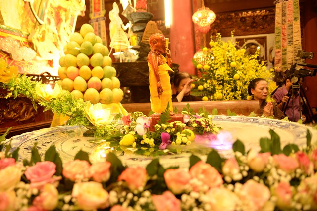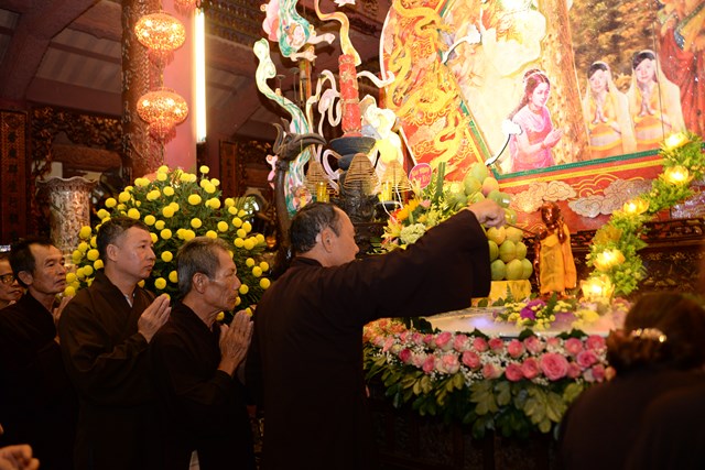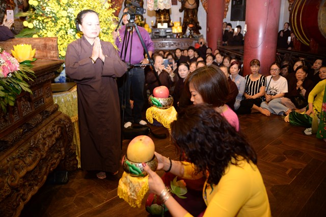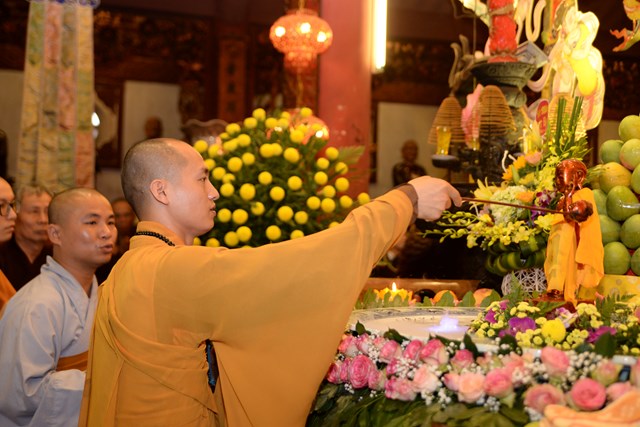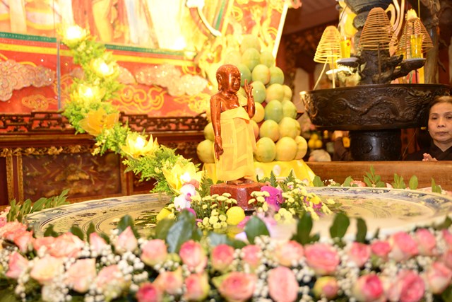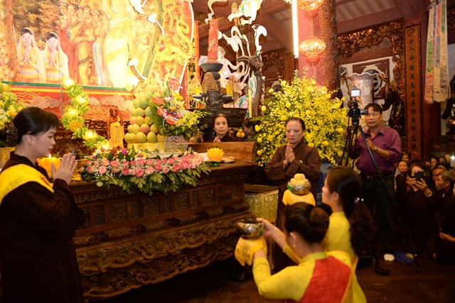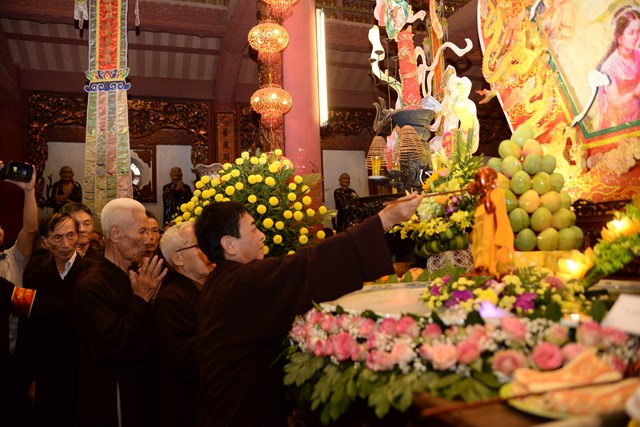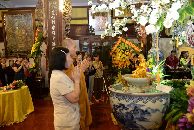 Tiếp đó, đại đức Thích Trường Xuân – Trưởng BTC đại lễ đã cử hành nghi lễ tắm Phật truyền thống, Đại đức đã tự tay mình múc gáo nước đầu tiên dâng tịnh thủy cúng dàng chư Phật và hướng dẫn các Phật tử cách tắm Phật sao cho đúng, cũng như nói lên ý nghĩa, công đức của việc tắm Phật. Mặc dù chính điện của chùa nhỏ với hơn 2000 Phật tử tham dự buổi lễ nhưng các Phật tử rất có ý thức, xếp hàng lần lượt, thanh tịnh thân tâm múc tịnh thủy tắm Phật trong không khí trang nghiêm, thành kính và hoan hỷ.