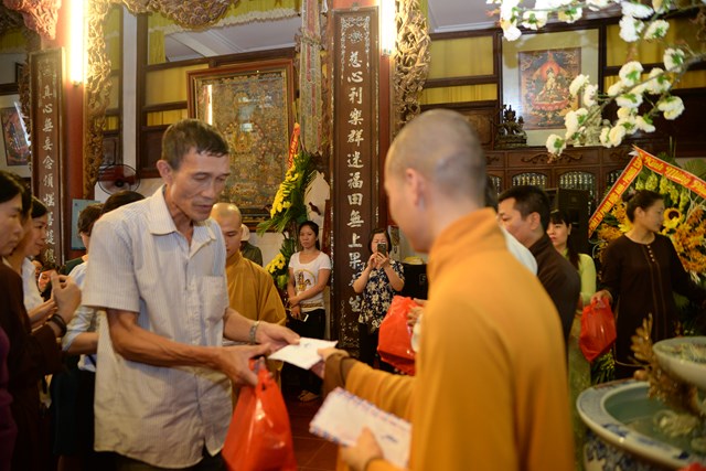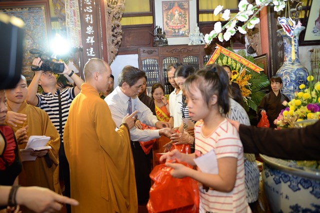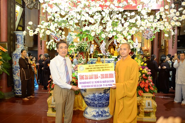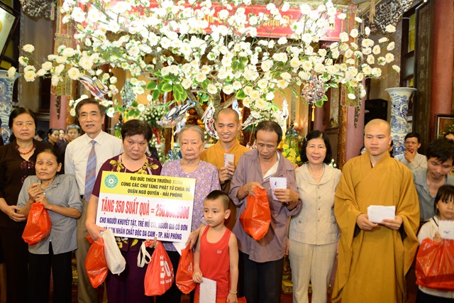 Trên tinh thần từ bi, cứu khổ, ban vui của nhà Phật, chư tôn đức tăng trong chốn trụ xứ cùng các Phật tử, các nhà hảo tâm, các mạnh thường quân chùa Đỏ đã trao 350 suất quà từ thiện, mỗi suất quà trị giá 700 ngàn đồng với tổng số tiền từ thiện lên đến 250 triệu đồng cho các gia đình có hoàn cảnh khó khăn, nạn nhân chất độc da cam, trẻ em nghèo vượt khó, người tàn tật, trẻ mồ côi, người già neo đơn… đang sinh sống tại thành phố Hải Phòng, món quà tuy nhỏ nhưng thể hiện tấm lòng của chư tôn đức tăng, Phật tử chùa Đỏ đối với những mảnh đời bất hạnh, cùng là hành động thiết thực để cúng dàng lên chư Phật nhân mùa khánh đản.