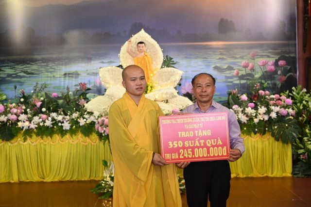 Đại diện Chư tăng chùa Đỏ trao 350 phần quà với số tiền 245 triệu đồng cho ông Tăng Tiến San đại diện Hội Bảo trợ người tàn tật, trẻ mồ côi thành phố Hải Phòng