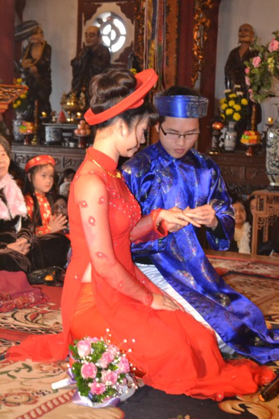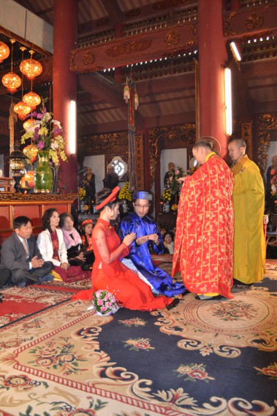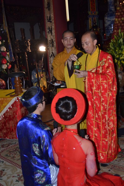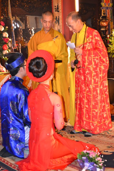 Đại Đức đã đại vì cho ngôi Tam Bảo trao nhẫn cho đôi Tân Lang, Tân Nương để đôi bạn trẻ tự trao nhẫn cưới cho nhau.