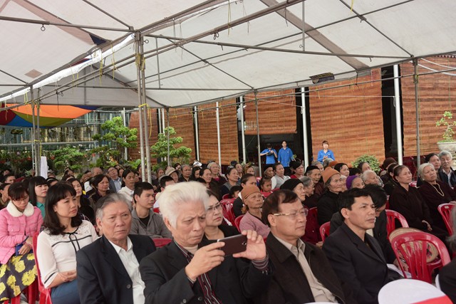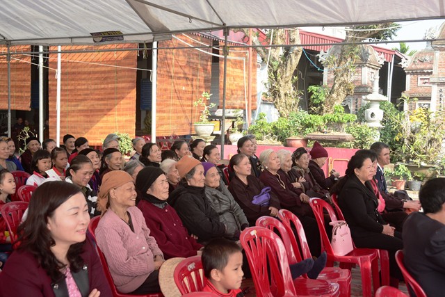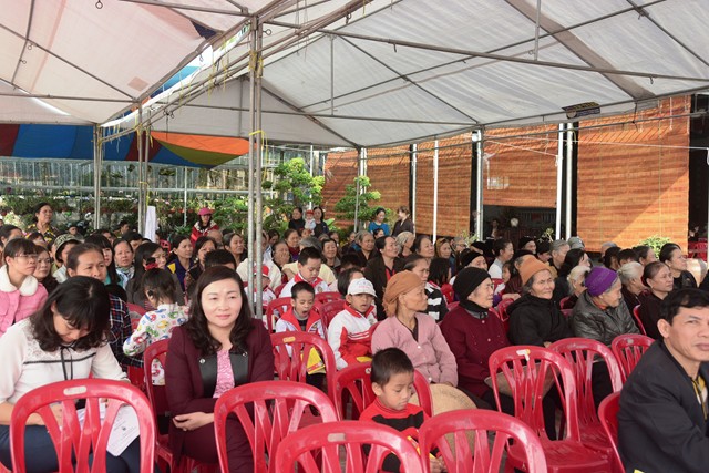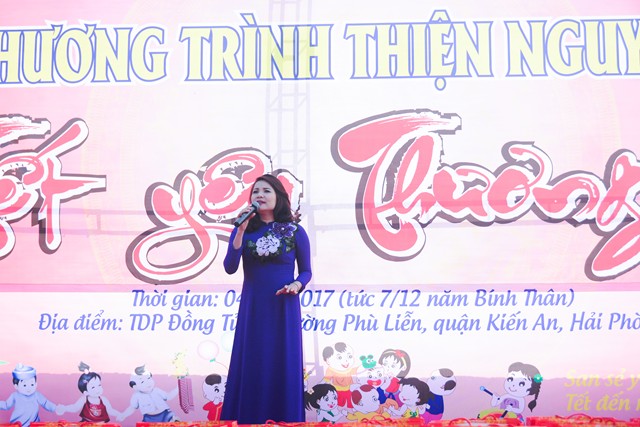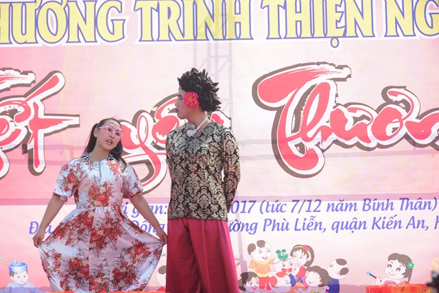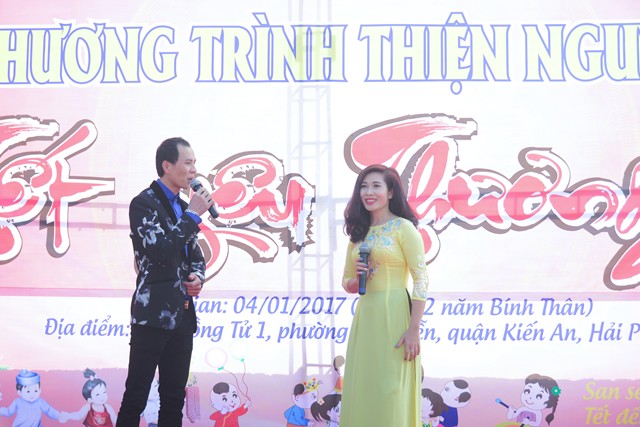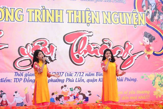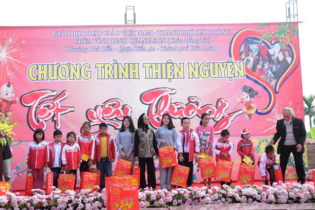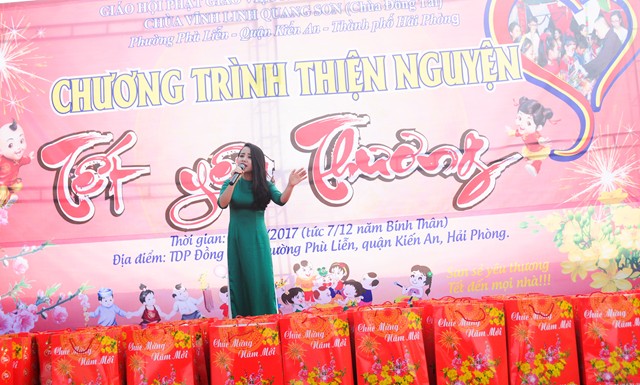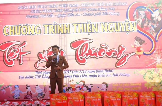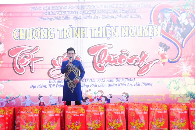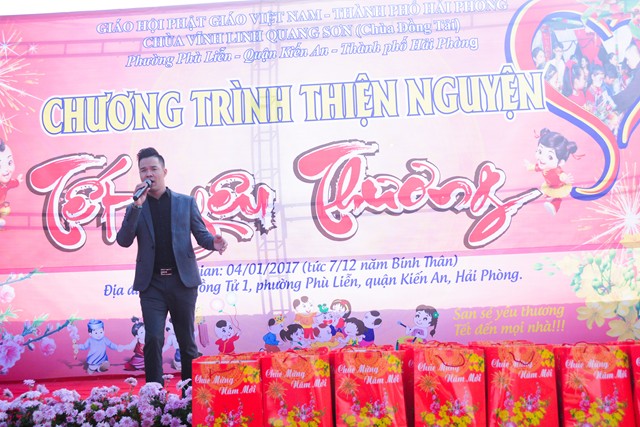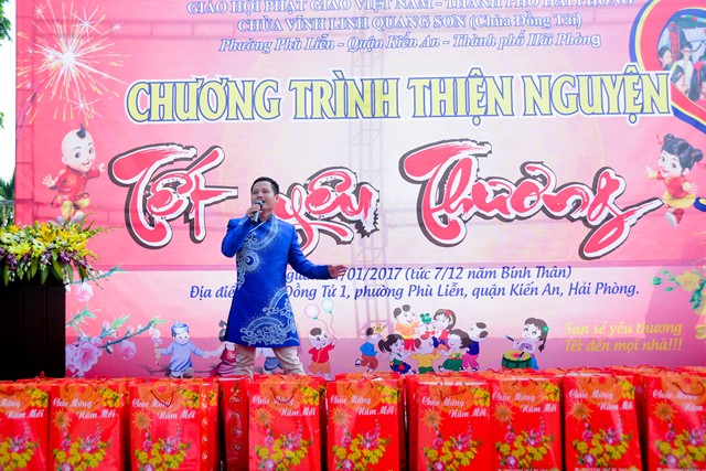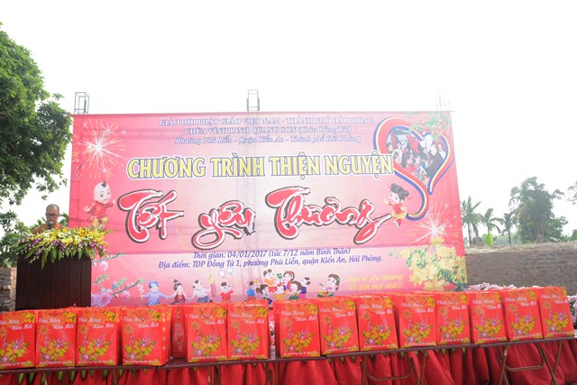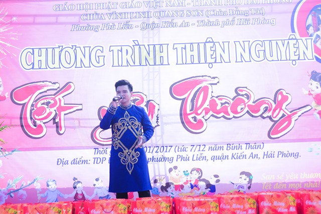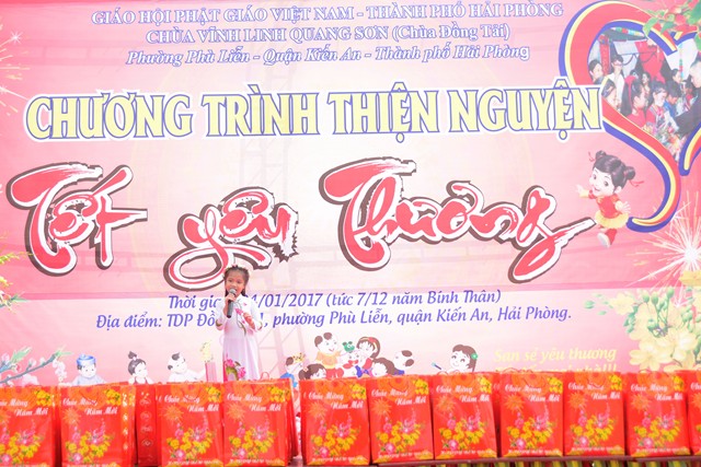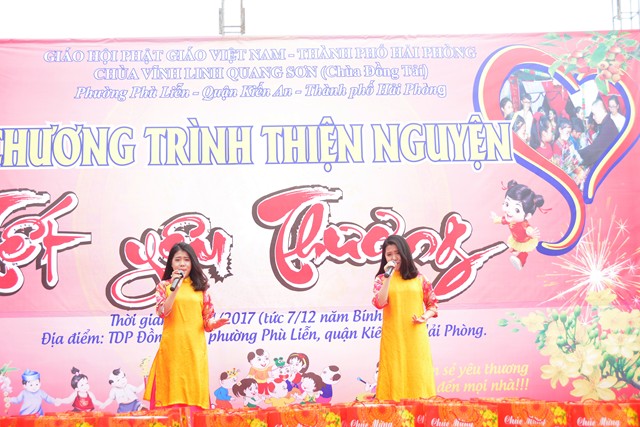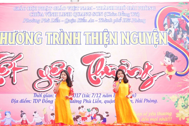 Trước khi chính thức bước vào buổi lễ trao quà từ thiện nhân dịp đón xuân Đinh Dậu – 2017 và kỷ niệm ngày Đức Phật Thích Ca Mâu Ni thành đạo 8/12 âm lịch, các văn nghệ sỹ, một số phật tử của thành phố Hải Phòng, cùng với đó là sự xuất hiện của ca nương nhỏ tuổi nhất Việt Nam, đạt kỷ lịch lục Guinness Việt Nam – Tú Thanh đã trình bày các ca khúc ca ngợi chư Phật, chư Đại Bồ Tát, ca ngợi thầy Tổ. ca ngợi công sinh thành, dưỡng dục của 2 đấng song thân, ca ngợi tình yêu quê hương Đất nước… Kết thúc chương trình văn nghệ là tiểu phẩm hài đặc sắc, ý nghĩa do cán bộ thành đoàn TP. Hải Phòng trình diễn. Tiểu phẩm hài này, ngoài việc gây lại tiếng cười cho bà con, Phật tử nó còn mang tính giáo dục và mang đậm tính nhân văn sâu sắc.