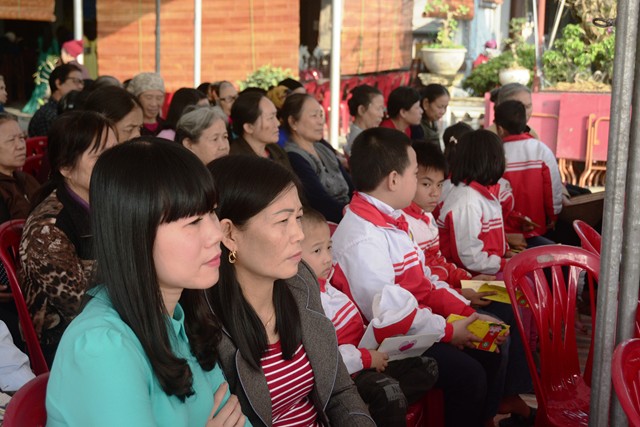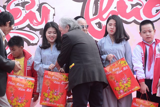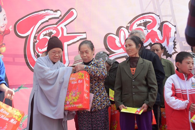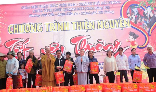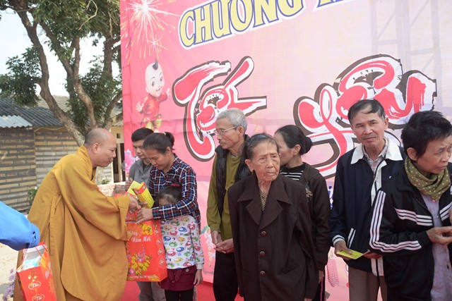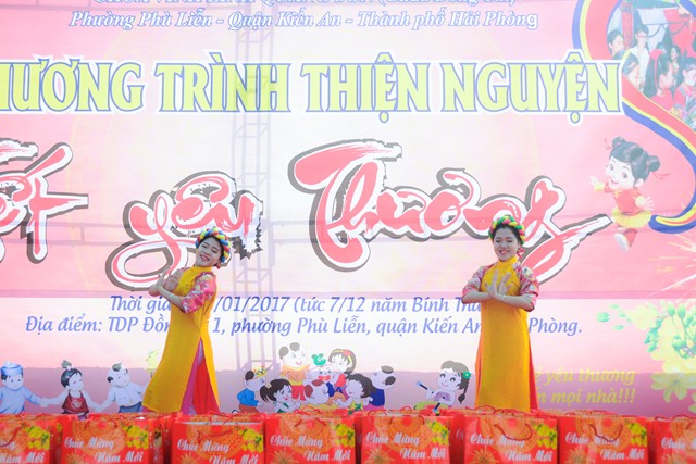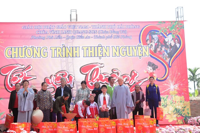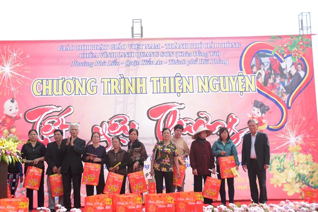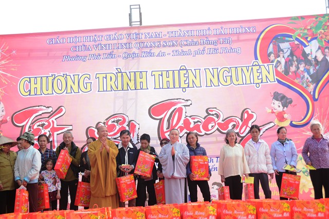 Ngay sau các tiết mục văn nghệ chào mừng, SC. Thích Diệu Hướng – Trụ trì chùa Đồng Tải, trưởng Ban tổ chức chương trình cùng chư tôn đức chứng minh cùng chính quyền địa phương, các nhà hảo tâm và các mạnh thường quân trao 70 phần quà với tổng số tiền là 21 triệu đồng, mỗi phần quà trị giá 300 ngàn đồng bao gồm: bánh kẹo, mỳ chính, đường, dầu ăn và một phong bì tiền mặt 100 ngàn đồng cho 70 hộ gia đình có hoàn cảnh khó khăn, người già neo đơn, trẻ mồ côi, trẻ tàn tật, trẻ em nghèo vượt khó trên địa bàn phường Phù Liễn, quận Kiến An, Tp. Hải Phòng.