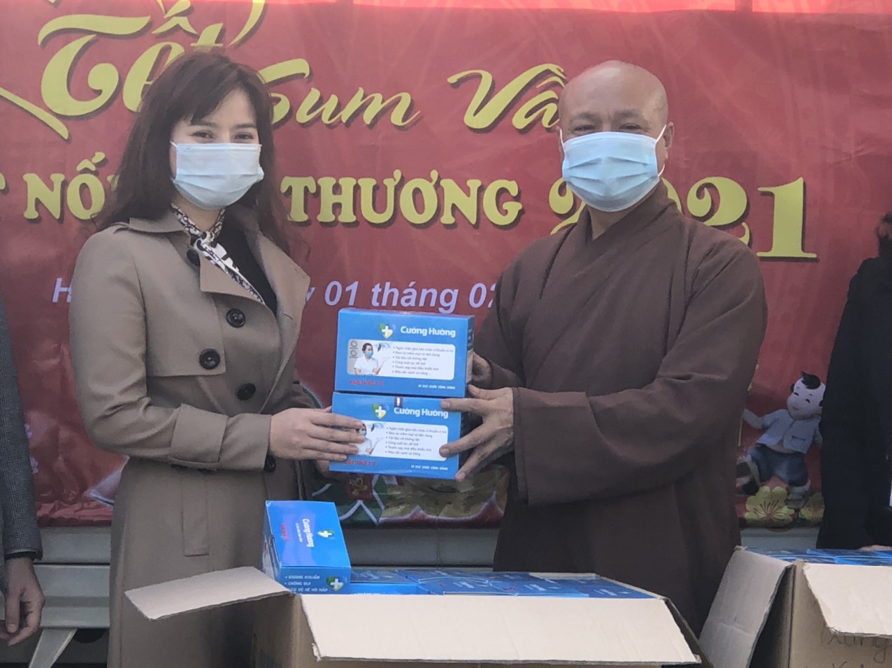 Đại diện mạnh thường quân tặng quà tết cho người nghèo tại chùa Hưngg Long