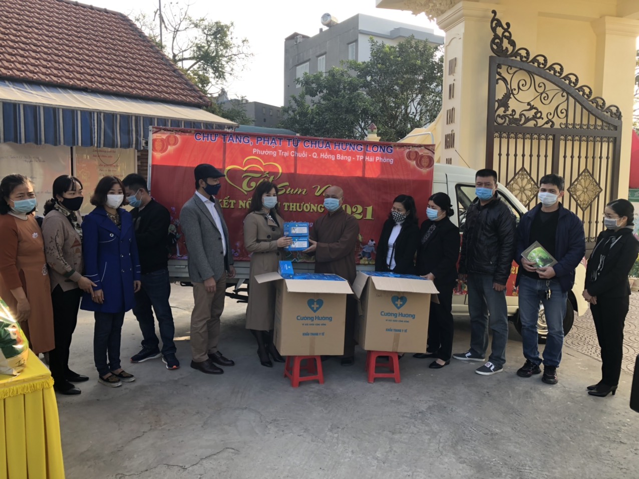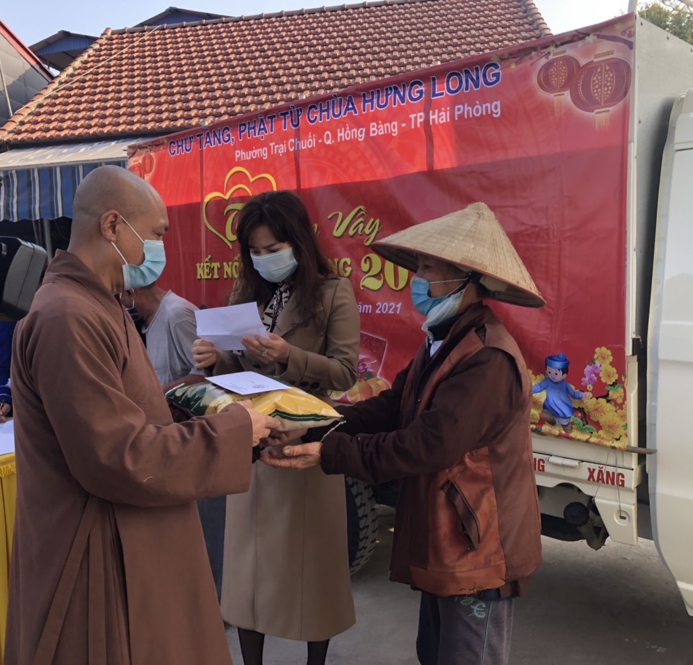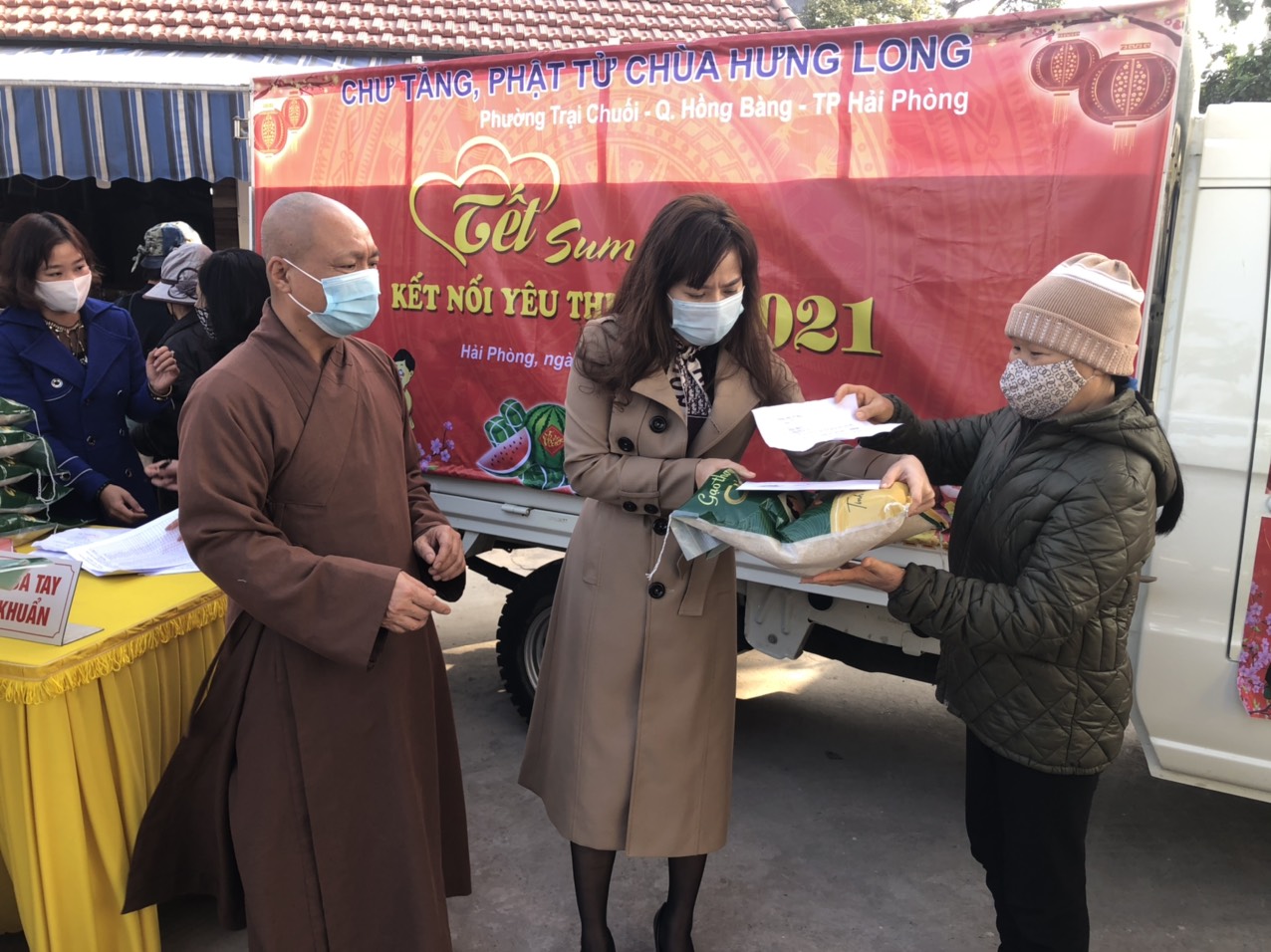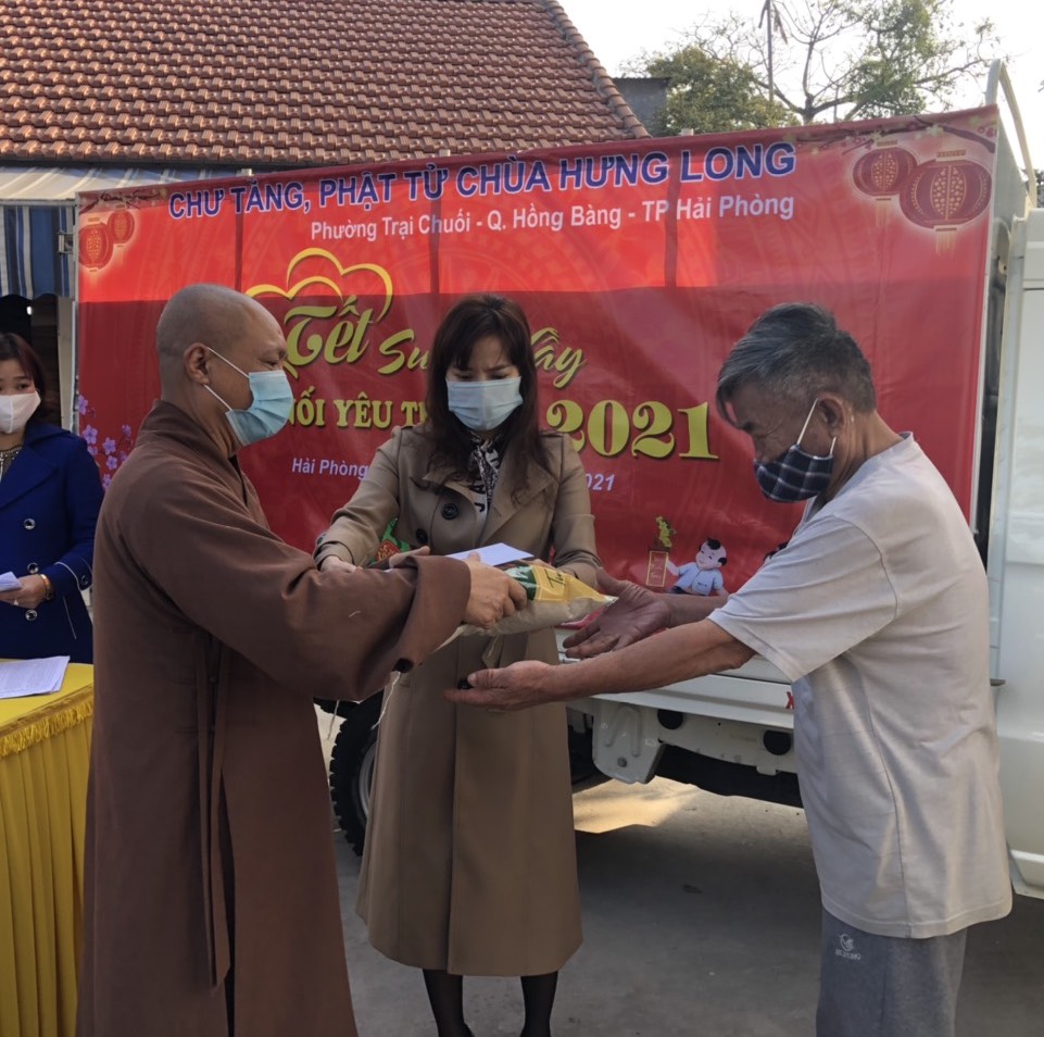 Ngày 01/02/2020 ( nhằm ngày 21 tháng Chạp năm Canh Tý), với tinh thần Từ Bi của người con Phật và nhân dịp chuẩn bị đón tết cổ truyền năm Tân Sửu – 2021, chư Tăng, Phật tử chùa Hưng Long, phường Trại Chuối, quận Hồng Bàng, thành phố Hải Phòng đã tổ chức chương trình “ Tết sum vầy kết nối yêu thương”, trao tặng 530 phần quà cho các gia đình có hoàn cảnh khó khăn đang sinh sống trên địa bàn quận Hồng Bàng và bệnh nhân nghèo hiện đang điều trị tại Bệnh viện Phổi Hải Phòng, quận Kiến An, thành phố Hải Phòng.