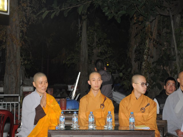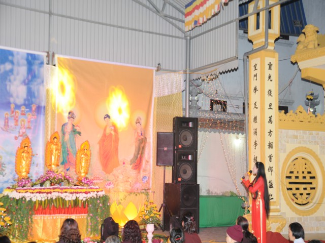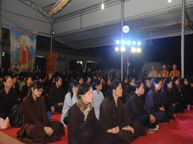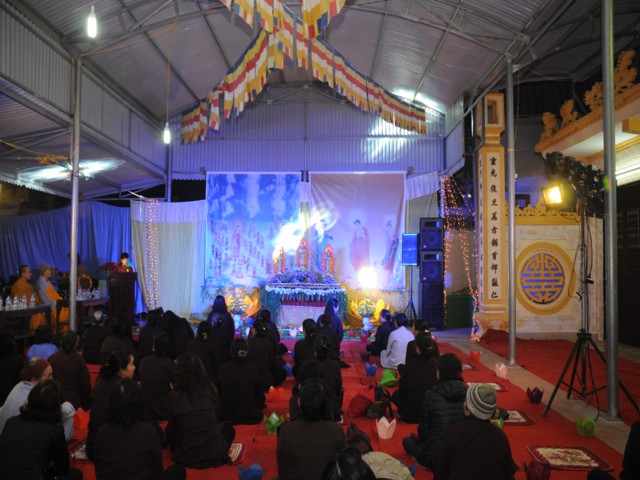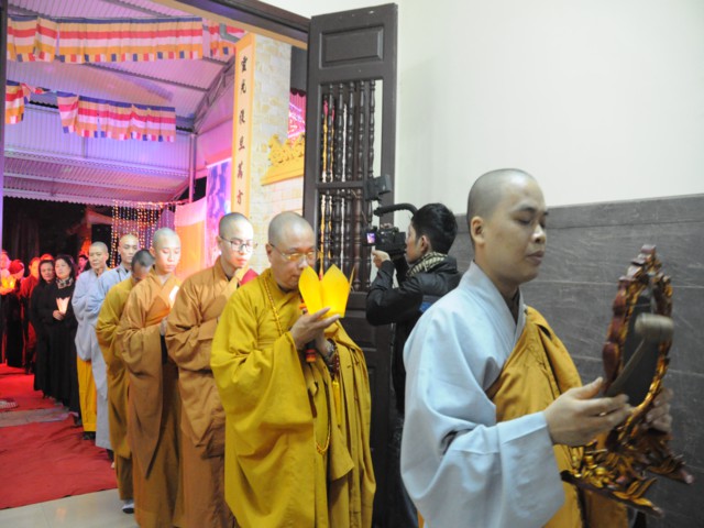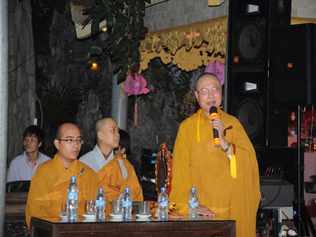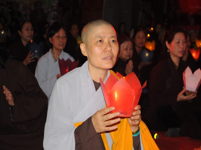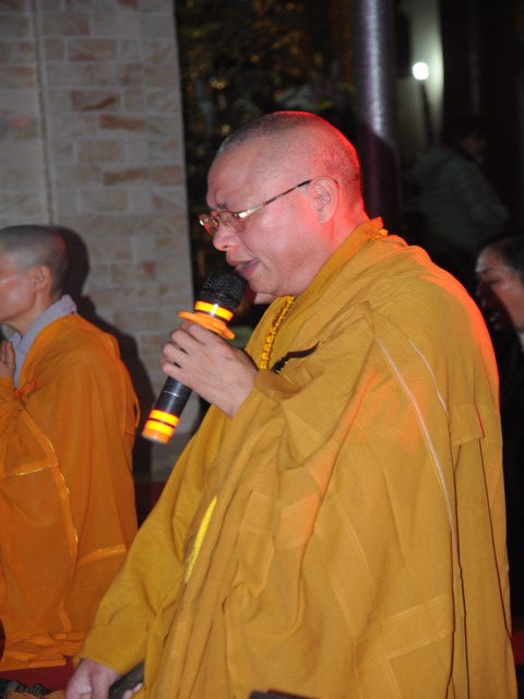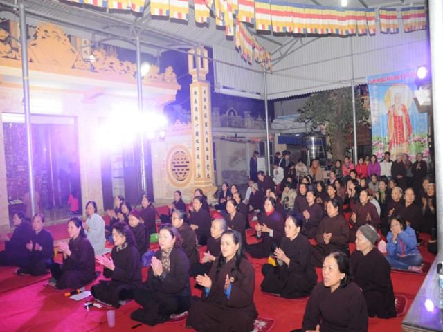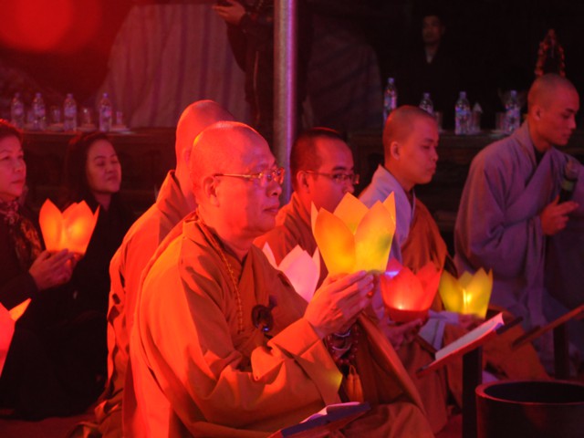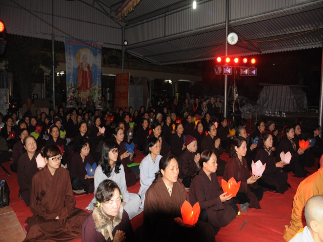 Đúng 19h30 phút đã chính thức diễn ra Đêm hoa đăng mừng khánh đản đức từ phụ A Di Đà. Sau nghi thức niệm Phật cầu gia bị, chào đạo kỳ, quốc kỳ, một phút nhập từ bi quán tưởng niệm Chư lịch đại Tổ Sư, các vị lãnh tụ qua các thời kỳ, các anh hùng liệt sỹ đã hy sinh cho độc lập tự do của Đất nước, Ni Sư Thích Tâm Kính – Phó Ban tổ chức đại lễ đã lên tuyên đọc diễn văn khai mạc và nói sơ qua về lịch sử đức Phật A Di Đà để các Phật tử nắm rõ hơn về cách tu học cũng như con đường tu học của mình để khi hết báo thân này được sinh qua cõi Tây Phương Cực Lạc của đức Phật A Di Đà.