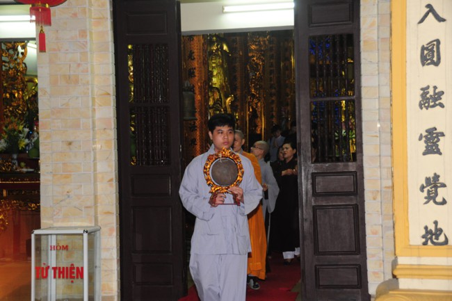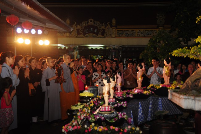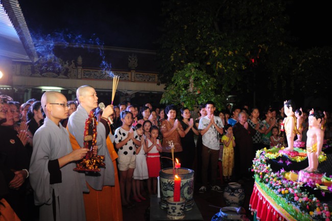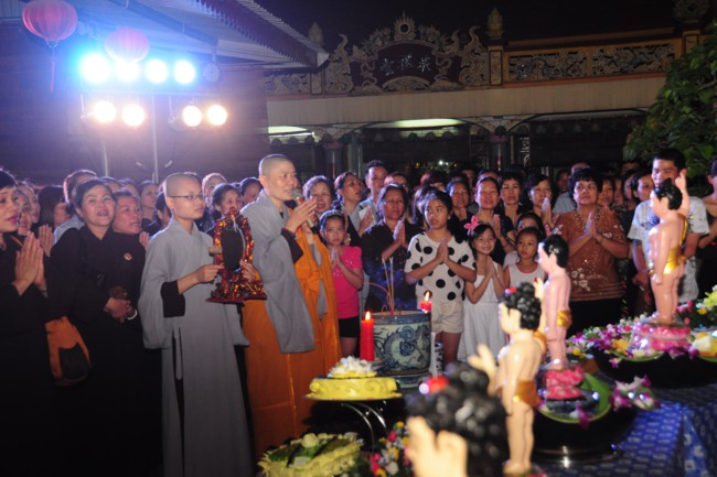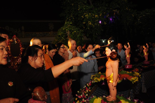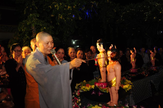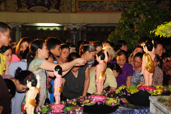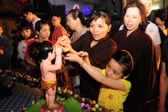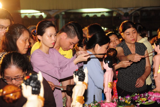 Giờ phút thiêng liêng nhất đã đến khi những người con Phật được chính tay mình lấy những gáo nước để tắm lên tôn tượng đản sinh của Ngài. Mục đích của việc tắm Phật là để chúng ta gột rửa thân tâm, bỏ ác, làm lành, noi theo gương của Đức Phật trên tinh thần Từ Bi, Bác ái, Cứu khổ, Ban vui cho muôn loài.