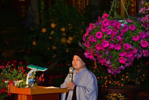 Phát biểu tại buổi phát quà, Ni Sư Thích Đàm Chi đã có lời động viên thăm hỏi, chúc tết tới các cấp chính quyền xã Hữu Bằng, bà con Phật tử, nhân dân địa phương, mong muốn trong thời gian tới các gia đình có hoàn cảnh khó khăn trong xã sẽ sớm thoát nghèo, vươn lên ổn định cuộc sống, cố gắng tu học theo lời Phật dạy, bỏ ác làm lành để có cuộc sống an lạc, hạnh phúc. Đồng thời, Ni sư cũng thay mặt cho Ban tổ chức tri ân các nhà hảo tâm, các mạnh thường quân đã đóng góp tịnh tài, tịnh vật cho việc phúc này, mong tiếp tục nhận được sự đóng góp của các doanh nghiệp, các nhà hảo tâm, các mạnh thường quân trong các chương trình tiếp theo. Ngoài ra, Ni sư đã ôn lại lịch sử Phật giáo, tứ trọng ân trong Đạo Phật và nêu lên vai trò của Đạo Phật đối với Dân tộc trên phương châm mà GHPGVN đã đề ra: “ Phật giáo luôn đồng hành cùng Dân tộc”.