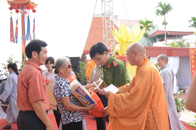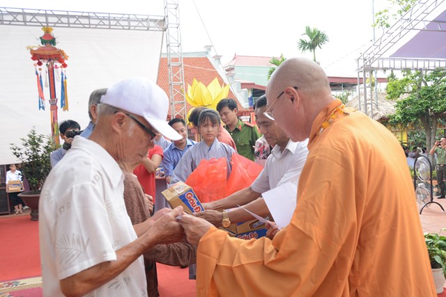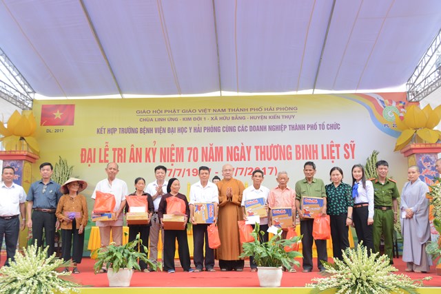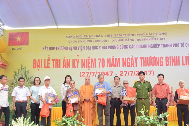Cũng trong dịp này, Ban trị sự GHPGVN thành phố Hải Phòng, chư tăng, Phật tử chùa Linh Ứng đã trao hơn 200 phần quà, mỗi phần quà trị giá 500.000 đồng cho các gia đình thương binh liệt sỹ, các gia đình chính sách trên địa bàn xã Hữu Bằng, huyện Kiến Thụy. Đồng thời phối hợp cùng trường Đại học Y Dược Hải Phòng, Bệnh viện Đại học Y Dược Hải Phòng, khám chữa bệnh và cấp phát thuốc miễn phí cho các thương bệnh binh, thân nhân các liệt sỹ, các gia đình chính sách, có hoàn cảnh khó khăn đang sinh sống tại xã Hữu Bằng, huyện Kiến Thụy, TP. Hải Phòng.