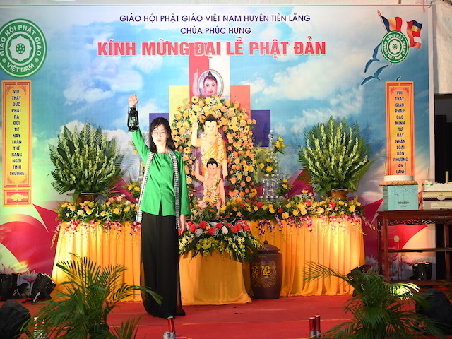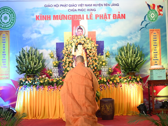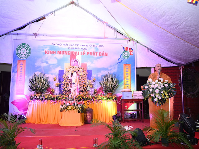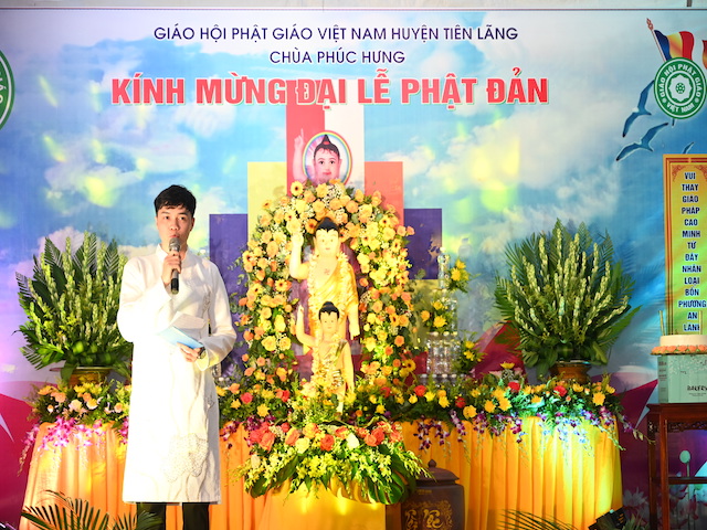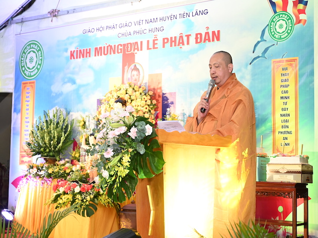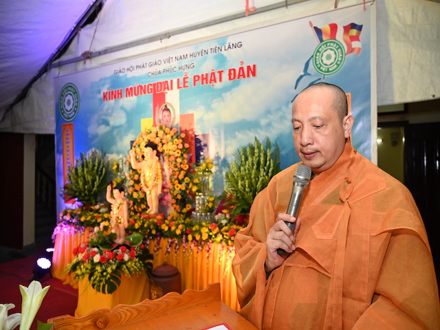Sau nghi thức chào Quốc kỳ, Đạo kỳ, một phút nhập từ bi quán tưởng nhớ chư lịch đại Tổ Sư, các vị lãnh tụ tiền bối, các anh hùng liệt sỹ đã hy sinh bảo vệ cho độc lập tự do cho Đất nước, Thượng tọa Thích Quảng Minh – Trưởng Ban trị sự GHPGVN huyện Tiên Lãng đã lên cung tuyên Thông điệp Đại lễ Phật đản PL. 2567 – DL. 2023 của trưởng lão Hòa thượng thượng Trí hạ Quảng– Đức đệ tứ Pháp chủ GHPGVN gửi chư tôn đức Tăng Ni, quý Phật tử Việt Nam ở trong nước và nước ngoài nhân Đại lễ Phât đản PL. 2567. Thông điệp nêu rõ: “Mùa Phật đản Phật lịch 2567 trở về, người con Phật khắp năm châu lại được hân hoan đón mừng ngày Đấng Đạo sư thị hiện ở đời vì hạnh phúc, vì an lạc cho số đông, vì lợi ích cho chư Thiên và loài người. Đây là dịp cho tất cả chúng ta cùng ôn lại lịch sử của Đức Phật Bản sư Thích Ca Mâu Ni, là cơ hội để mọi người chiêm nghiệm, sống theo lời dạy chân thực, có giá trị vượt thời gian của Ngài. Những lời dạy đó gợi ý các giải pháp xây dựng nền hòa bình thế giới, hạnh phúc thực sự cho con người và sự phát triển bền vững cho xã hội.