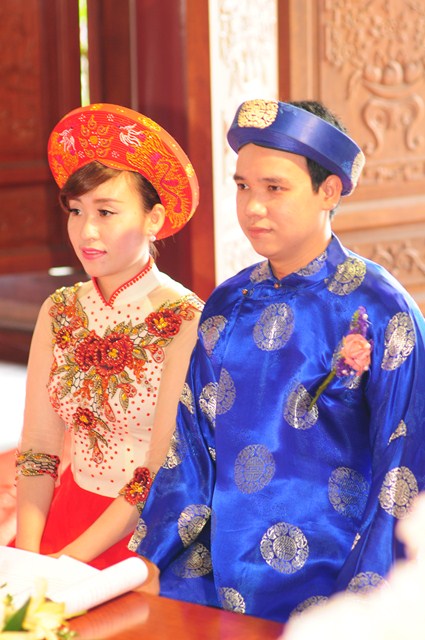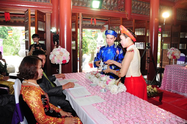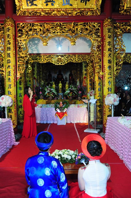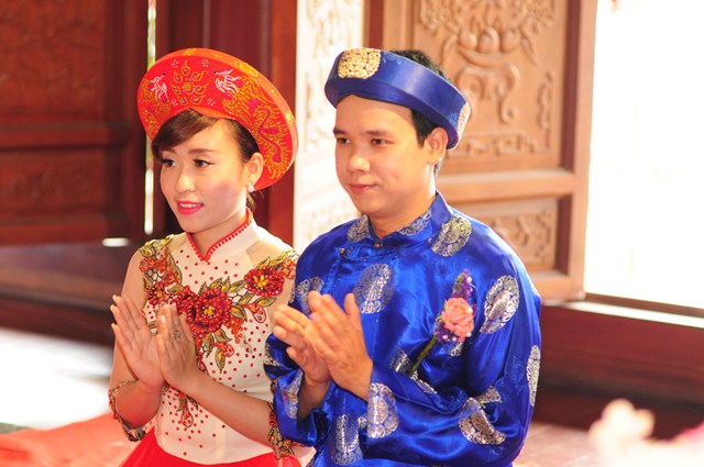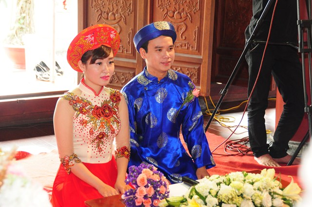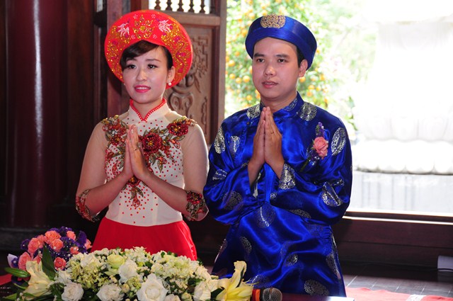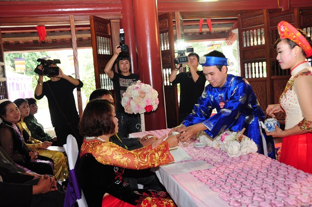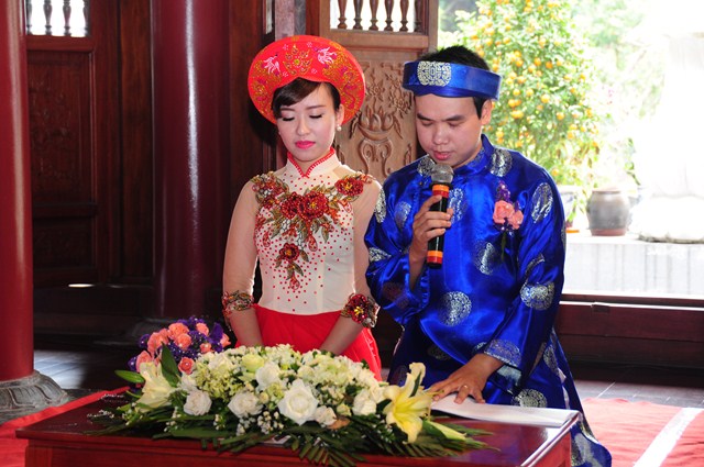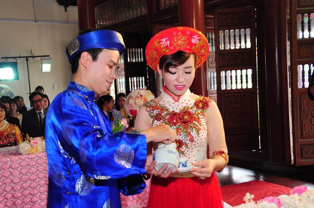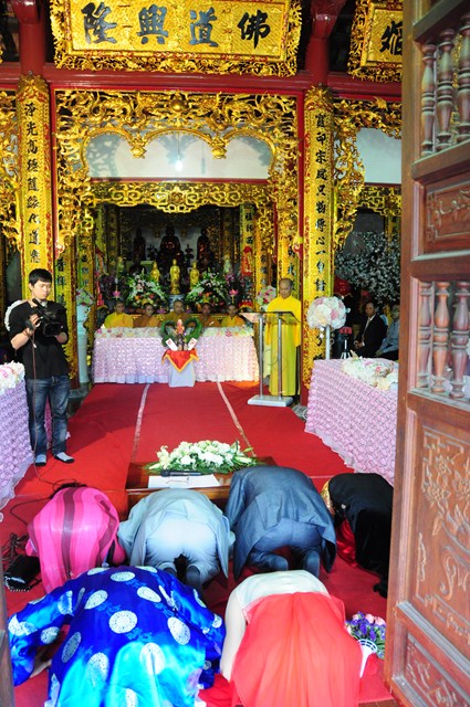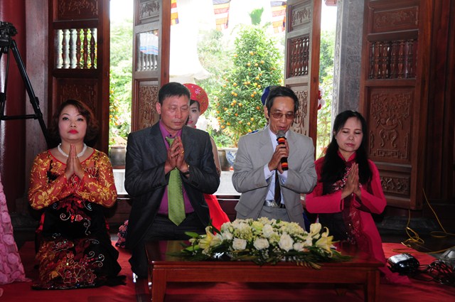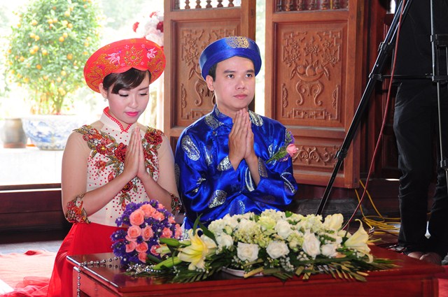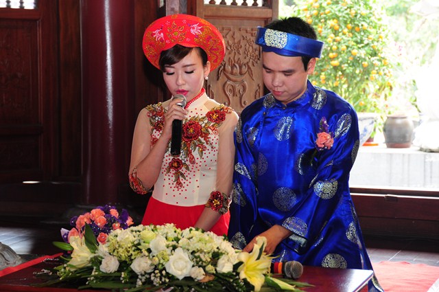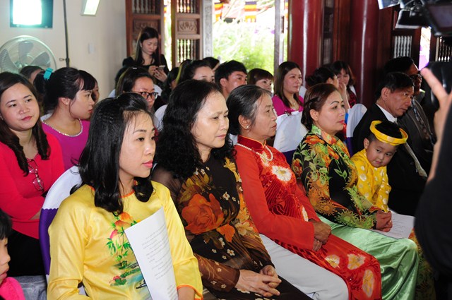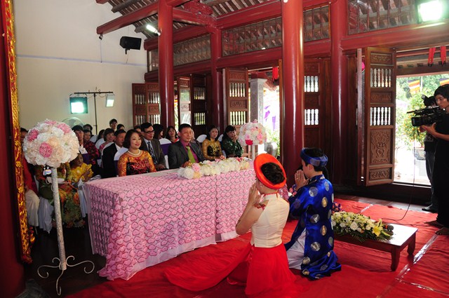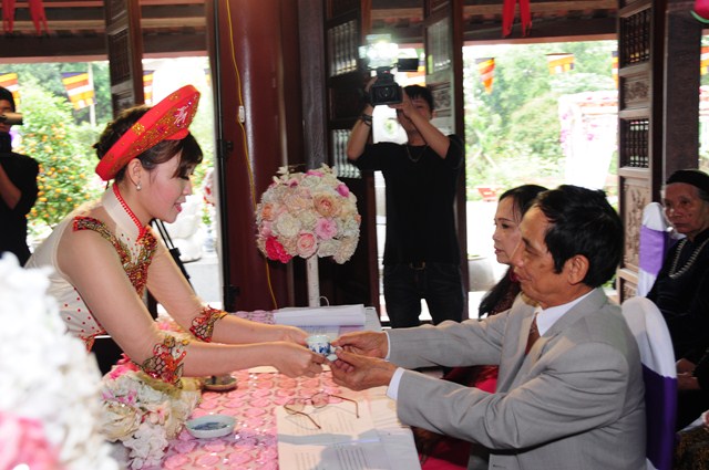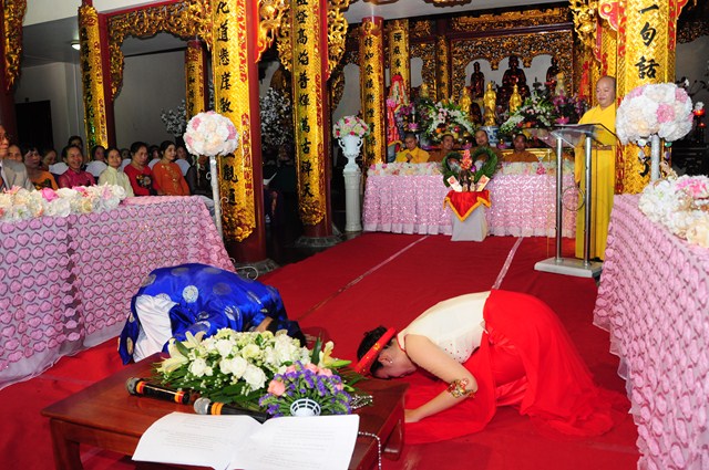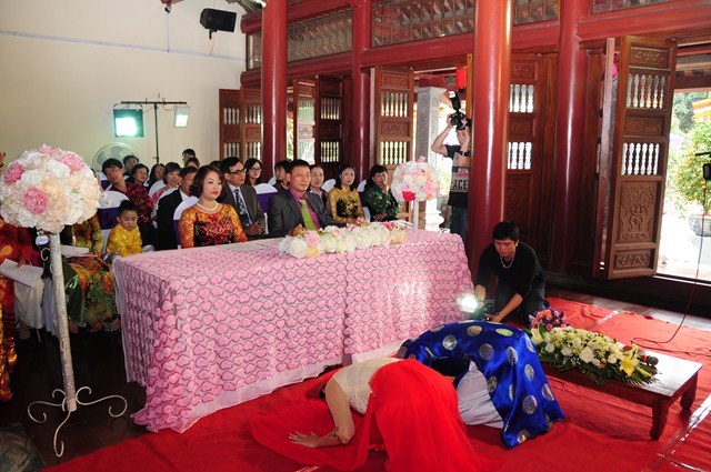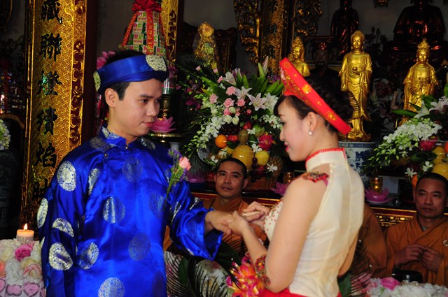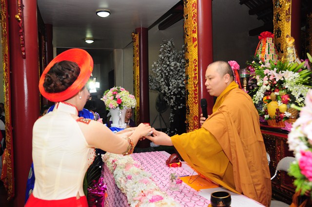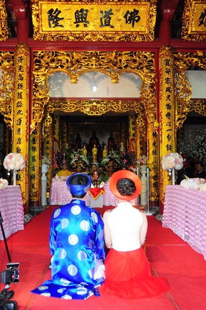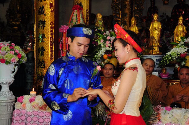 Dưới sự gia hộ của mười phương Chư Phật và sự chứng minh của Chư tôn đức Tăng Ni, đôi tân lang, tân nương đã làm lễ tạ ơn Tam Bảo, lễ tri ân công sinh thành dưỡng dục, lễ mời trà để báo đáp công ơn của hai đấng song thân. Đồng thời, để thể hiện sự kính trọng, bình đẳng, tôn kính lẫn nhau, đôi bạn trẻ đã lễ lạy nhau thông qua nghi lễ phu thê giao bái.