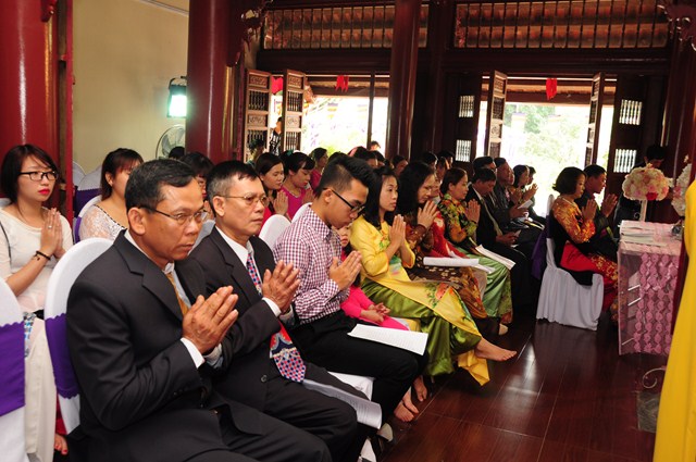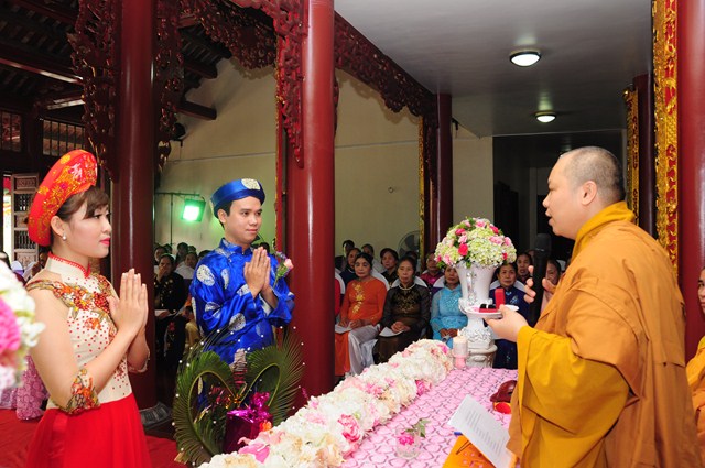Kết thúc buổi lễ, Chư tôn đức Tăng ni, đôi tân lang, tân nương, gia đình nội ngoại 2 bên cùng toàn thể đại chúng đã cử hành nghi lễ niêm hương bạch Phật, cầu nguyện Quốc thái dân an, cầu nguyện cho đôi bạn trẻ luôn được sống trong ánh hào quang của mười phương chư Phật, sống một cuộc sống an vui và hạnh phúc.