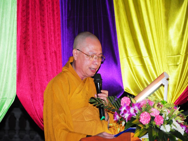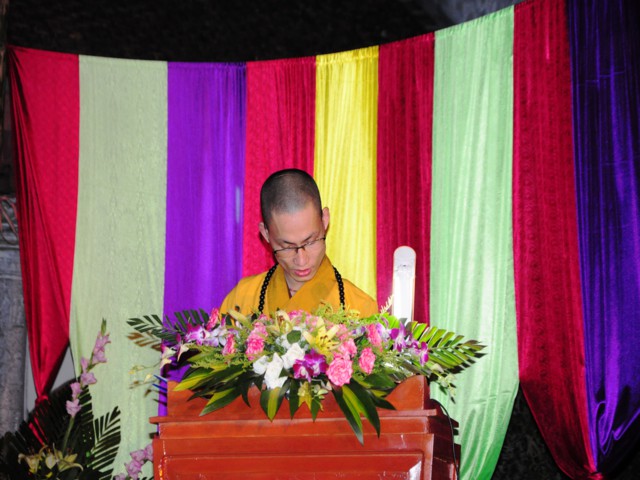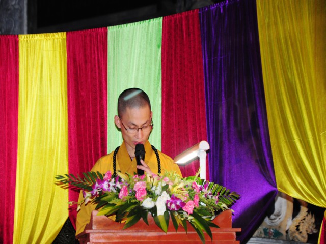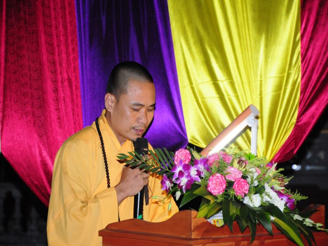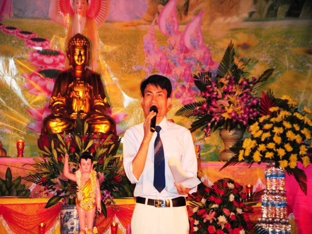 Sau khi cung tuyên Thông điệp kính mừng Phật đản của đức Pháp chủ GHPGVN, ĐĐ. Thích Bản Tâm – Phó BTS GHPGVN huyện Vĩnh Bảo đã lên tuyên đọc Diễn văn khai mạc mừng Phật đản PL. 2558 của Chủ tịch HĐTS TW GHPGVN.