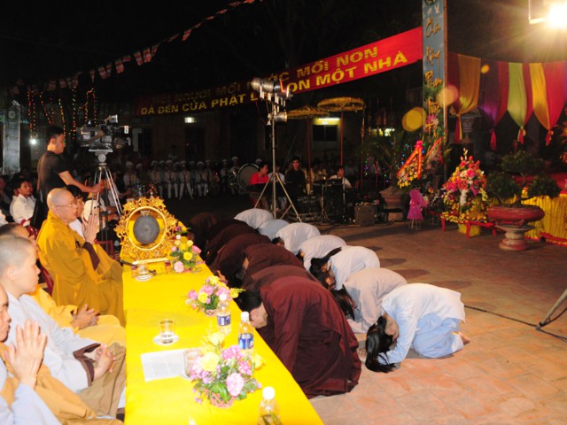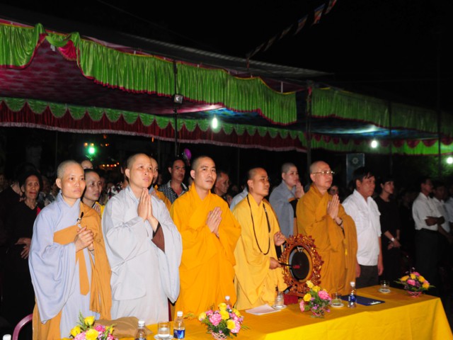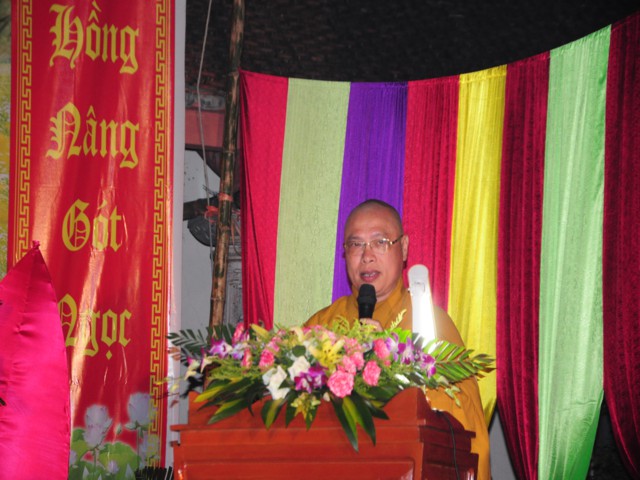 Sau nghi thức niệm Phật cầu gia bị, chào Quốc kỳ, Đạo kỳ, một phút nhập từ bi quán, TT. Thích Thanh Giác – Phó trưởng Ban Hoằng Pháp TW GHPGVN, Phó trưởng Ban trị sự GHPGVN Tp. Hải Phòng, Trưởng BTS GHPGVN huyện Vĩnh Bảo đã lên cung tuyên Thông điệp Phật đản PL. 2558 của đức Pháp chủ GHPGVN, Hòa thượng Thích Phổ Tuệ.