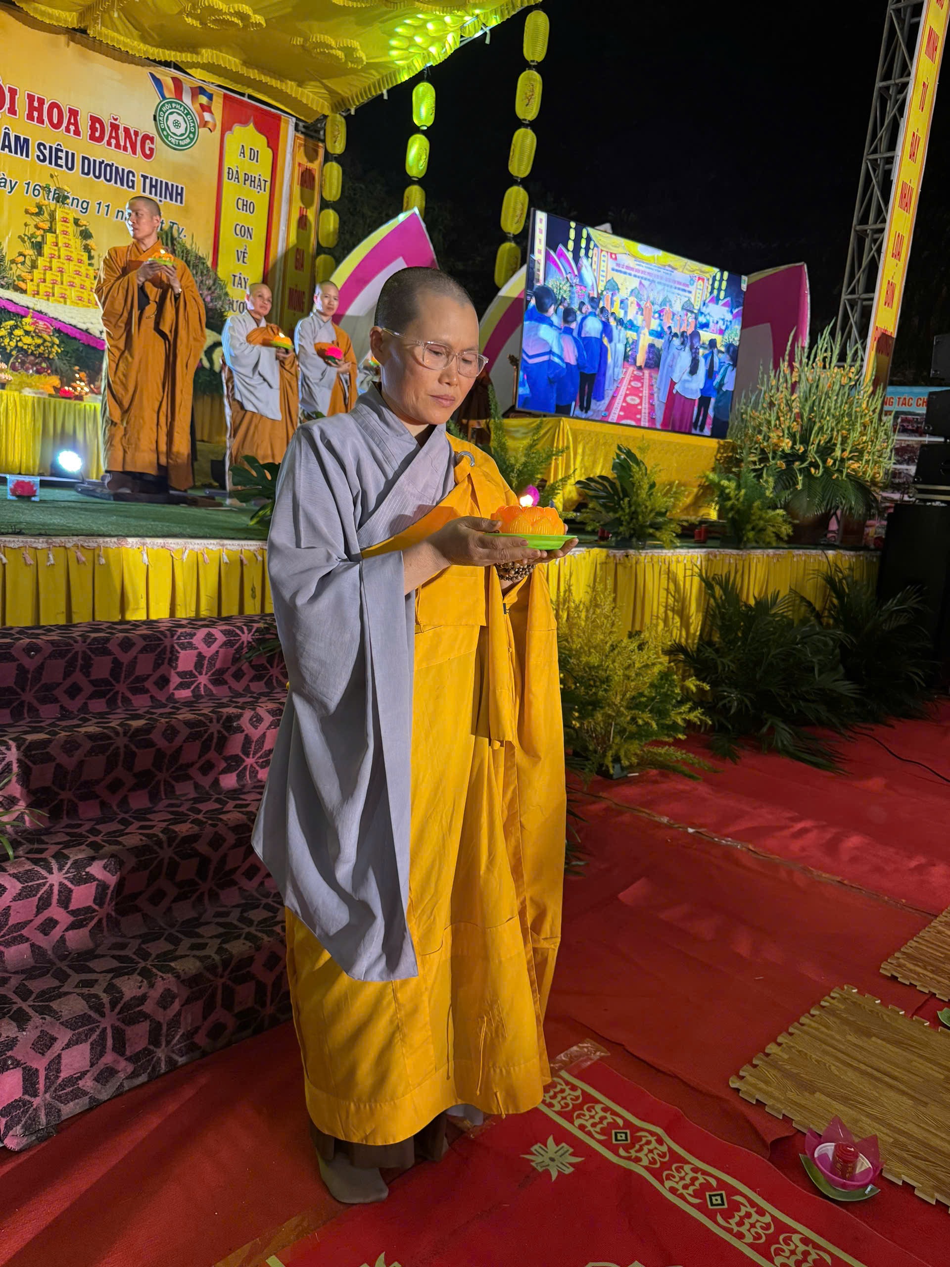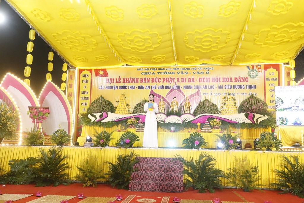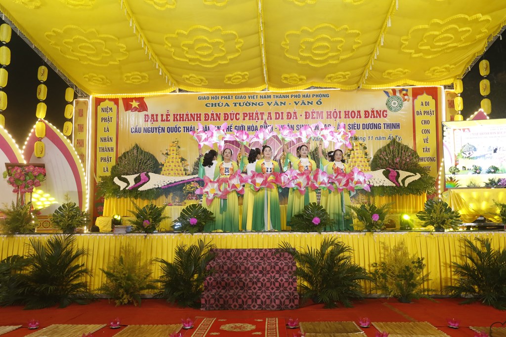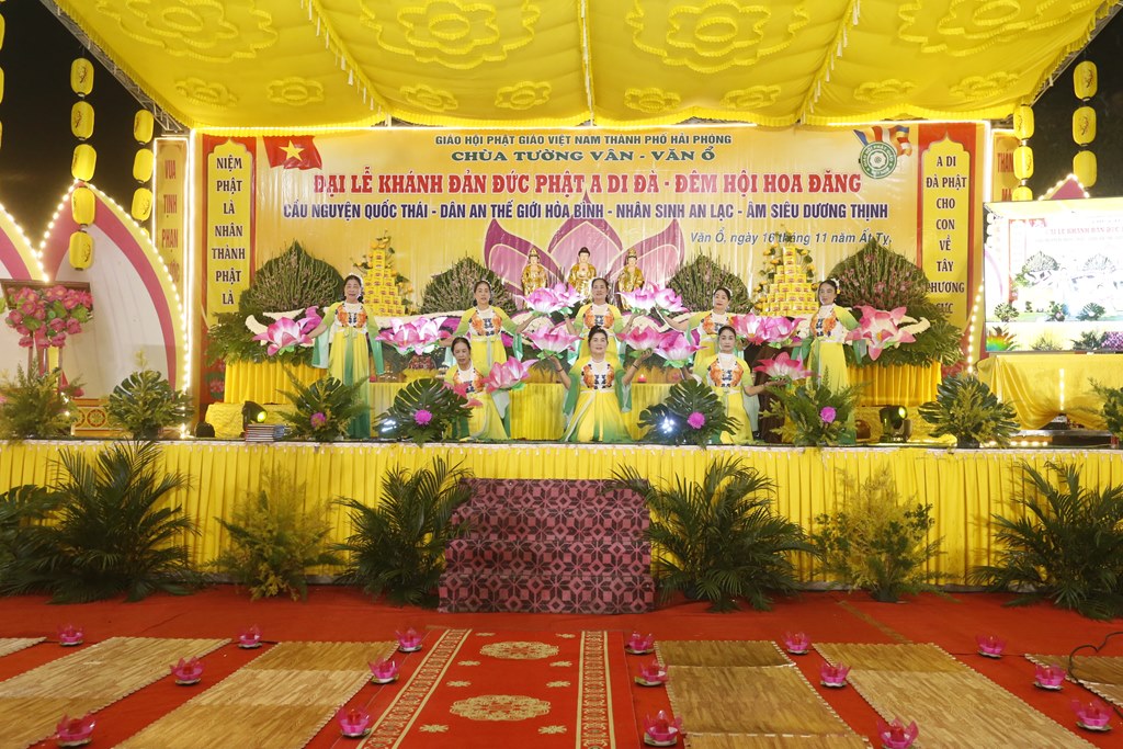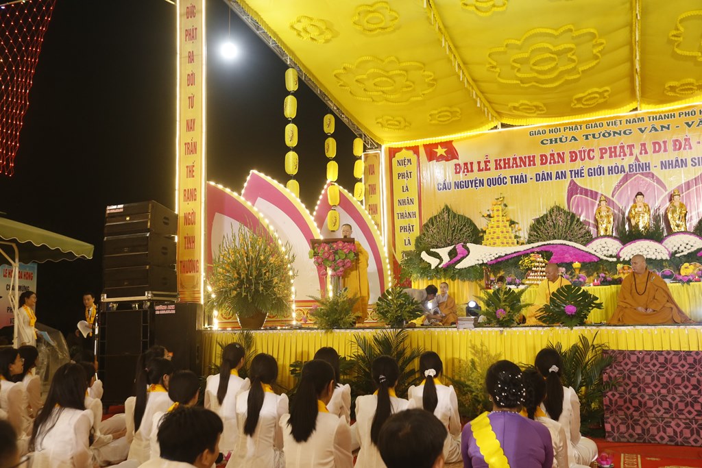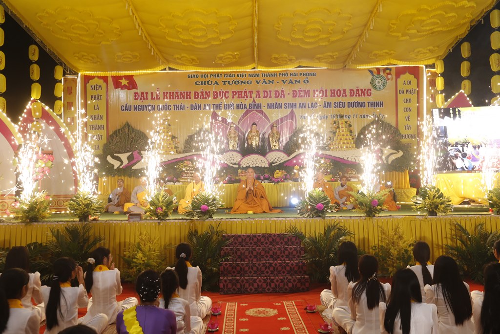 Buổi tối cùng ngày đã diễn ra đêm văn nghệ và Hoa đăng kính mừng khánh đản Đức Phật A Di Đà. Phát biểu khai mạc buổi lễ, Sư cô Thích Đàm Thảo đã lên phát biểu khai mạc nói lên ý nghĩa của ngày vía Đức Phật A Di Đà. Phật A Di Đà nguyên ngữ là Amitabha Buddha, với lòng thành tâm kính lễ của quý phật tử, là những người con Phật, chúng ta không thể quên ngày vía Đức Phật A Di Đà. Theo kinh Đại A Di Đà, về thời đức Phật Thế Tự Tại Vương ra đời có một vị quốc vương tên Kiều Thi Ca. Vua Kiều Thi Ca nghe Phật thuyết pháp liền bỏ ngôi vua xuất gia làm vị Tỳ kheo hiệu là Pháp Tạng, Ngài đảnh lễ Phật quỳ xuống chấp tay cầu Phật chứng minh và phát 48 lời nguyện. Nguyện lực này về sau trở thành Phật hiệu A Di Đà.