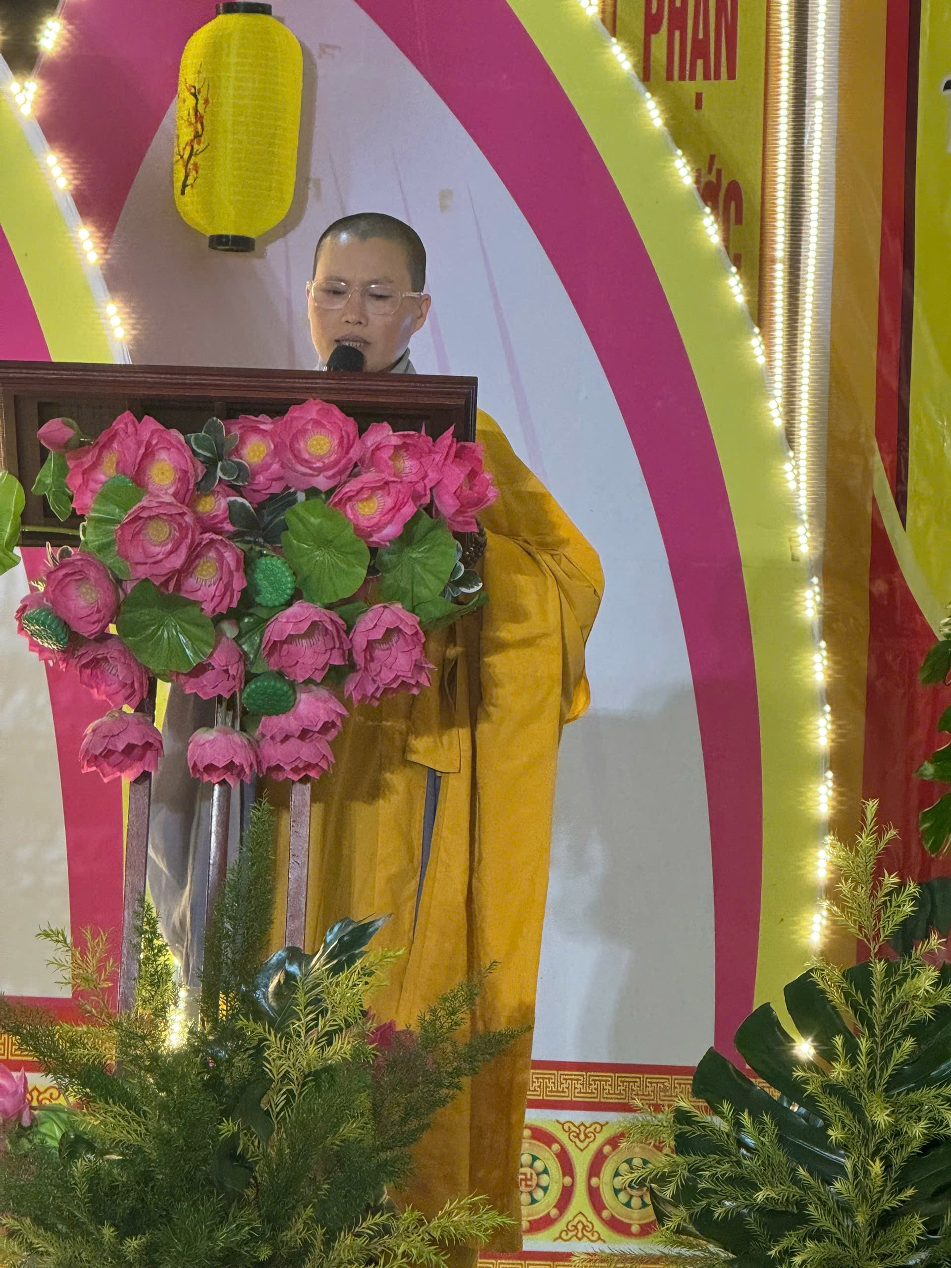 Sư cô Thích Đàm Thảo phát biểu khai mạc Đêm hoa đăng kính mừng khánh đản Đức Phật A Di Đà tại chùa Tường Vân