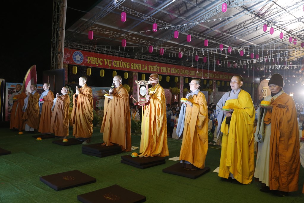Thời khắc linh thiêng của buổi lễ đã đến khi chư tôn đức chính thức cử hành nghi lễ dâng hương bạch Phật, ngọn hoa đăng đầu tiên được Thượng toạ chứng minh xin từ ban Phật rồi truyền sang cho chư tôn đức hiện tiền và toàn thể đại chúng. Ánh sáng của lòng từ bi và trí tuệ, tình thương và sự hiểu biết dần lan tỏa khắp đạo tràng, cầm ngọn hoa đăng trên tay, chắc hẳn các Phật tử sẽ ngộ ra rằng: “Sống trên cõi đời này, đêm tối vô minh còn dài lắm, nỗi thống khổ và những hệ lụy trần gian vẫn còn nhiều vô kể”. Trong khi đó, tất cả chúng ta vẫn đang là những kẻ bơ vơ, lạc lõng, ngụp lặn, trôi lăn trong sáu nẻo sinh tử luân hồi, nhưng nhờ có ánh sáng từ bi, ánh sáng trí tuệ và lòng bi mẫn của Đức Phật A Di Đà đã soi đường cho chúng ta, để chúng ta định hướng được đường về, biết có Tam Bảo mà nương tựa, biết được nơi mà mình cần phải tìm về, nơi mà ở đó sẽ không còn khổ đau, không còn sinh tử luân hồi. Đó chính là cõi Tây Phương Cực Lạc.