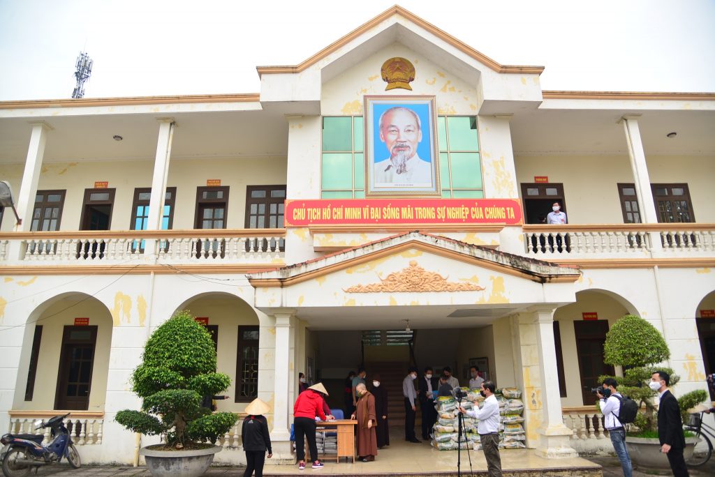 NS Thích Tâm Chính và đại diện chính quyền trao quà tại UBND phường Tràng Cát