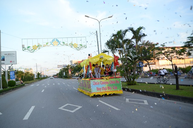 Xe hoa của đoàn Phật tử chùa Vẽ diễu hành qua cổng chùa