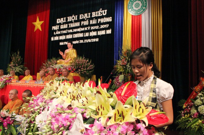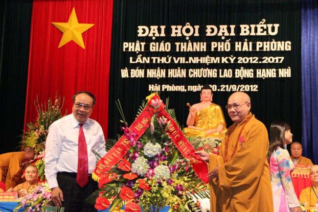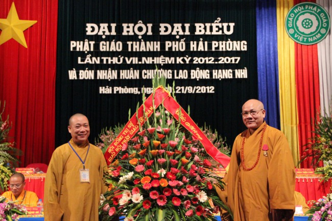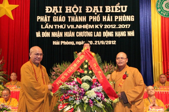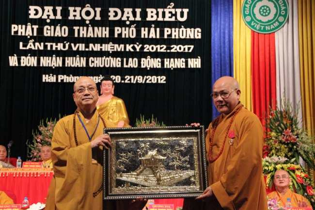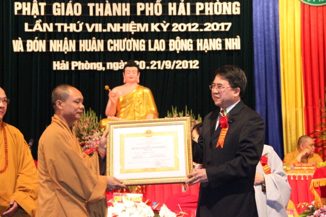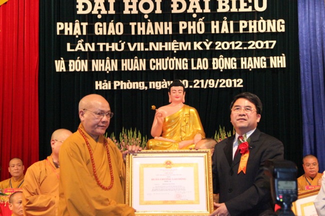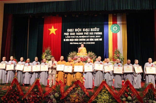 Tại Đại hội, Ông Lê Khắc Nam – Thành ủy viên, Phó chủ tịch UBND thành phố đã thay mặt Trung ương trao tặng huân chương lao động cho Hòa thượng Thích Quảng Mẫn và Thượng tọa Thích Quảng Tùng của Chủ tịch nước CHXHCNVN tặng và bằng khen của Thủ tướng chính phủ cho các cá nhân đã có nhiều thành tích trong nhiệm kỳ 2007 – 2012.