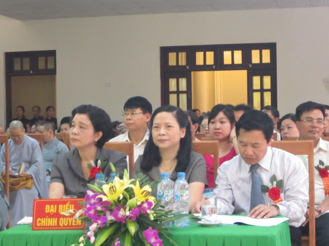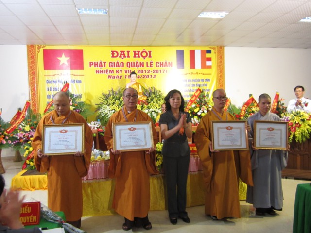 Bà: Phạm Thị Hải đại diện cho UBND đã công bố quyết định khen thưởng cho các tập thể và cá nhân Ban đại diện PG Quận Lê Chân nhiệm kỳ VI (2007 – 2012) và trao bằng khen cho các cá nhân và tập thể của Ban đại diện PG quận Lê Chân đã có thành tích xuất sắc đóng góp cho công tác Phật sự nhiệm kỳ 2007 – 2012.