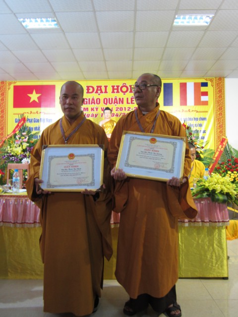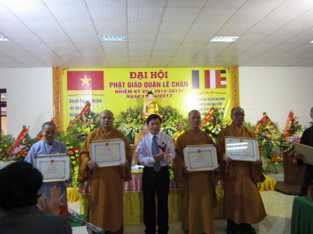 Đại diện cho Thành Hội PG TP Hải Phòng, TT. Thích Thanh Giác đã trao bằng tuyên dương công đức cho Ban đại diện PG quận Lê Chân nhiệm kỳ VI (2007 – 2012). ĐĐ Thích Tục Bách đã thay mặt cho Ban đại diện PG quận Lê Chân nhiệm kỳ VI (2007-2012) lên nhận bằng tuyên dương công đức.