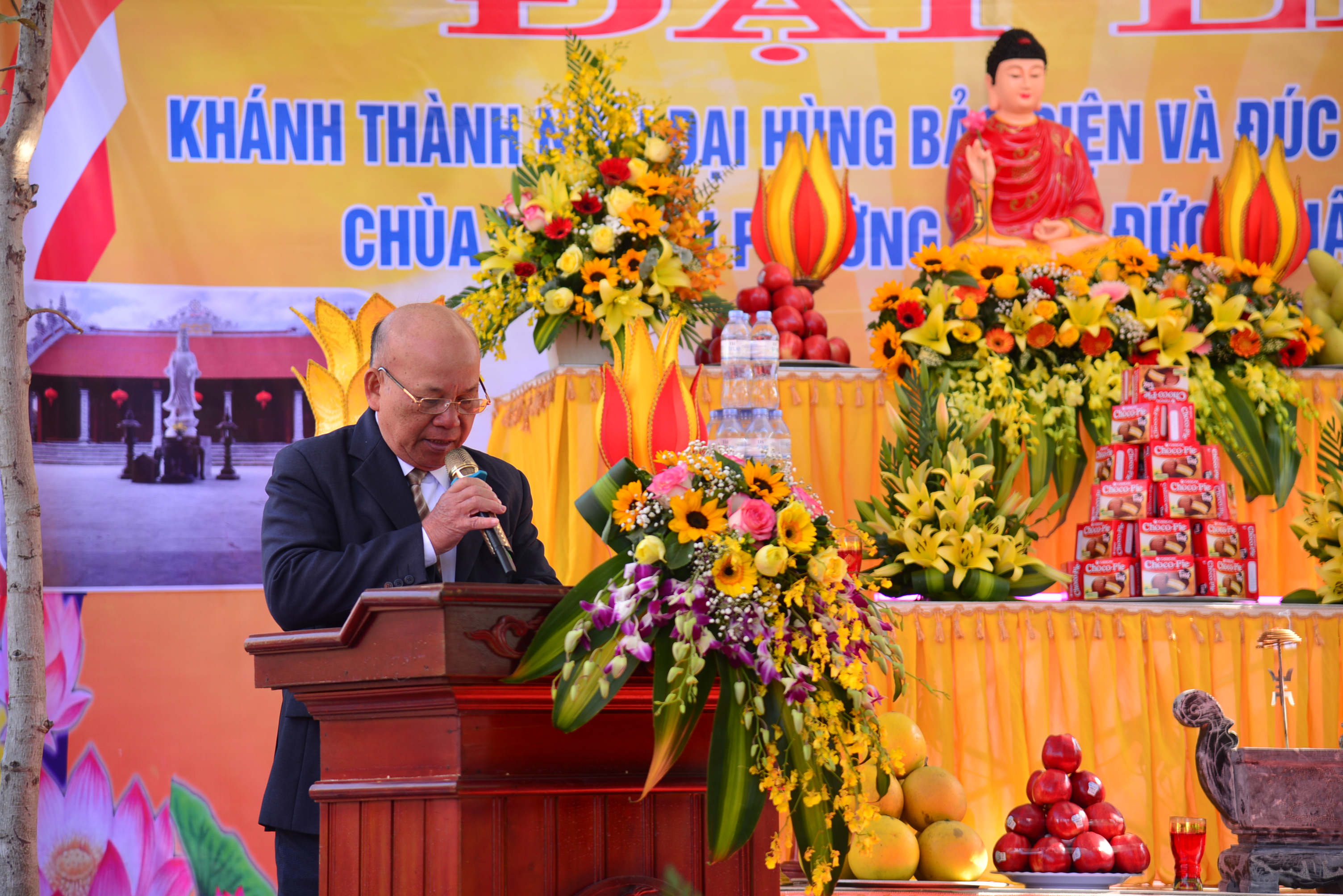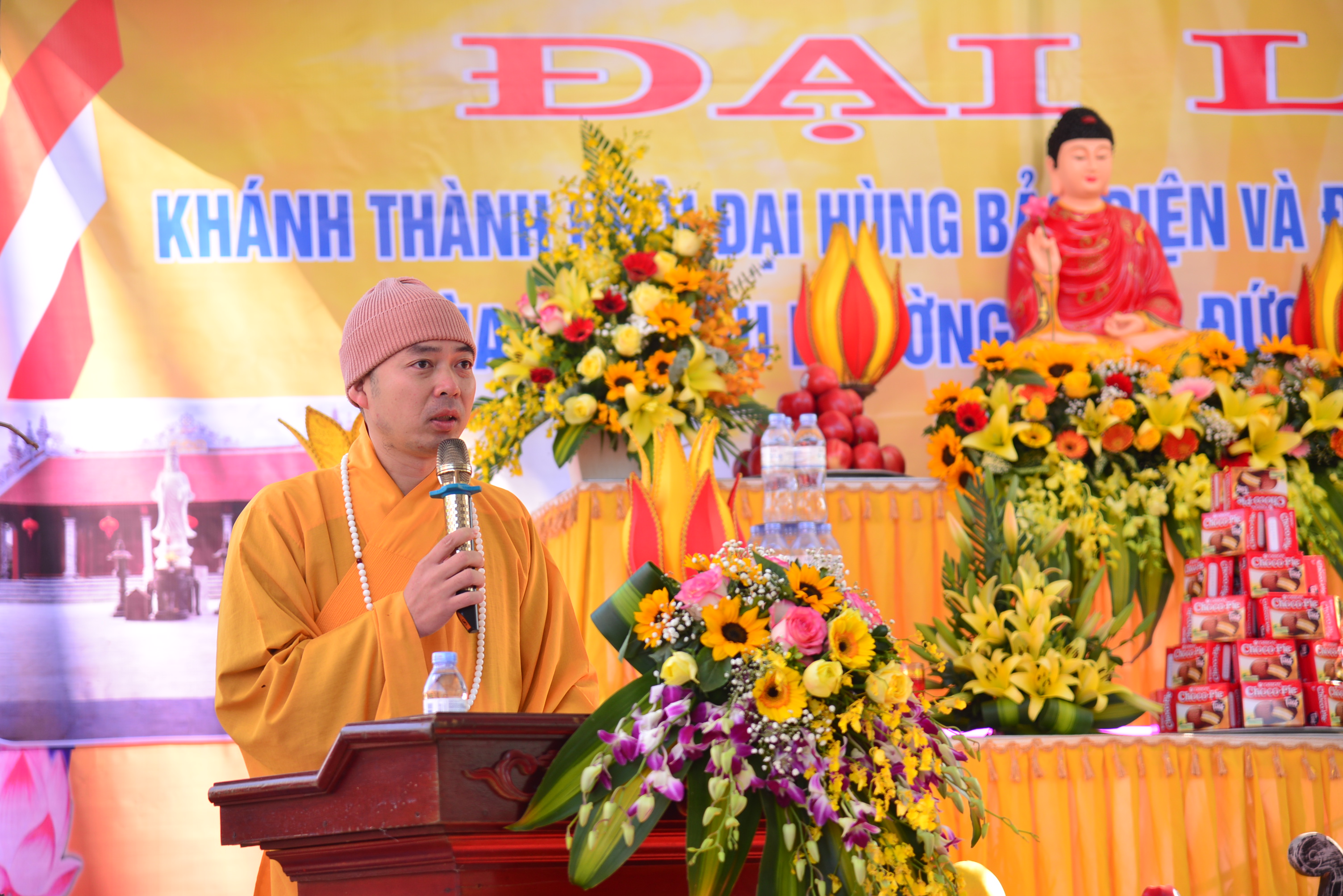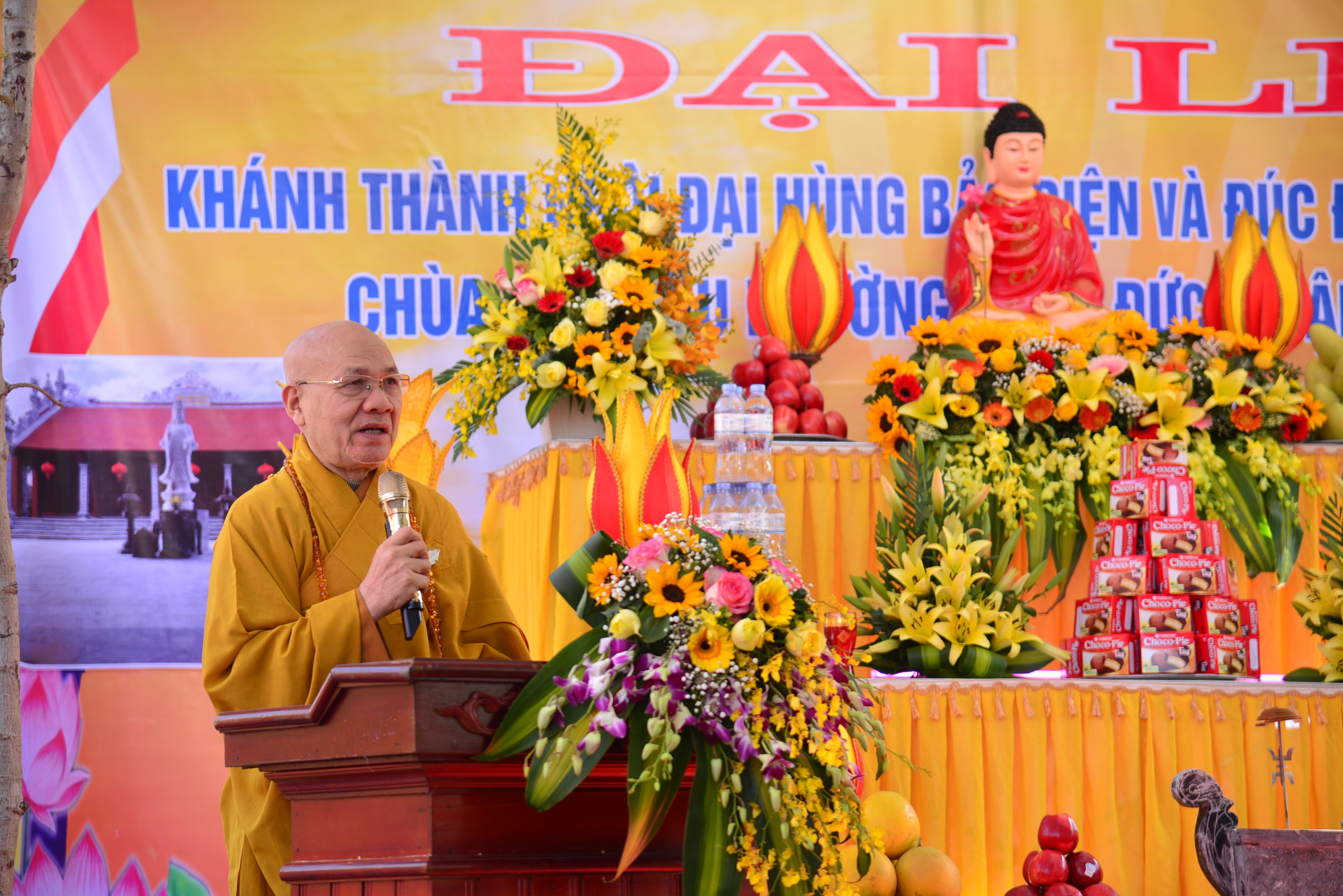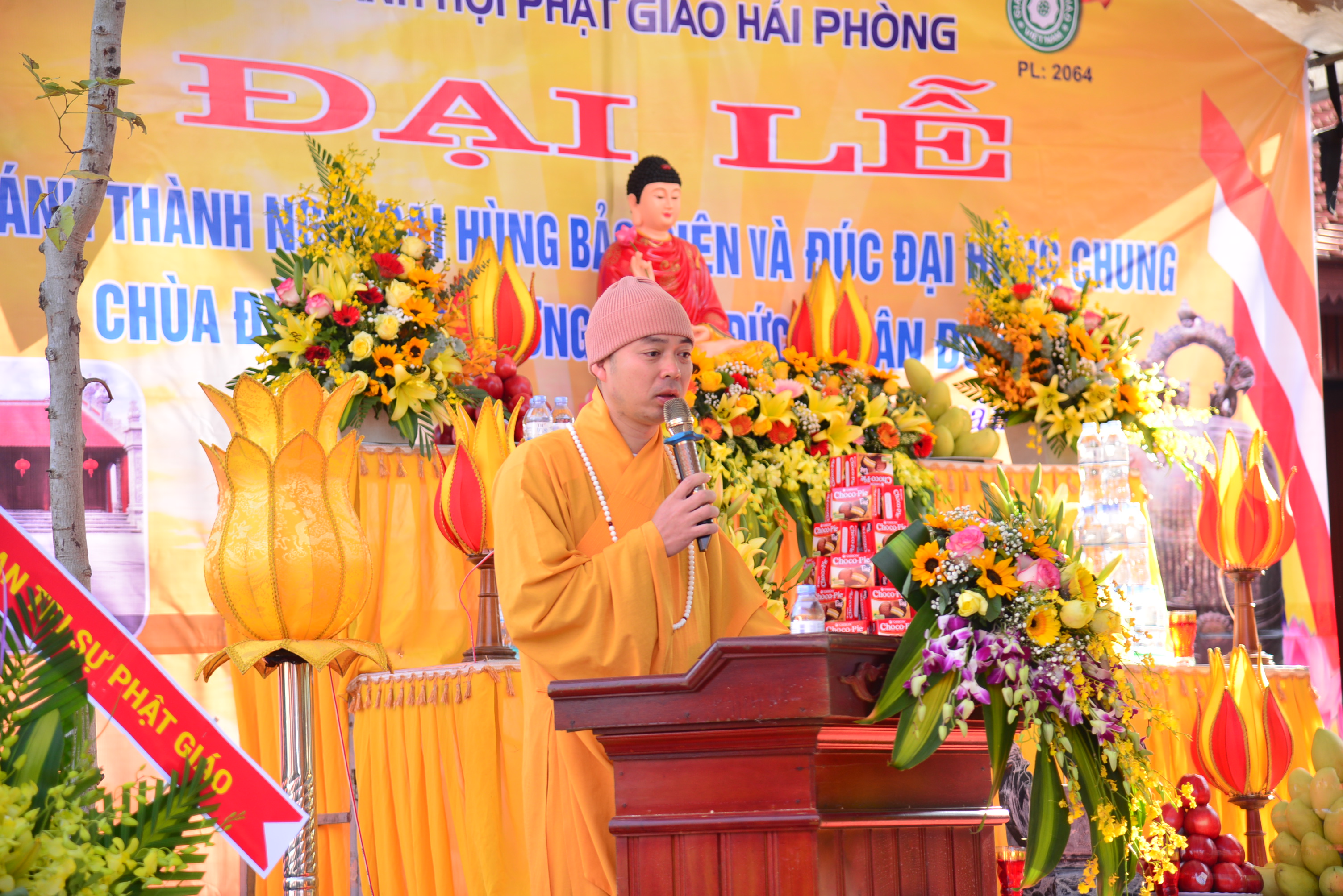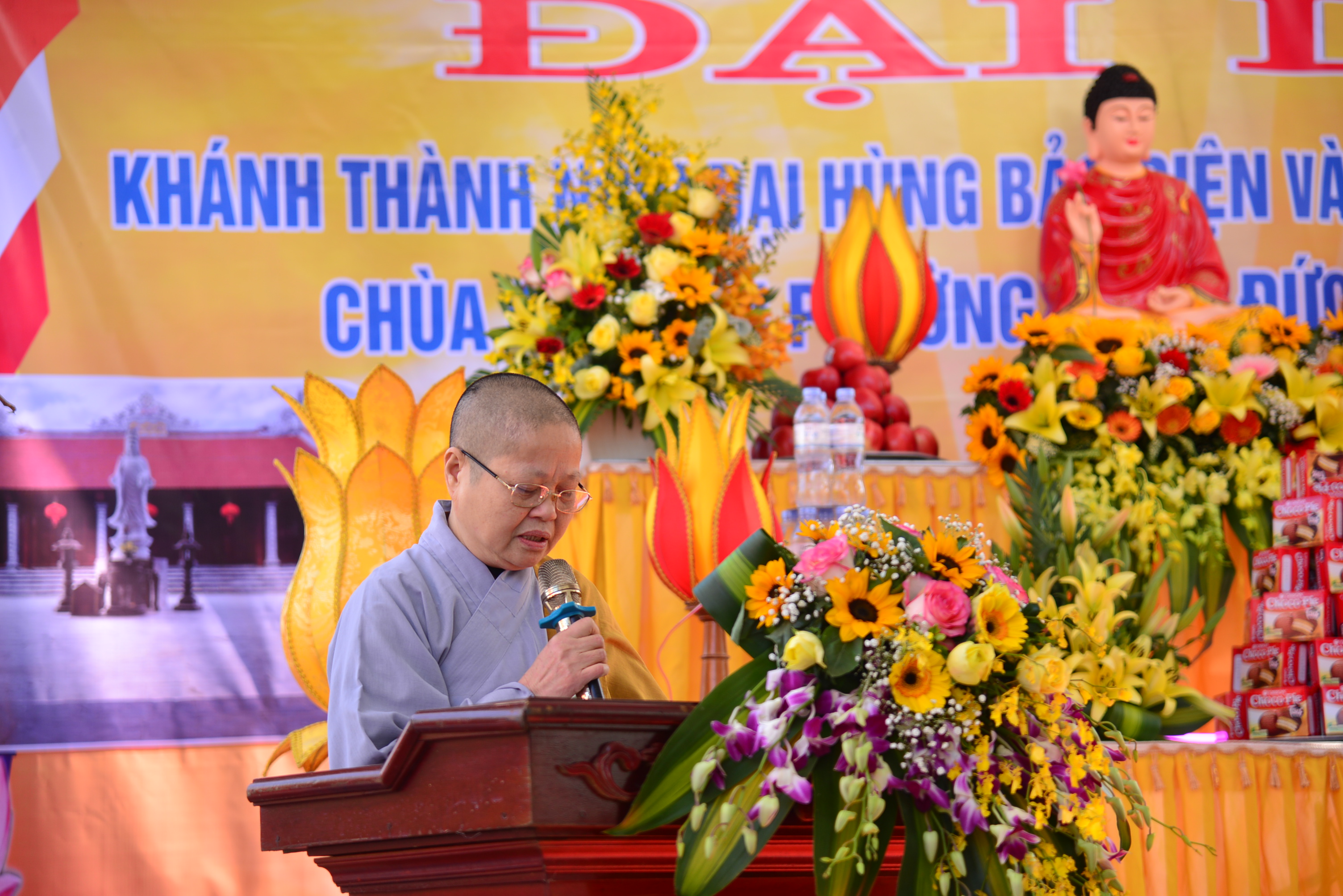 Ban đạo từ tại buổi lễ, Hòa thượng Thích Quảng Tùng – Phó chủ tịch HĐTS, trưởng BTS GHPGVN thành phố Hải Phòng đã tán thán công đức của Ni Sư trụ trì và công đức của chính quyền các cấp, Phật tử gần xa, các nhà hảo tâm, các mạnh thường quân, nhóm thợ mộc, thợ nề, các nghệ nhân và nhân dân địa phương đã công đức tài lực, sức lực, vật lực, người góp công, người góp của để phục dựng lại ngôi Đại Hùng Bảo Điện chùa Đức Hậu khang trang, tố hảo như ngày hôm nay. Từ nay Phật tử, nhân dân địa phương đã có nơi lễ bái, tu học, sinh hoạt tín ngưỡng, văn hóa, tâm linh vào mỗi dịp tuần rằm, lễ tết. Ngoài ra, Hòa thượng chứng minh cũng cùng đại chúng ôn lại lịch sử của ngôi chùa, công lao của chư vị Tổ Ni tiền bối đã có công tạo dựng lại ngôi già lam, cũng như đóng góp vào công cuộc hoẳng dương chính pháp, làm lợi lạc quần sinh. Ngoài ra, Hoà thượng còn nói lên công đức của việc xây chùa, tạo tượng, đúc chuông và vai trò của ngôi chùa, ý nghĩa của việc đúc đại hồng chung đối với đời sống văn hóa, tâm linh của người dân nước Việt. Hoà thượng hy vọng, trong thời gian tới các Phật tử, các nhà hảo tâm, các mạnh thường quân, những người con xa quê tiếp tục phát tâm công đức xây dựng những hạng mục công trình phụ trợ còn lại như lầu chuông, gác trống…