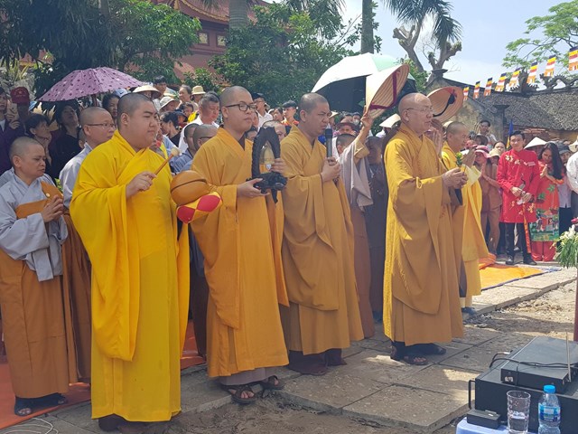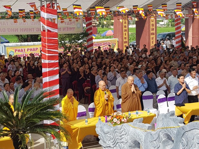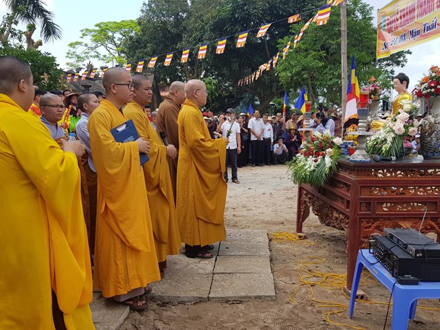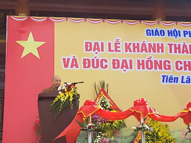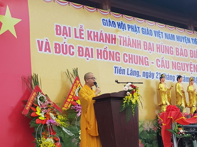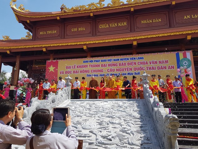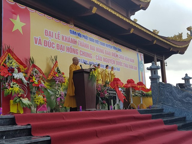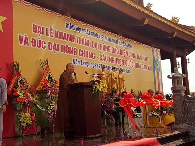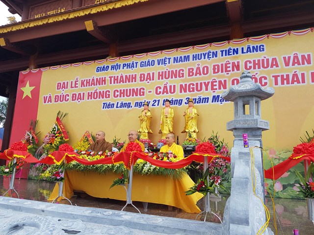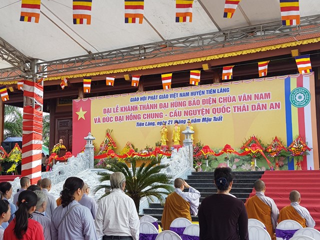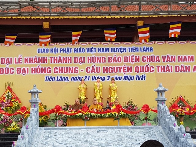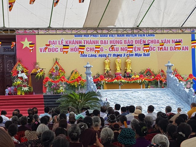 Nhân dịp này, Hòa thượng Thích Quảng Tùng – Phó chủ tịch HĐTS TƯ GHPGVN đã ban đạo từ tán thán công đức của Ban trị sự GHPGVN huyện Tiên Lãng, đặc biệt để có được ngôi Đại hùng Bảo điện khang trang, tố hảo như ngày hôm này đó là phần lớn nhờ vào sự phát tâm cúng dàng của đồng chí: Nguyễn Văn Đọc – Bí thư tỉnh ủy, chủ tịch HĐND tỉnh Quảng Ninh, đồng chí đã luôn sát cánh cùng BTS GHPGVN huyện Tiên Lãng và chính quyền địa phương sở tại để xây dựng ngôi Đại hùng Bảo điện chùa Vân Nam diễn ra theo đúng tiến độ và đúng kế hoạch đã đề ra. Hòa thượng chứng minh đã tán thán công đức của đồng chí Nguyễn Văn Đọc. Đồng thời, hòa thượng cũng đã nói lên công đức của việc xây chùa, đó là là một trong ba việc lớn mà mỗi người Phật tử chúng ta nên làm theo như lời các bậc cổ đức đã chỉ dạy. Hòa thượng cũng hy vọng, sau khi Chùa Vân Nam được đưa vào sử dụng, sẽ là nơi tu học, sinh hoạt tín ngưỡng văn hóa tâm linh của nhân dân địa phương và các Phật tử huyện Tiên Lãng. Công trình xây dựng chùa Vân Nam cũng là một công trình lớn thiết thực chào mừng những ngày lễ lớn trong tháng 5 lịch sử và kỷ niệm 63 năm giải phóng Hải Phòng ( 13/5/1955 – 13/5/2018).