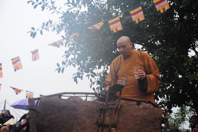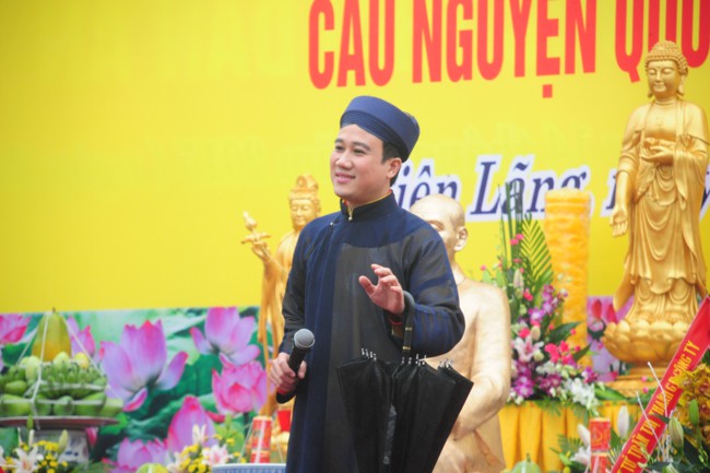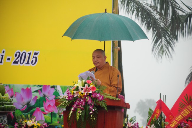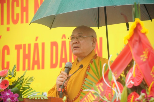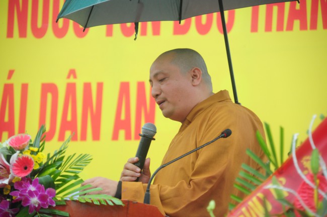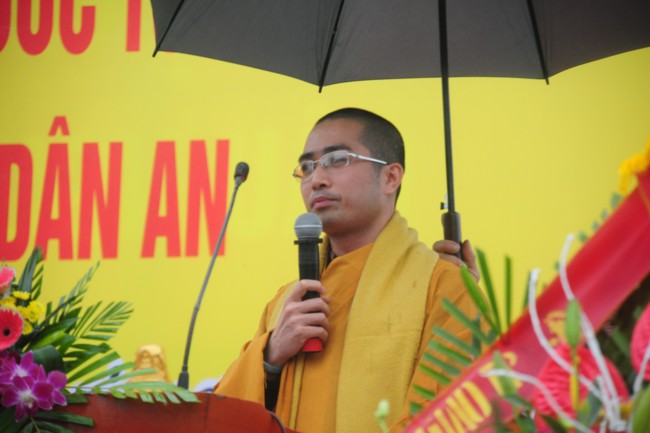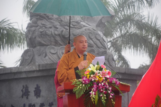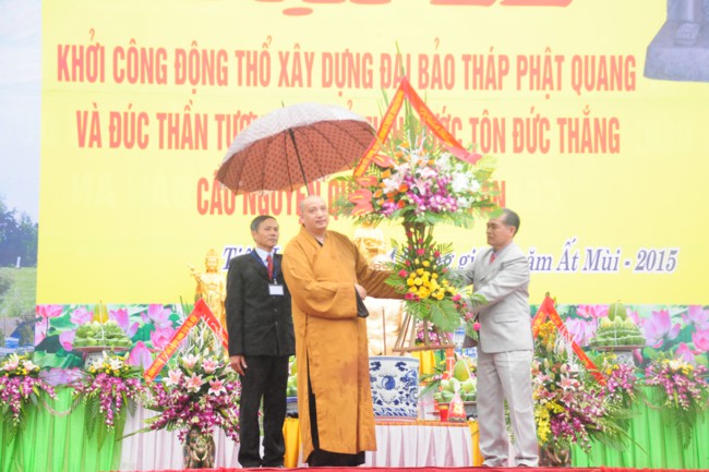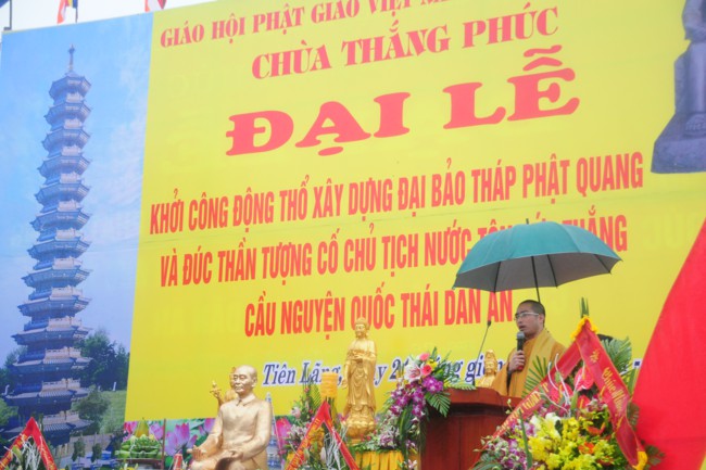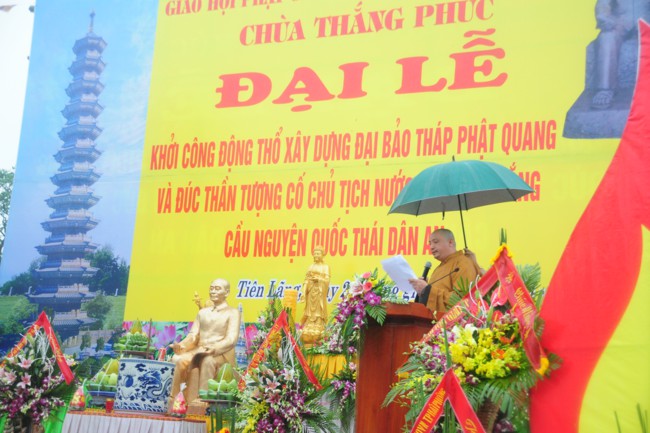 Sau nghi thức niệm Phật cầu gia bị, chào Quốc kỳ, đạo kỳ, một phút nhập từ bi quán để tưởng nhớ tới công ơn của Chư lịch đại Tổ Sư, các vị lãnh đạo tiền bối hữu công đã hy sinh qua các thời kỳ, Đại đức Thích Quảng Minh – Trụ trì tổ đình Thắng Phúc, Trưởng BTC đã lên tuyên đọc Diễn văn khai khai mạc Đại lễ khởi công động thổ xây dựng đại bảo tháp Phật Quang và đúc tượng cố chủ tịch nước Tôn Đức Thắng.