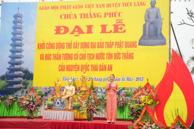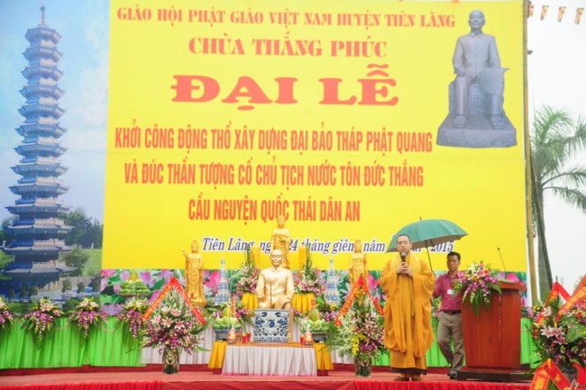 Nhân dịp này, Hòa Thượng Thích Quảng Tùng – Phó chủ tịch HĐTS TƯ GHPGVN, trưởng BTS GHGPVN Tp. Hải Phòng đã ban đạo từ tán thán công đức của BTS GHPGVN huyện Tiên Lãng, đặc biệt là tán thán công đức của Đại Đức Thích Quảng Minh – Trưởng BTS GHPGVN huyện Tiên Lãng cũng như các mạnh thường quân, các nhà hảo tâm, quý Phật tử đã đóng góp công sức, tiền của cho việc xây dựng 2 công trình tầm vóc, mang ý nghĩa tâm linh này. Đồng thời, Hòa thượng chứng minh cũng cho quý Phật tử, quý thiện nam, tín nữ hiểu về tầm quan trọng của việc xây tháp cũng như công đức của việc xây dựng, tôn tạo tháp Phật. Theo đó, việc xây dựng, tôn tạo tháp Phật có công đức rất lớn, công đức đó ngang với việc xây chùa bởi trước kia không có chùa chỉ có tháp thì tháp đó được coi như là một ngôi chùa như chúng ta thấy hiện nay. Đặc biệt, Hòa Thượng Thích Quảng Tùng đã gửi lời tri ân tới gia đình bà Trần Thị Thành – Một vị đại thí chủ đã đóng góp rất nhiều tiền của cho công trình xây dựng chùa Thắng Phúc cũng như công trình xây dựng bảo tháp Phật Quang và công trình Đền thờ cố chủ tịch nước Tôn Đức Thắng tại huyện Tiên Lãng, Hải Phòng.