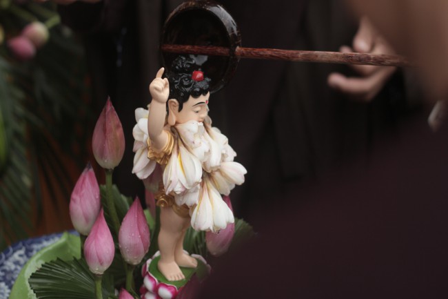 Thời khắc linh thiêng và mong đợi nhất của các Phật tử đã đến khi TT. Thích Tục Bách cử hành nghi lễ tắm Phật, Thượng tọa đã múc gáo nước đầu tiên để cúng dàng lên tôn tượng của Đức Phật Thích Ca Mâu Ni sơ sinh và nhắc nhở các Phật tử khi tắm Phật cần phải giữ tâm ý trong sạch, gột rửa tất cả những phiền não, tham, sân si, mạn nghi, đố kỵ và thực hành theo giáo pháp của Đức Phật đã chỉ bày cách đây hơn 2000 năm.