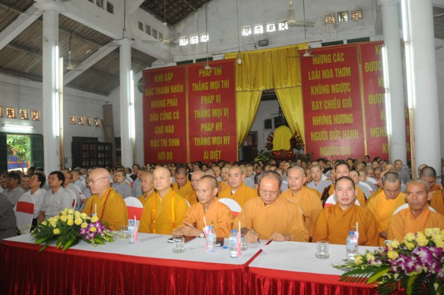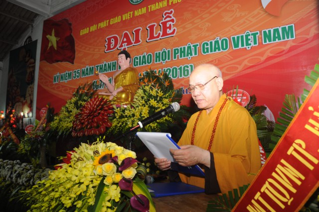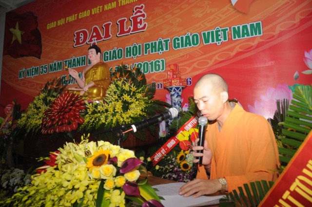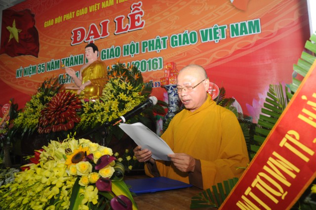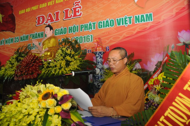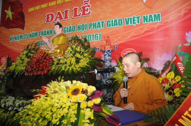 Tại buổi lễ, toàn thể đại hội đã trang nghiêm, thành kính đứng dậy để lắng nghe bức thông điệp Kỷ niệm 35 năm thành lập Giáo hội Phật Giáo ViệtNamcủa đức Pháp chủ GHPGVN – Thích Phổ Tuệ do Hòa thượng Thích Quảng Tùng tuyên đọc. Ngày 7/11/1981 là một sự kiện lịch sử trọng đại mang đầy ý nghĩa đối với Tăng Ni, Phật tử ViệtNam. Đó là ngày các tổ chức, hệ phái Phật giáo trong cả nước nhất tâm thành lập ngôi nhà chung của GHPGVN. Trong suốt chặng đường 35 năm GHPGVN trưởng thành và phát triển đã đạt được rất nhiều thành tựu to lớn trong sự nghiệp hoằng dương chính pháp. Sau 35 năm, tổ chức giáo hội đã được thành lập ở tất cả 63 tỉnh, thành. Điều này khẳng định được vị thế của Phật giáo Việt Nam trong cộng đồng Phật giáo Quốc tế.