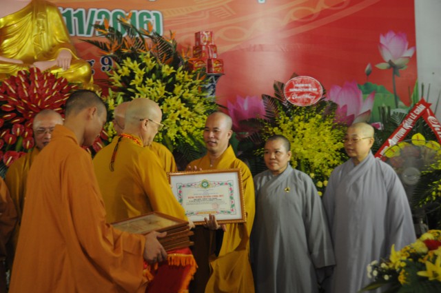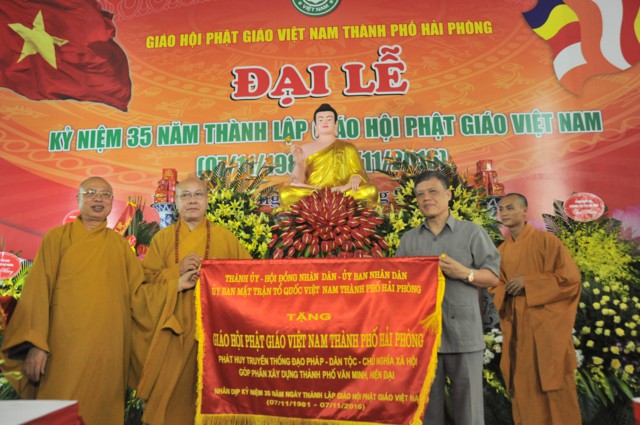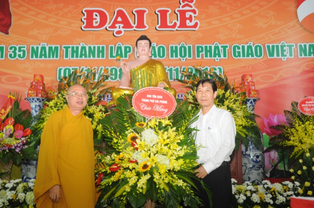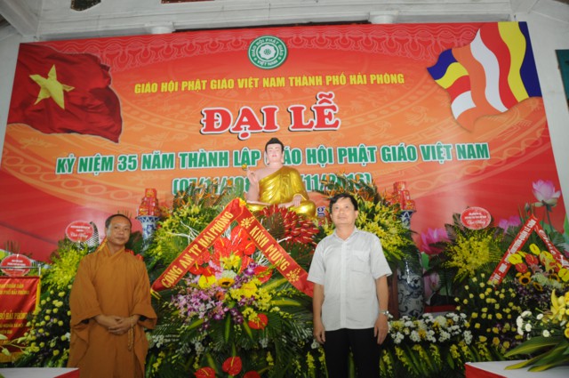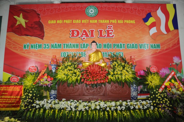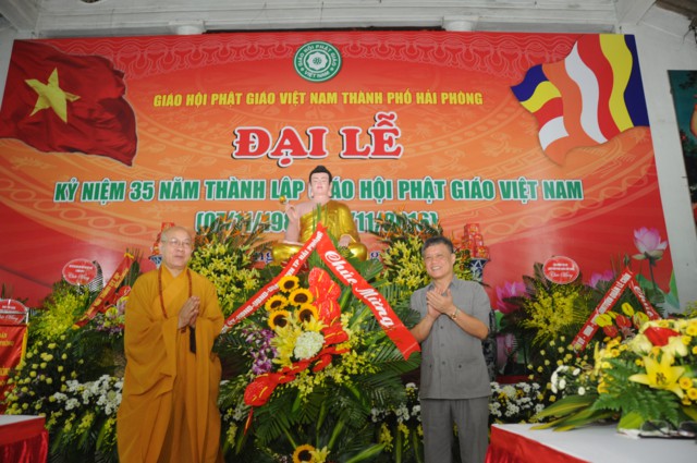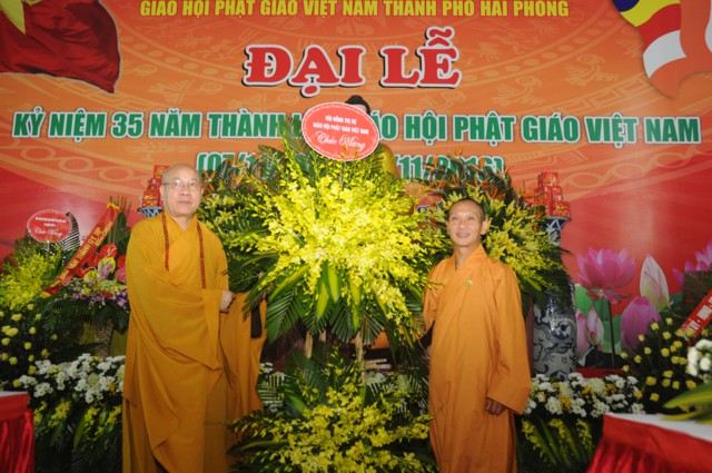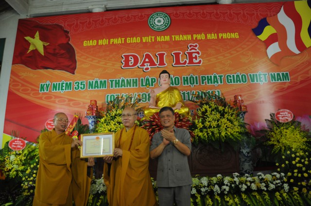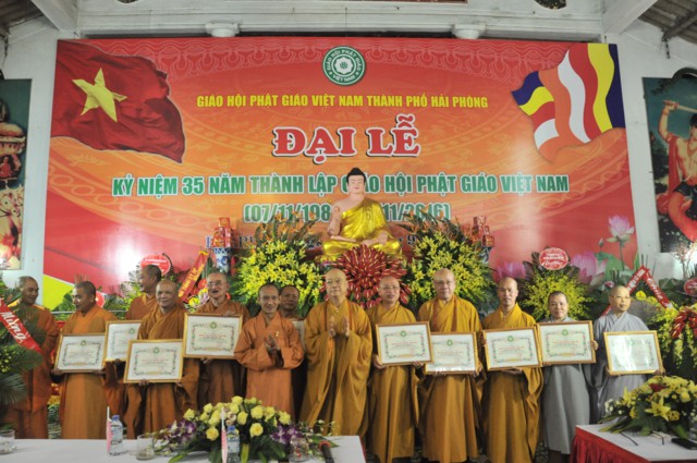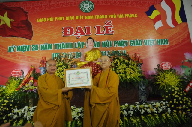 Nhân kỷ niệm 35 thành lập Giáo hội Phật giáo Việt Nam, Ban trị sự GHPGVN thành phố Hải Phòng đã vinh dự đón nhận bức trướng và bằng khen của Thành Ủy, HĐND, UBND, UB MTTQVN thành phố Hải Phòng và các tập thể và cá nhân có thành tích trong các hoạt động Phật sự của thành phố đã hoan hỷ đón nhận bằng tuyên dương công đức của HĐTS TƯ GHPGVN trao tặng.