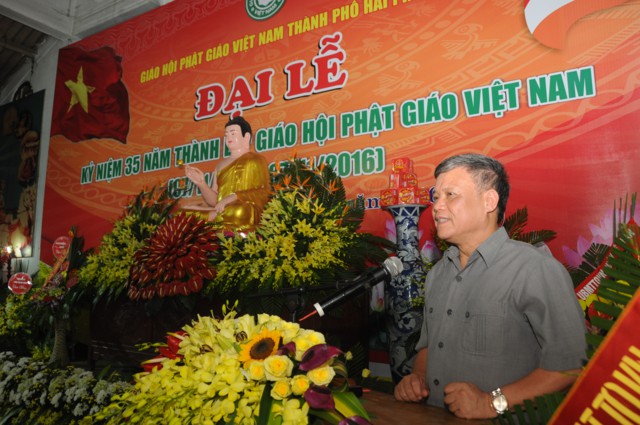 Trước khi kết thúc buổi lễ, đại diện cho các cấp lãnh đạo của thành phố Hải Phòng, ông: Nguyễn Xuân Bình – Ủy viên thường vụ thành ủy, phó chủ tịch UBND thành phố Hải Phòng đã có bài phát biểu rất ý nghĩa nói lên vai trò của Phật giáo đối với vận mệnh của Dân tộc và Đất nước. Ông đánh giá cao những thành tựu đã đạt được của GHPGVN trong suốt 35 năm vừa qua dưới ngôi nhà chung của Phật giáo ViệtNam, bày tỏ lòng biết ơn của các cấp chính quyền thành phố Hải Phòng đối với GHPGVN thành phố Hải Phòng. Đặc biệt là trong công cuộc phụng sự đạo pháp, phụng sự Tổ Quốc và Dân tộc. Ông khẳng định rằng: Đất nước có được phát triển vững mạnh hay không đó là một phần nhờ vào công sức đóng góp củaChưtôn đức Tăng Ni, đồng bào tín đồ Phật tử. Nhân dịp này, ông cũng gửi lời chúc tới chư tôn đức Tăng Ni lãnh đạo GHPGVN nói chung và chư tôn đức Tăng Ni, đồng bào Phật tử của thành phố Hải Phòng nói riêng, vô lượng an lạc, vô lượng cát tường và hy vọng Phật giáo sẽ ngày càng phát triển, luôn đồng hành cùng Dân tộc và Đất nước, phát huy truyền thống hộ Quốc an dân, sống tốt đạo, đẹp đời theo đúng phương châm của Giáo hội đã đề ra: ” Phật giáo luôn đồng hành cùng Dân tộc”.