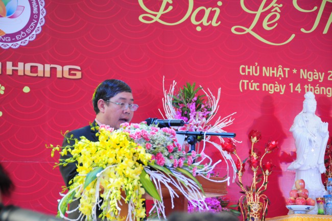 Tại buổi lễ, ông: Hoàng Trung Hiếu – Phó chủ tịch UBND quận Đồ Sơn lên phát biểu khẳng định lại giá trị văn hóa, tâm linh của chùa Hang. Đồng thời tán thán công đức của Thượng tọa Thích Thanh Giác – Trụ trì chùa Hang và Đại đức Thích Giác Hiệu trong năm vừa qua đã cùng Phật tử, nhân dân, chính quyền địa phương tổ chức rất nhiều chương trình Phật sự có ý nghĩa. Đặc biệt là trong dịp tết Bính Thân 2016 vừa qua, chư tăng chùa Hang cùng các Phật tử, các nhà hảo tâm đã tổ chức chương trình từ thiện mang tên “ Xuân Yêu Thương”, chương trình đã tặng 1,200 phần quà cho người nghèo, các gia đình chính sách khó khăn, người tàn tật, người già neo đơn, trẻ em nghèo vượt khó…Ông cũng mong muốn chư tăng chùa Hang tiếp tục phát huy những kết quả đã đạt được và thực hiện tốt phương châm “ Đạo Pháp – Dân tộc – Chủ nghĩa xã hội” của GHPGVN đã đề ra, chấp hành tốt các quy định của địa phương, vận động tín đồ, Phật tử tích cực tham gia các phong trào, các hoạt động văn hóa, xã hội do địa phương tổ chức…góp phần xây dựng một nền văn hóa Việt Nam tiên tiến, đậm đà bản sắc Dân tộc.