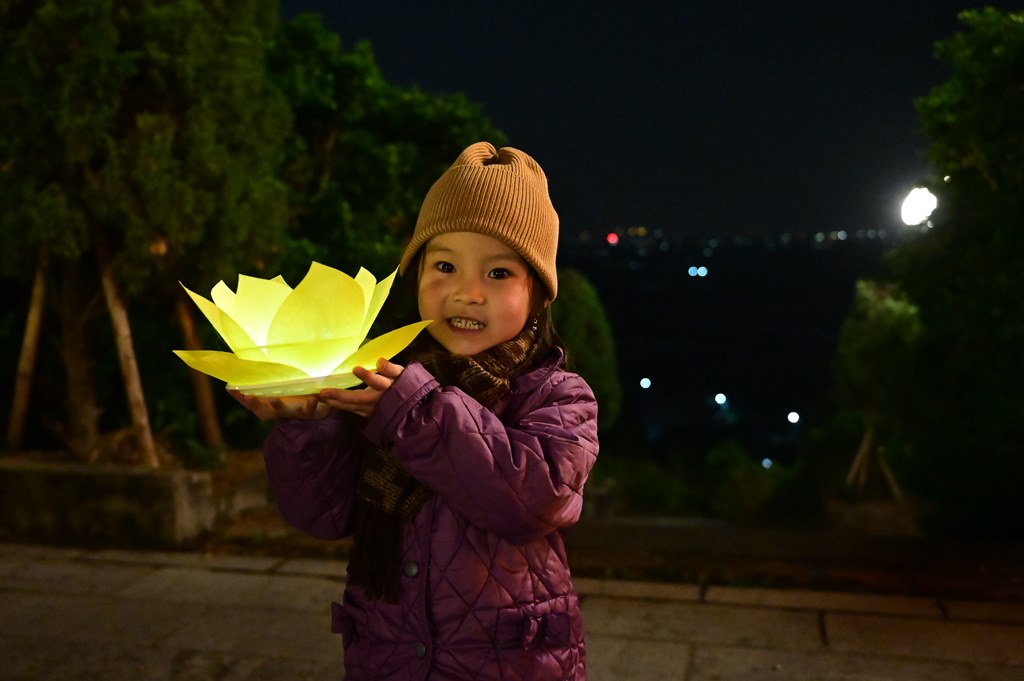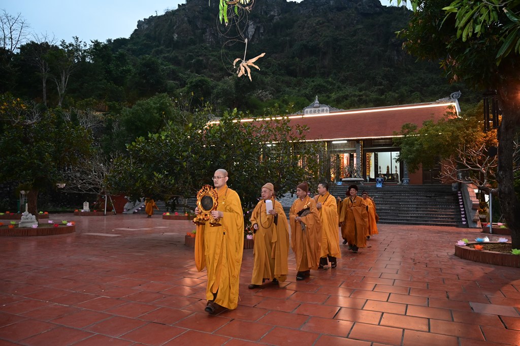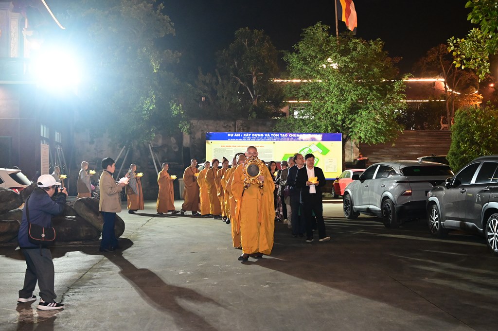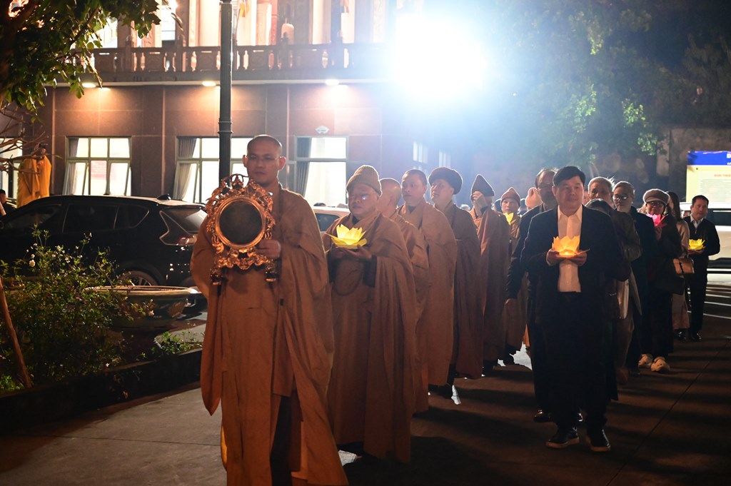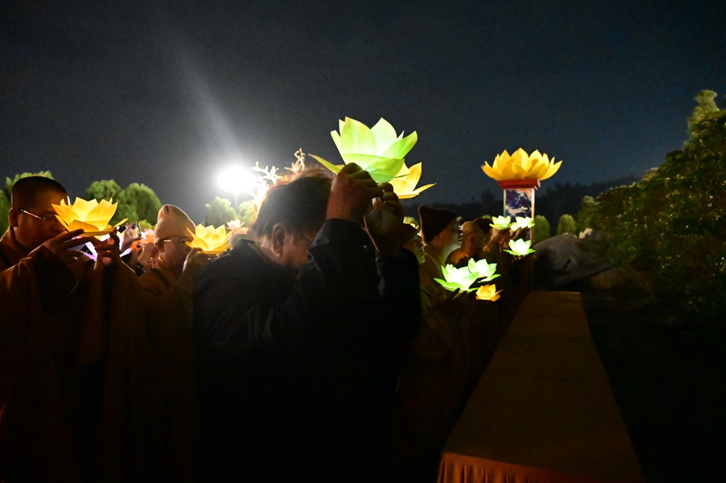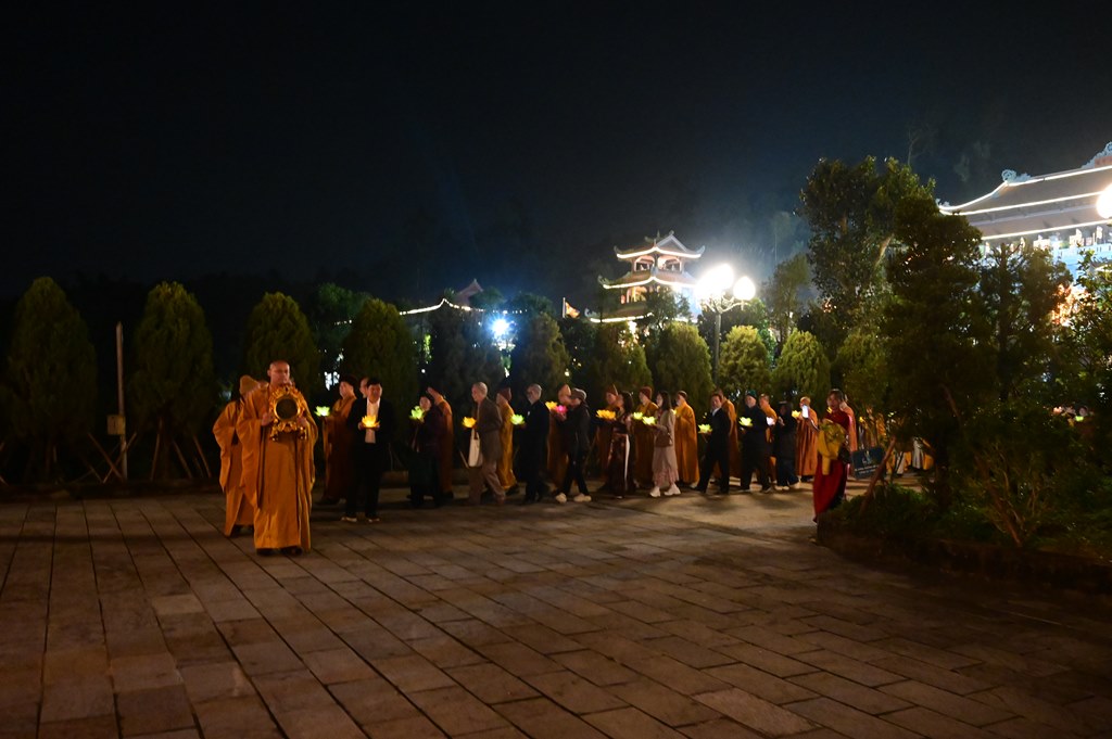 Chư tôn đức và toàn thể đạo tràng rước hoa đăng và niệm danh hiệu Đức Phật A Di Đà