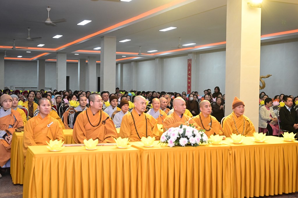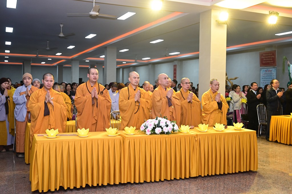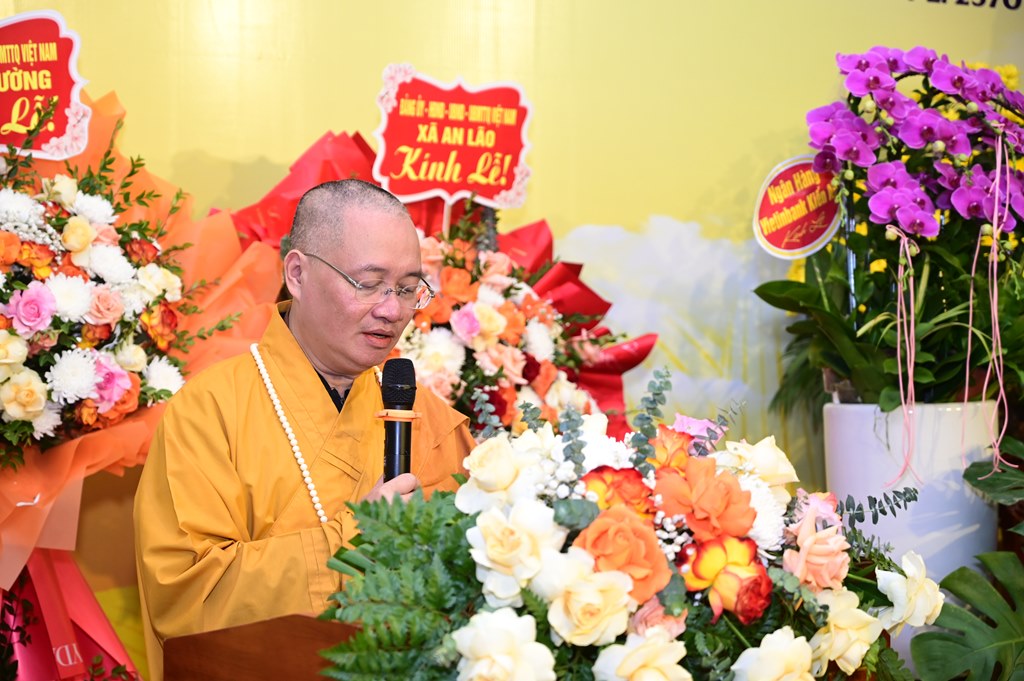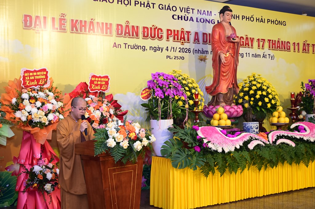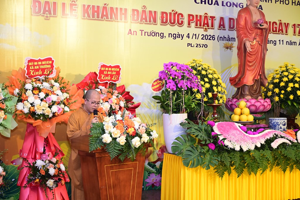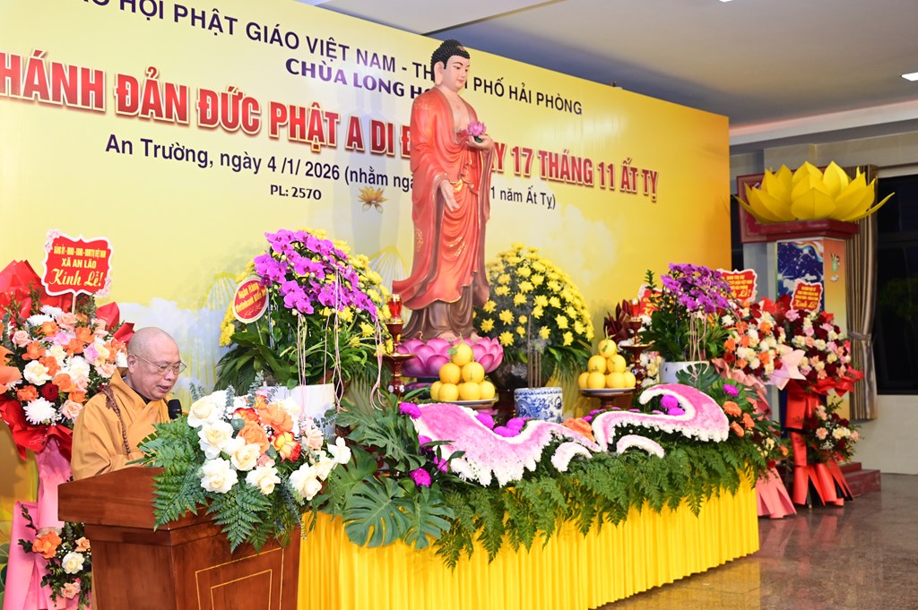 Tiếp đó, Thượng tọa Thích Thanh Lợi, Phó ban kiêm Chánh thư ký Ban nghi lễ TƯ GHPGVN, trưởng Sơn môn Linh Quang Trà Lũ Trung đã lên cung tuyên Lược sử Đức Phật A Di Đà và ý nghĩa của pháp môn tu niệm Phật. A Di Ðà là dịch âm chữ Amita. Hán dịch nghĩa là Vô lượng Thọ và Vô lượng Quang. Vô lượng Thọ nghĩa là tuổi sống lâu không có số lượng; Vô lượng Quang, là Ngài có hào quang sáng suốt không lường. Đức Phật Thích Ca nói: “ “Ðời quá khứ lâu xa, cách hơn 10 kiếp, có một nước tên là Diệu Hỷ, vua cha là Nguyệt Thượng Luân Vương, mẹ là Thù Thắng Diệu Nhan. Vương hậu sinh ra 3 người con: người con trưởng là Nhật Nguyệt Minh, người con thứ hai là Kiều Thi Ca, người con thứ ba là Nhật Ðế Chúng. Khi ấy có Đức Phật ra đời hiệu là Thế Tự Tại Vương Như Lai. Kiều Thi Ca bỏ ngôi vinh quí theo Phật Thế Tự Tại xuất gia, thọ Kỳ kheo giới, Phật cho hiệu là Pháp Tạng Tỳ kheo. Ngài Pháp Tạng đối trước Phật, pháp 48 lời nguyện rộng lớn, độ khắp tất cả mười phương chúng sinh; nếu có một nguyện nào chẳng viên mãn, thì Ngài thề chẳng thành Phật”.