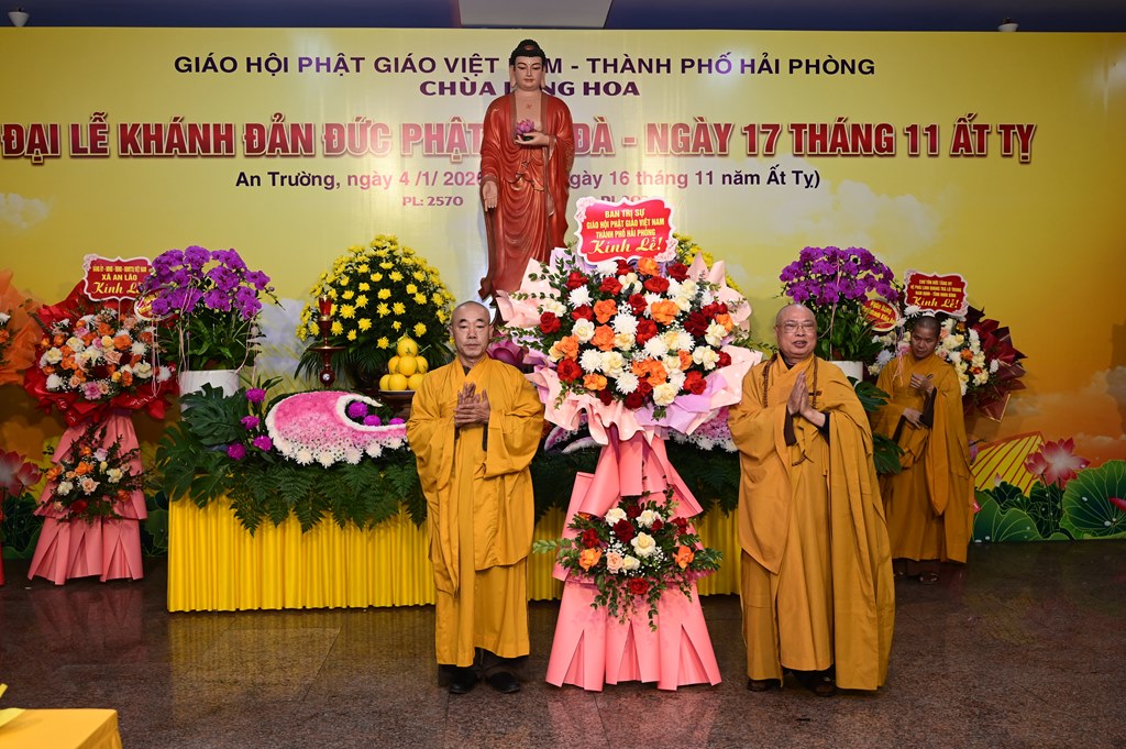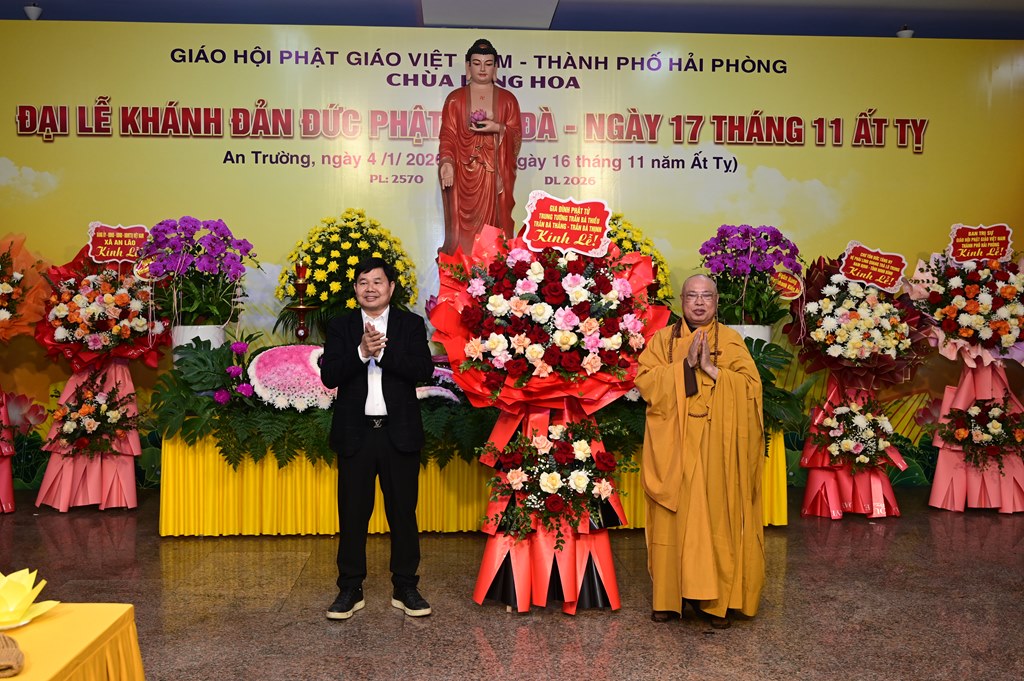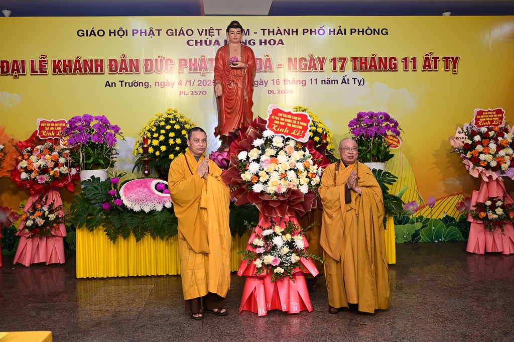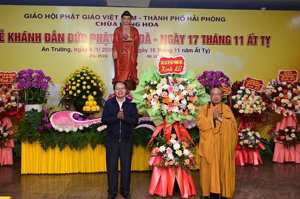 Hòa thượng Thích Thanh Giác đón nhận lẵng hoa chúc mừng của Ban trị sự GHPGVN thành phố Hải Phòng