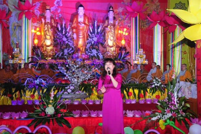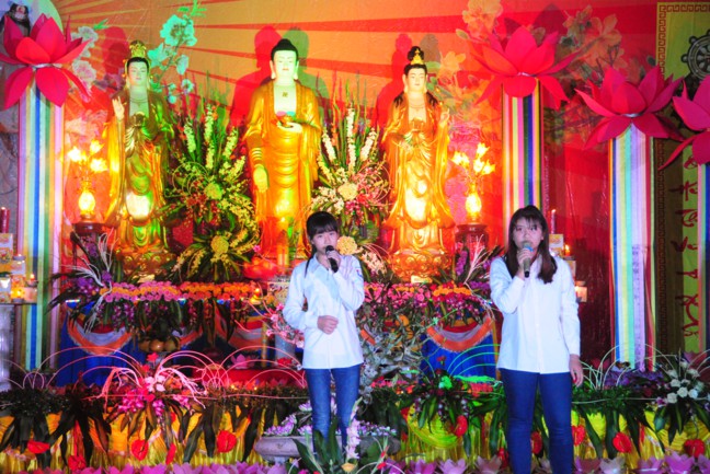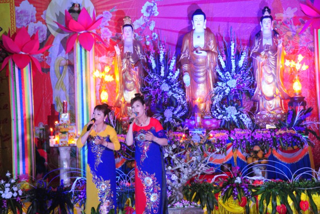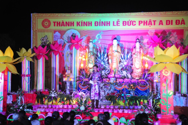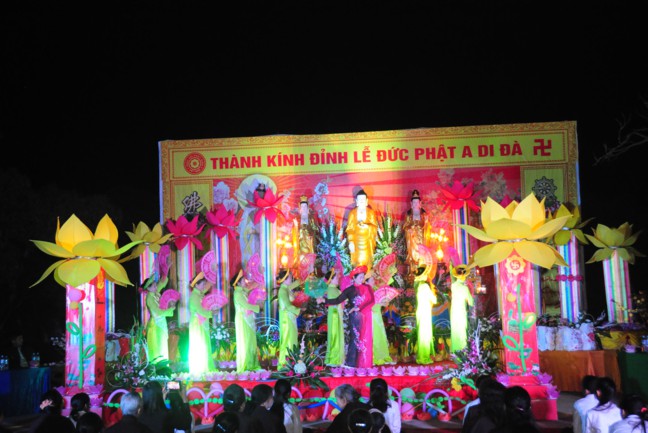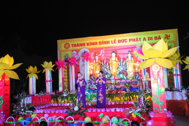 Trước khi chính thức bước vào buổi lễ Hoa đăng mừng khánh đản đức Phật A Di Đà là các tiết mục văn nghệ cúng dàng lên Đức Phật A Di Đà, mười phương Chư Phật do các Phật tử đang tu học, sinh hoạt tại một số chùa trên địa bàn huyện Kiến Thụy và chùa Hòa Liễu thể hiện với những ngôn từ Phật giáo trong sáng ca ngợi công hạnh của Chư Phật và Bồ Tát, ca ngợi tình yêu quê hương Đất nước.