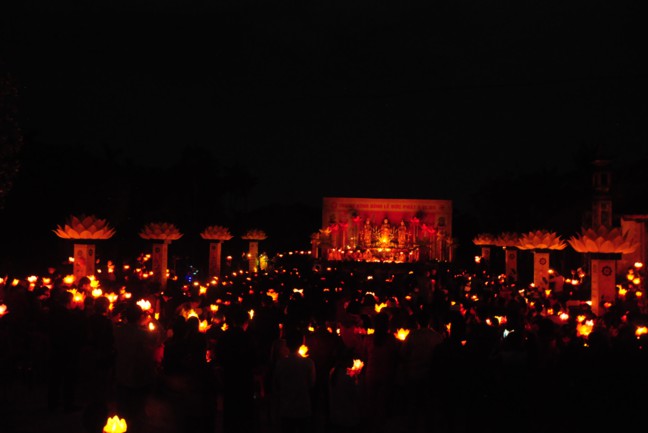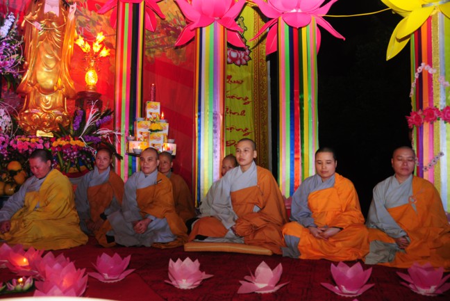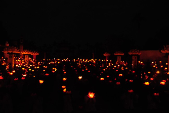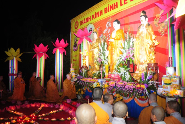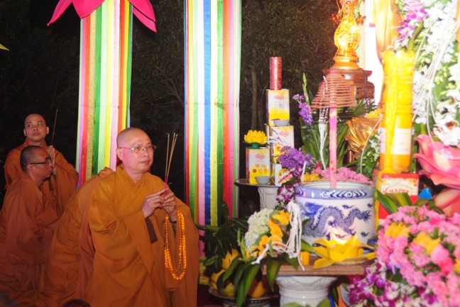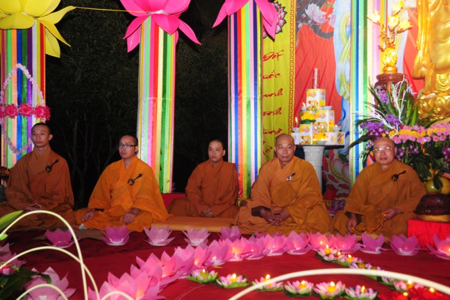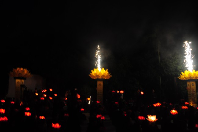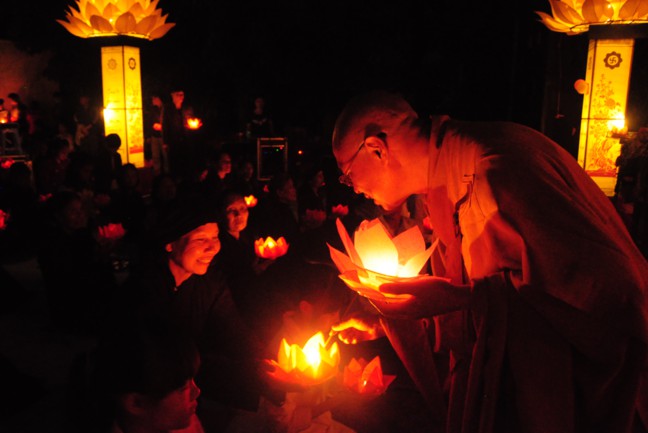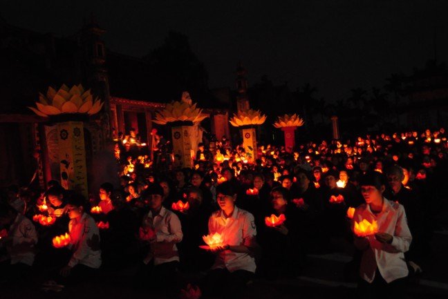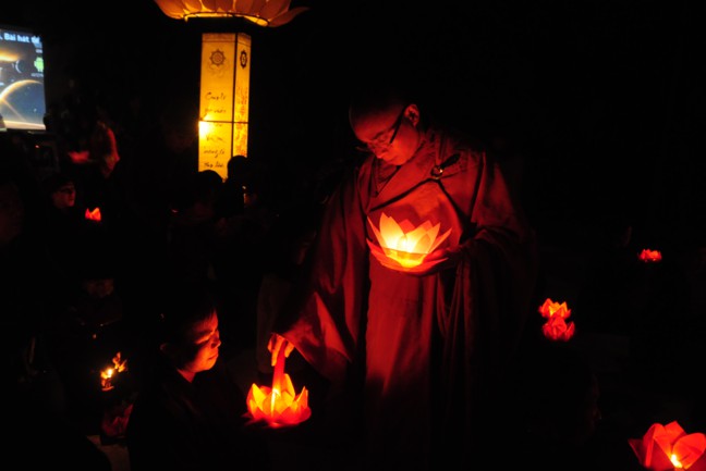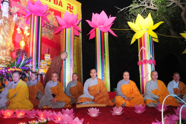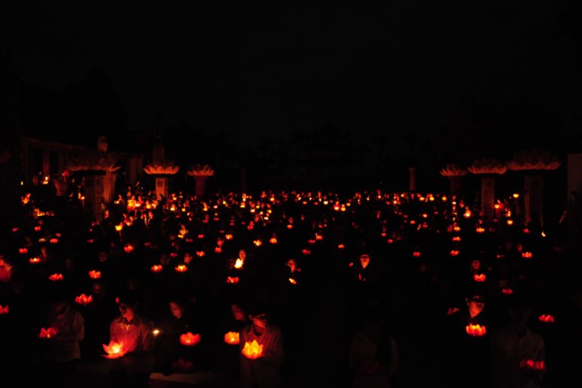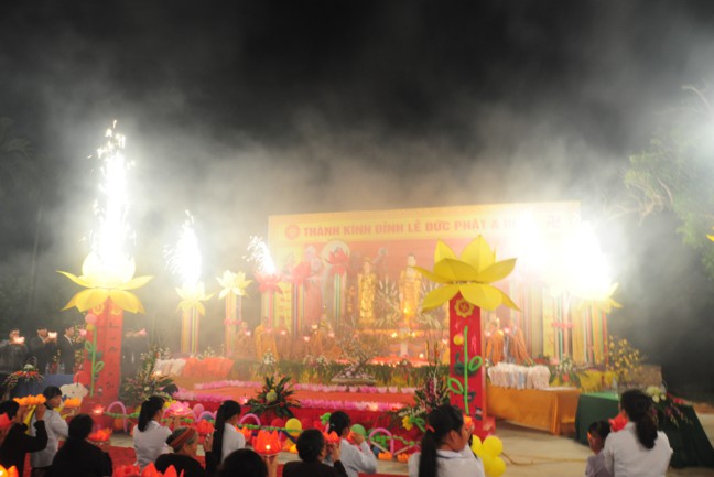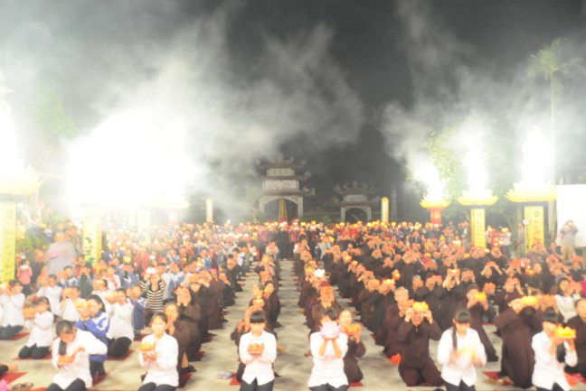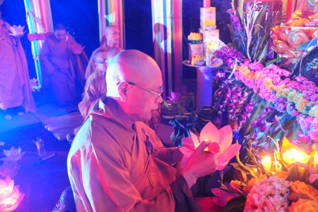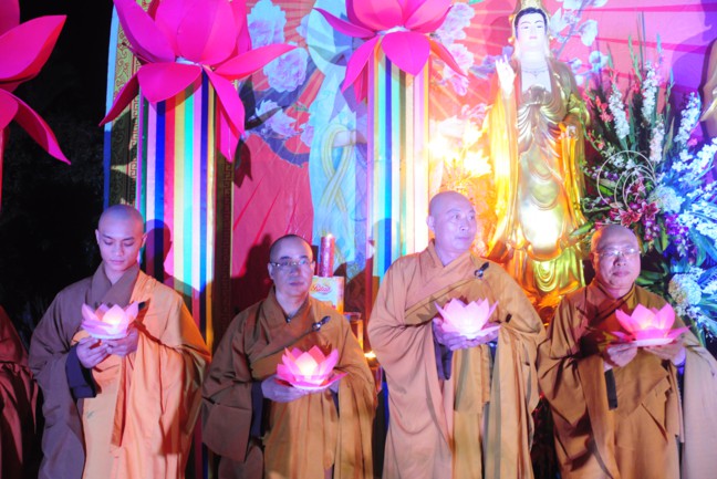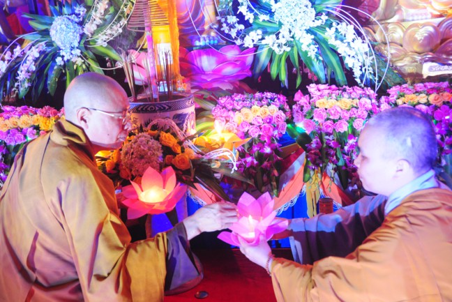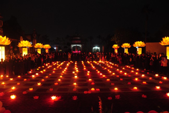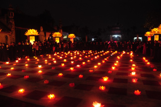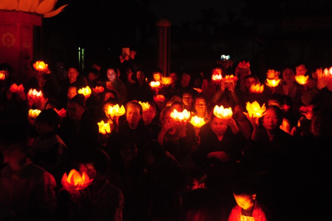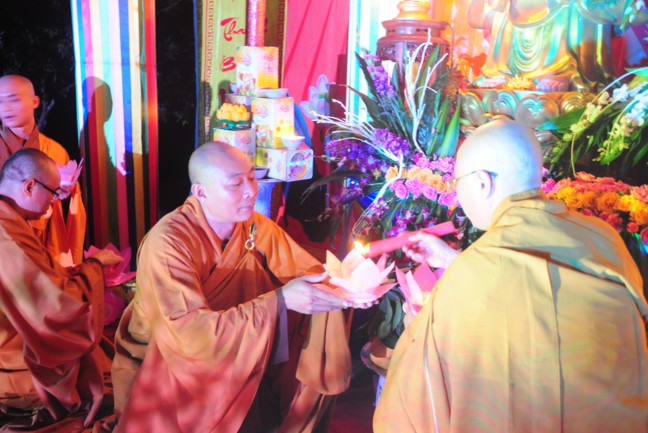 Thời khắc mà các Phật tử mong đợi nhất đã đến khi TT. Thích Thanh Giác thắp lên ngọn đèn hoa đăng đầu tiên. Ánh sáng đó đã được thượng tọa lấy từ bàn Phật, ánh sáng của Từ bi và Trí tuệ, ánh sáng của sự hiểu biết đã được truyền sang cho chư tôn đức Tăng Ni, những sứ giả của Như Lai, là những mạng mạch của Phật Pháp, những ánh sáng đó đã lan dần khắp sân chùa với những ngọn nến lung linh, đầy sắc màu tạo nên một không gian linh thiêng, huyền ảo. Cầm ngọn nến trên tay, chắc hẳn tâm ai cũng đang hướng về thế giới Tây Phương Cực Lạc, nơi mà có Đức Phật A Di Đà đang thuyết pháp, dâng trọn tấm lòng thành kính nhất của mình để cúng dàng lên Đức Phật A Di Đà nhân kỷ niệm ngày khánh đản của Ngài.