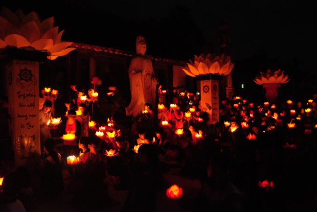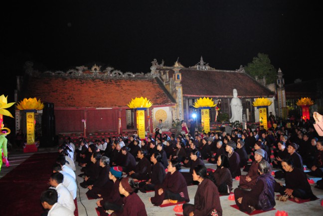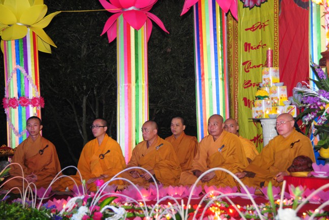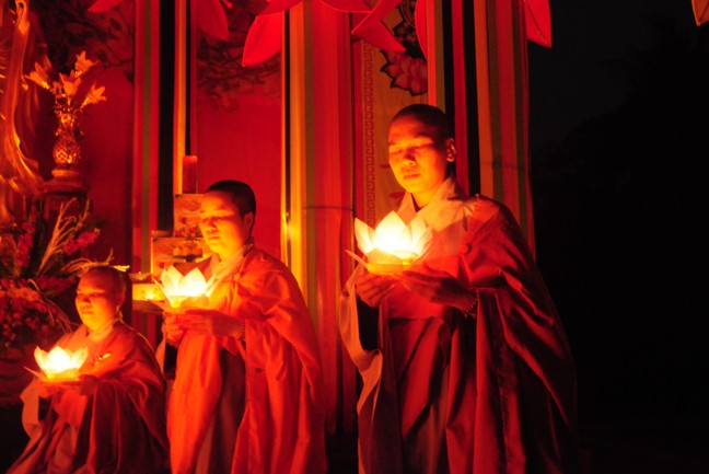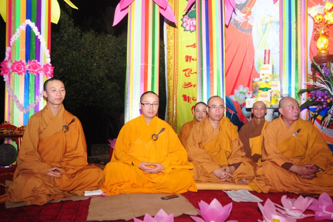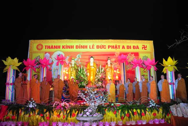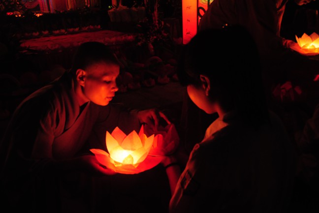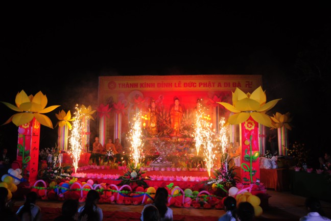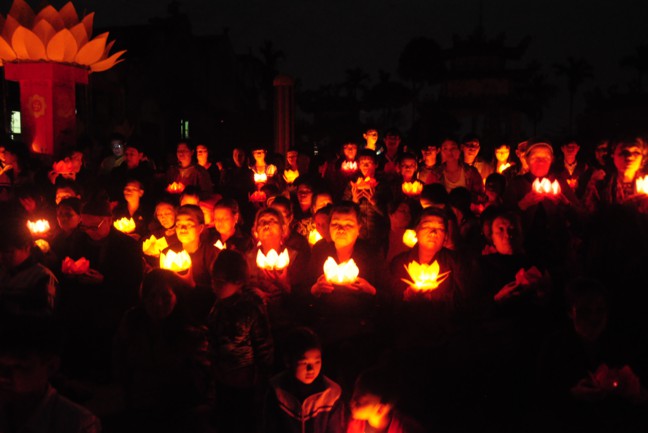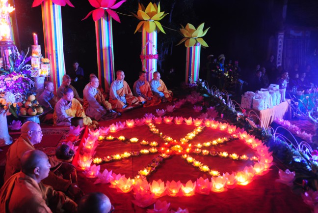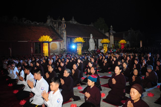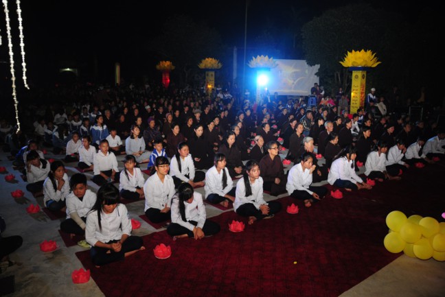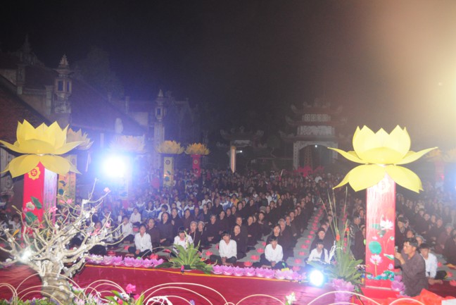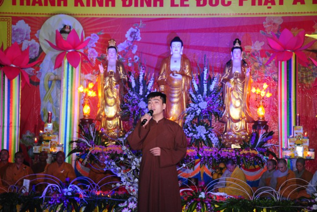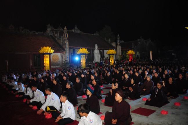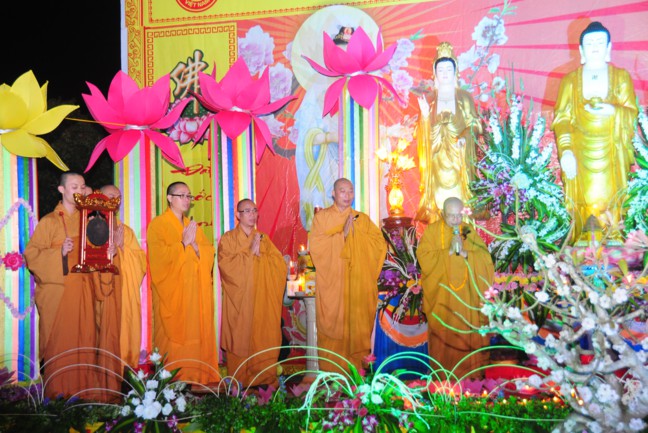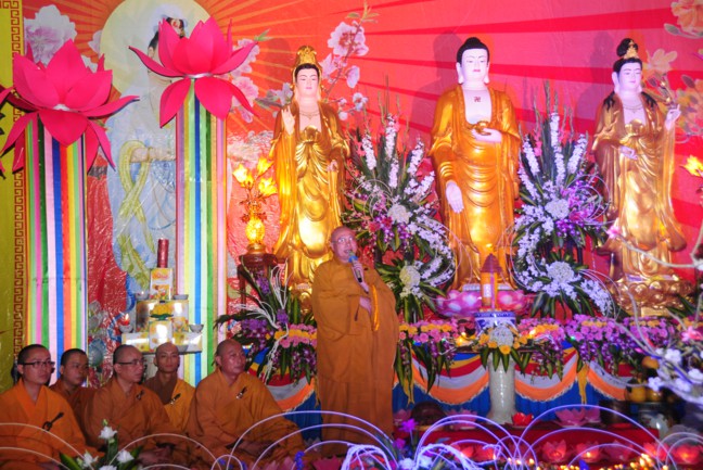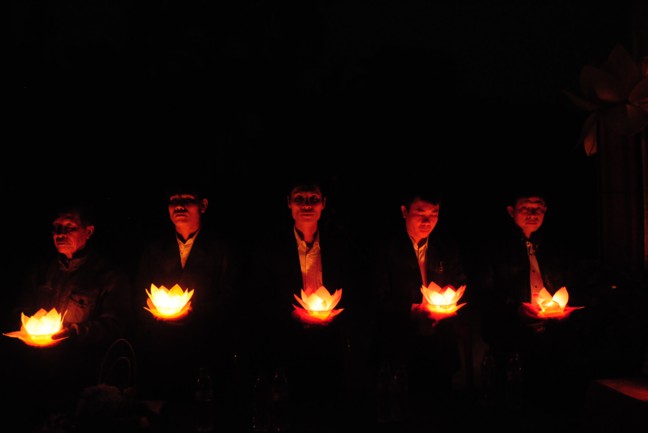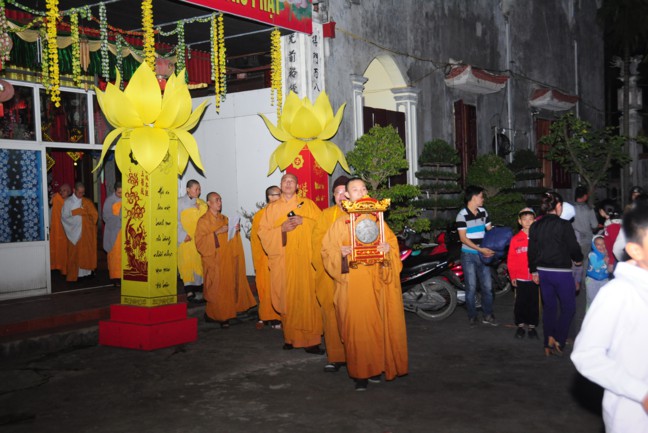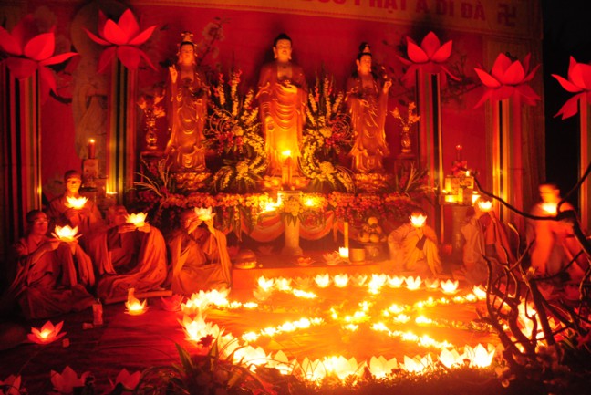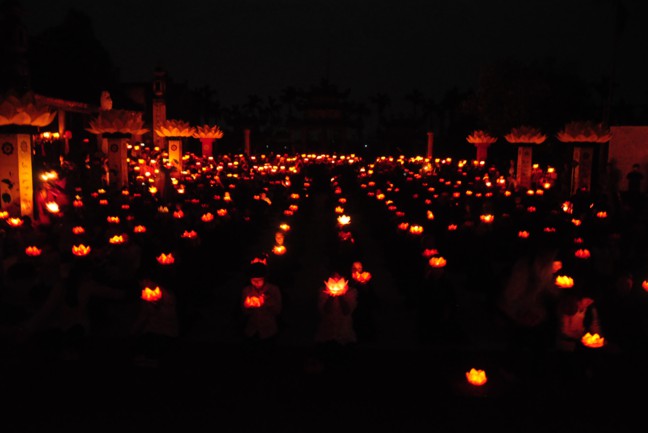 Thời khắc mà các Phật tử mong đợi nhất đã đến khi TT. Thích Thanh Giác thắp lên ngọn đèn hoa đăng đầu tiên. Ánh sáng đó đã được thượng tọa lấy từ bàn Phật, ánh sáng của Từ bi và Trí tuệ, ánh sáng của sự hiểu biết đã được truyền sang cho chư tôn đức Tăng Ni, những sứ giả của Như Lai, là những mạng mạch của Phật Pháp, những ánh sáng đó đã lan dần khắp sân chùa với những ngọn nến lung linh, đầy sắc màu tạo nên một không gian linh thiêng, huyền ảo. Cầm ngọn nến trên tay, chắc hẳn tâm ai cũng đang hướng về thế giới Tây Phương Cực Lạc, nơi mà có Đức Phật A Di Đà đang thuyết pháp, dâng trọn tấm lòng thành kính nhất của mình để cúng dàng lên Đức Phật A Di Đà nhân kỷ niệm ngày khánh đản của Ngài.