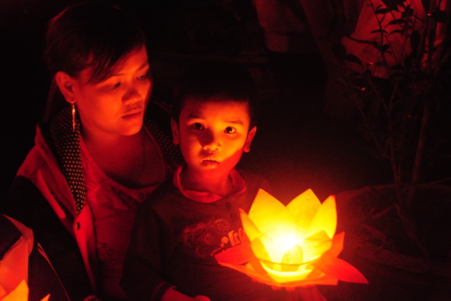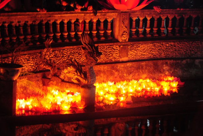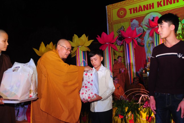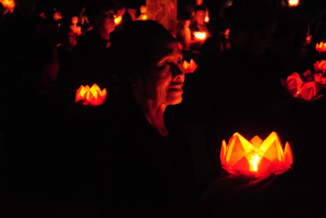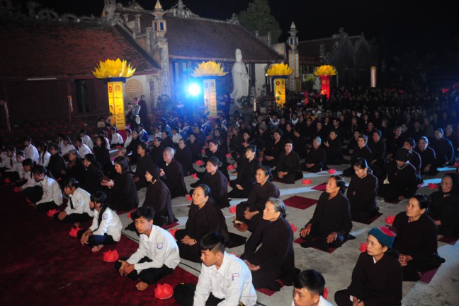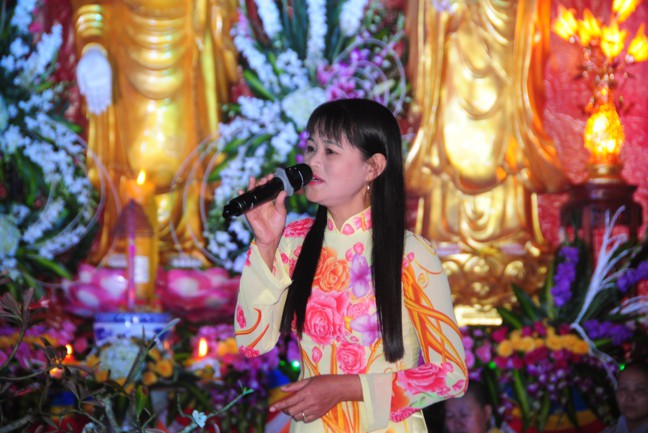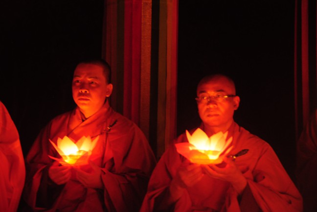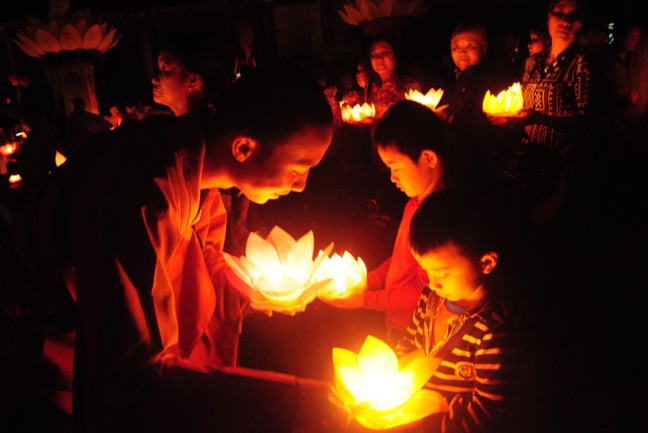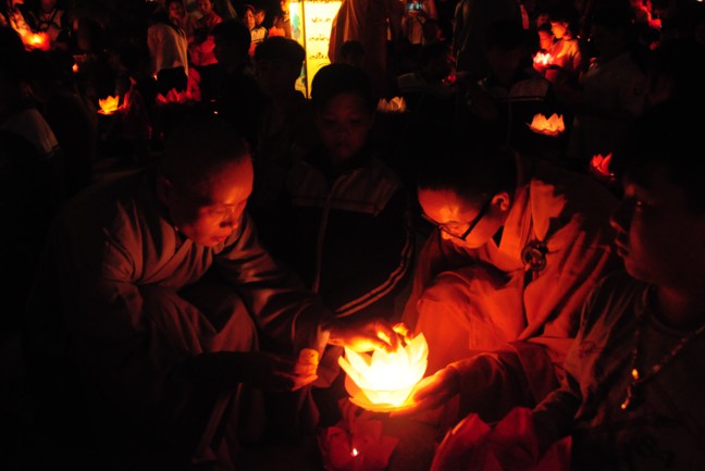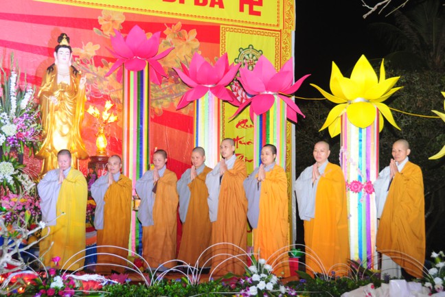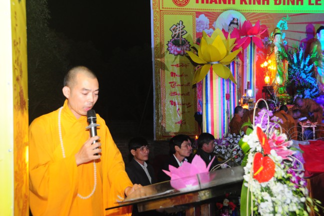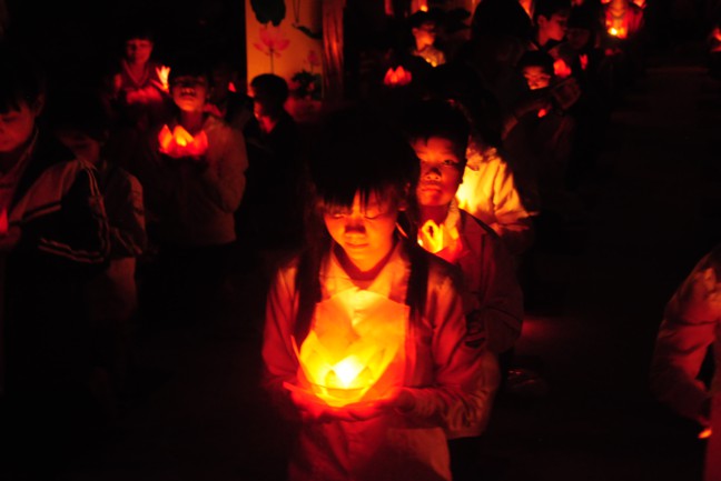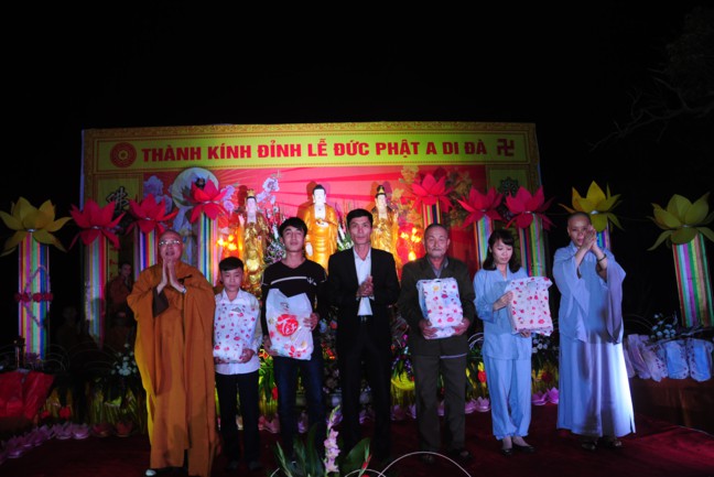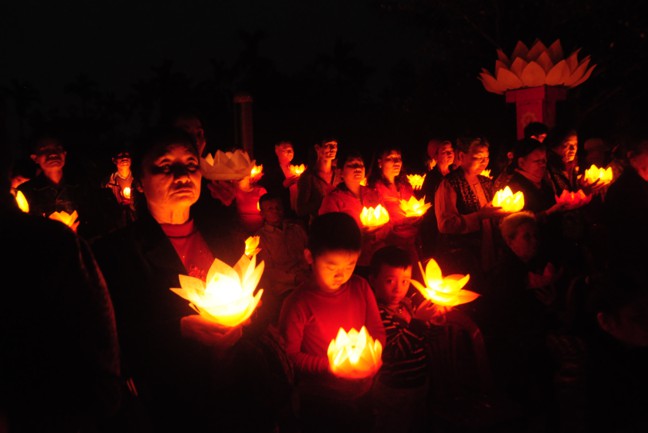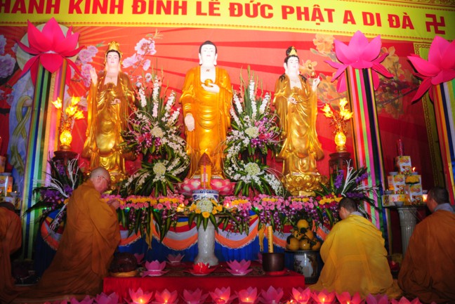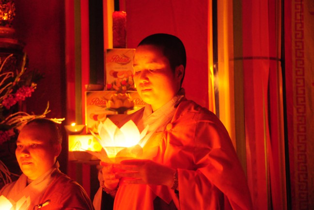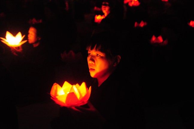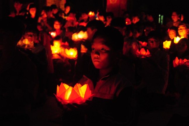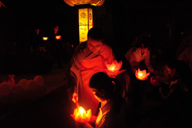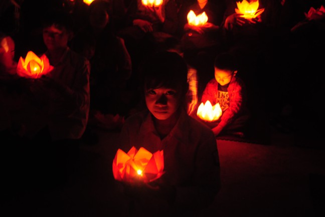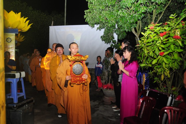Thời khắc mà các Phật tử mong đợi nhất đã đến khi TT. Thích Thanh Giác thắp lên ngọn đèn hoa đăng đầu tiên. Ánh sáng đó đã được thượng tọa lấy từ bàn Phật, ánh sáng của Từ bi và Trí tuệ, ánh sáng của sự hiểu biết đã được truyền sang cho chư tôn đức Tăng Ni, những sứ giả của Như Lai, là những mạng mạch của Phật Pháp, những ánh sáng đó đã lan dần khắp sân chùa với những ngọn nến lung linh, đầy sắc màu tạo nên một không gian linh thiêng, huyền ảo. Cầm ngọn nến trên tay, chắc hẳn tâm ai cũng đang hướng về thế giới Tây Phương Cực Lạc, nơi mà có Đức Phật A Di Đà đang thuyết pháp, dâng trọn tấm lòng thành kính nhất của mình để cúng dàng lên Đức Phật A Di Đà nhân kỷ niệm ngày khánh đản của Ngài.