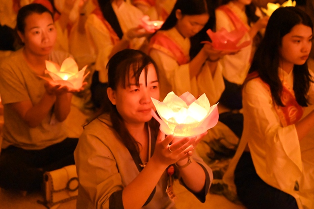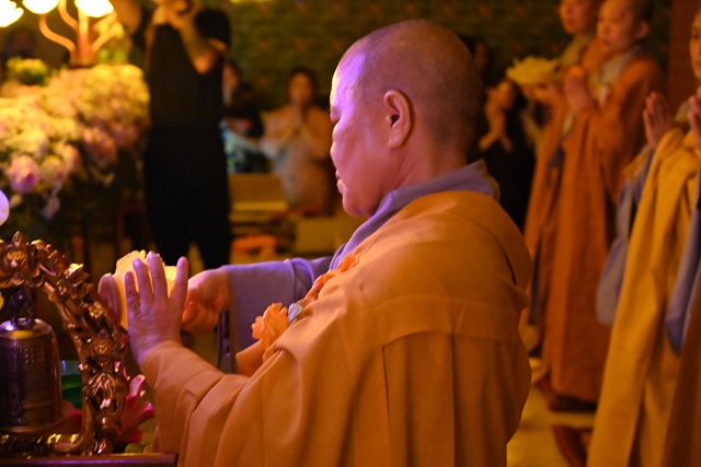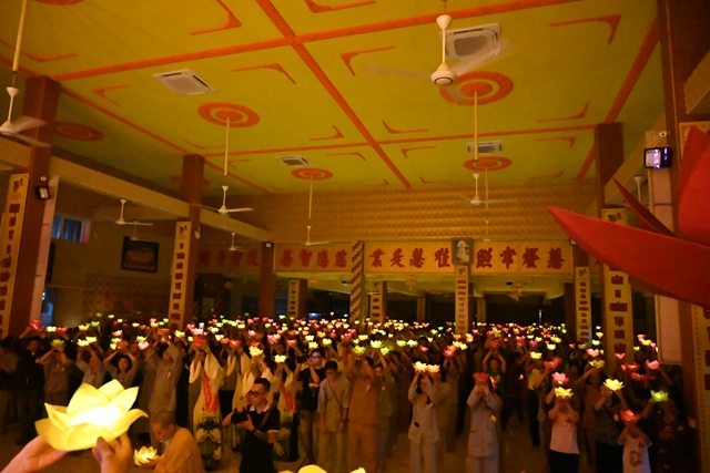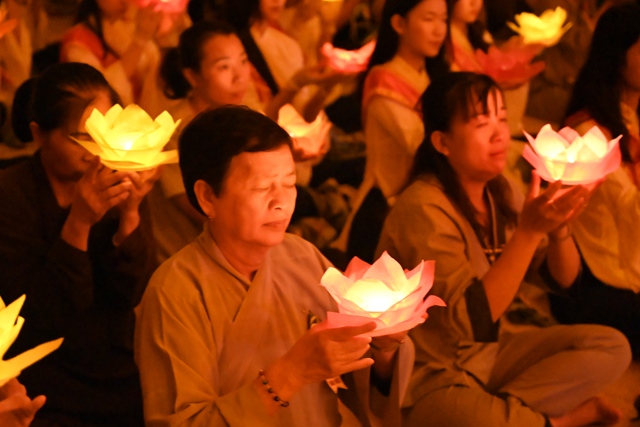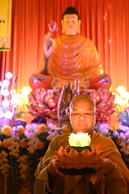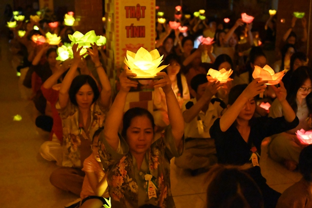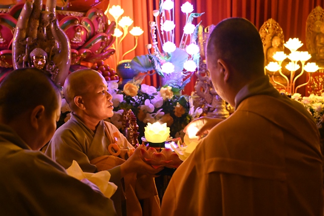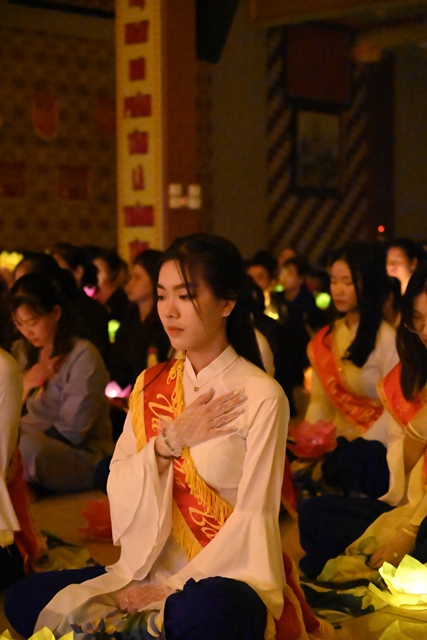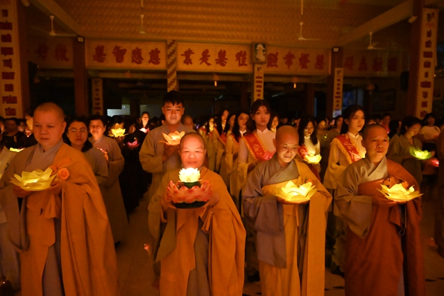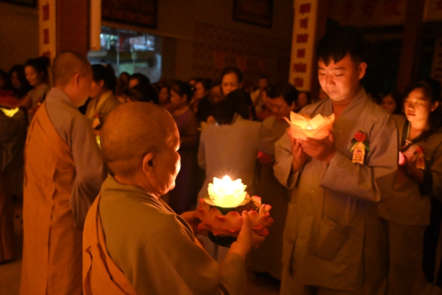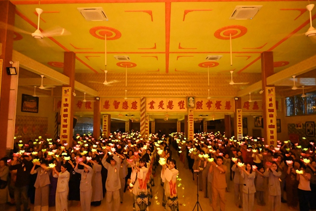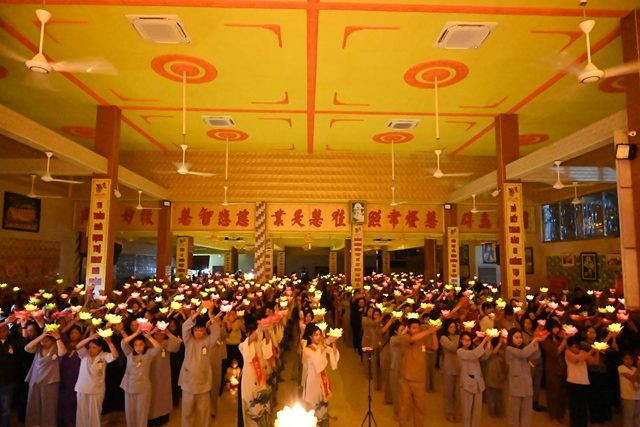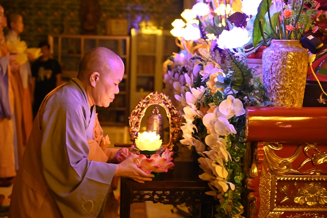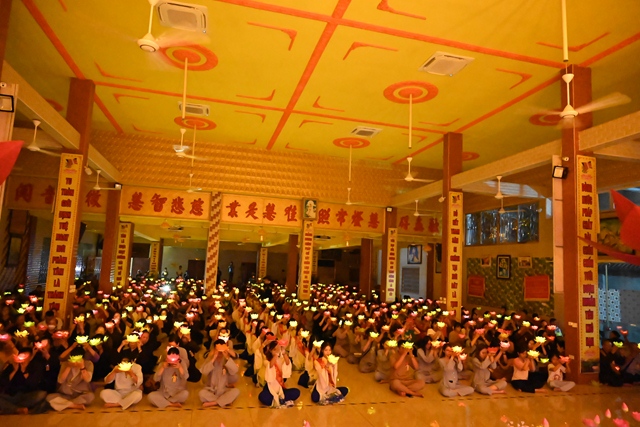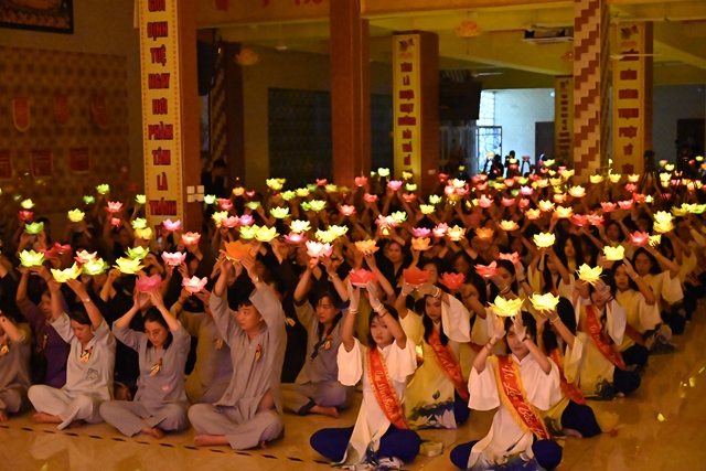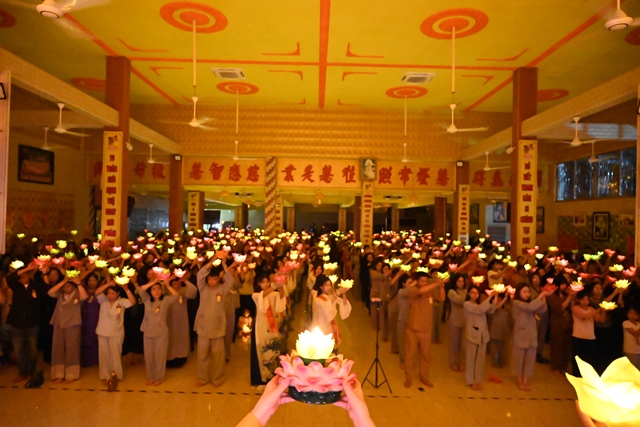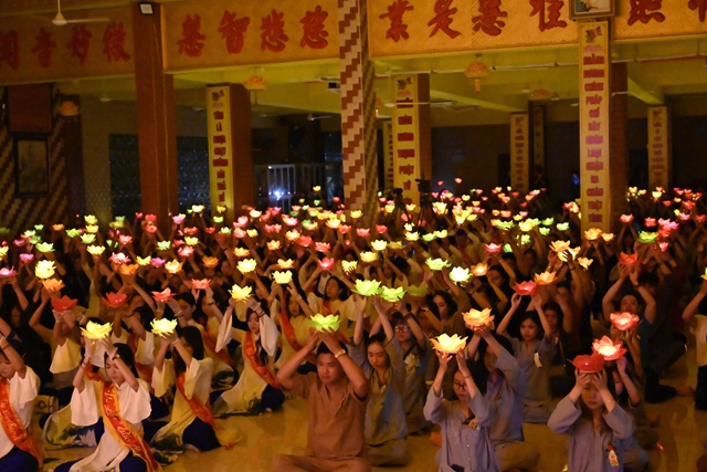 Thời khắc linh thiêng nhất của buổi lễ đã tới khi chư tôn đức Ni hiện tiền cử hành nghi lễ niêm hương bạch Phật, cầu nguyện thế giới hòa bình, chúng sinh an lạc. Tiếp đó, Ni sư Thích Tâm Chính – Trưởng Ban tổ chức đại lễ đã đón nhận ánh sáng đầu tiên từ ban Phật rồi truyền sang cho chư tôn đức Ni hiện tiền và toàn thể đại chúng, từng ngọn nến lung linh đã dần lan tỏa khắp giảng đường, càng làm cho buổi lễ trở nên linh thiêng và huyền ảo hơn. Trên tay mỗi Phật tử là ngọn hoa đăng tượng trưng cho tình thương của cha mẹ dành cho con cái, mỗi người con sẽ thầm nguyện với lòng mình, nguyện giữ cho ngọn lửa đó, để ngọn lửa không bao giờ tắt. Ngọn đèn này cũng được xem như tình thương của cha mẹ dành cho con cái. Đó là tình thương bao la, rộng lớn, tình thương không ngơi nghỉ và thầm cầu nguyện cầu ông bà cha mẹ hiện tiền được phúc thọ tăng long, ông bà cha mẹ quá vãng được sinh về Tây Phương Cực Lạc.