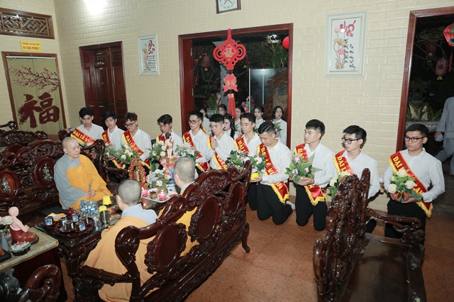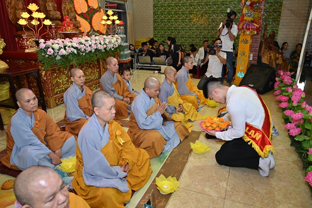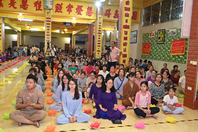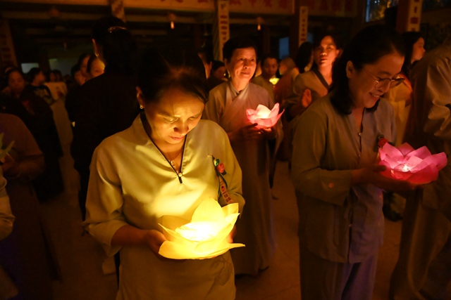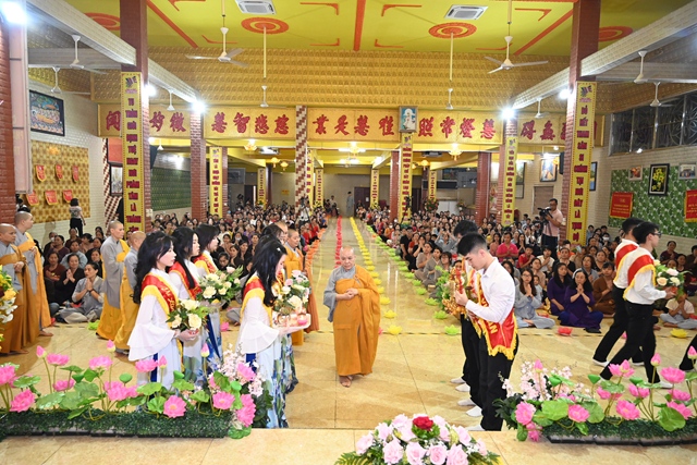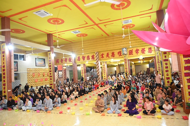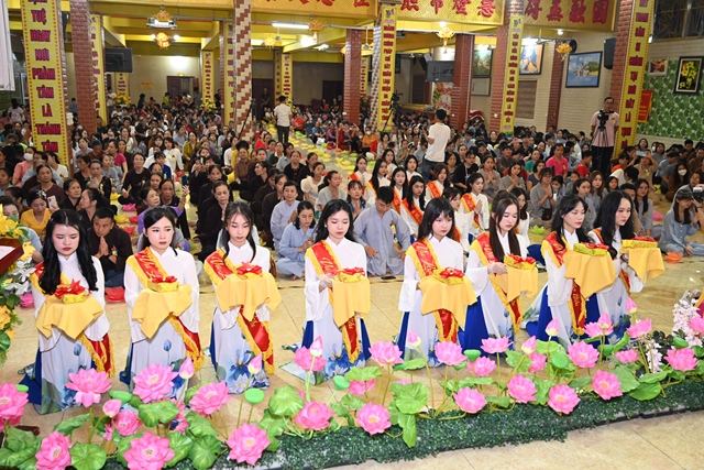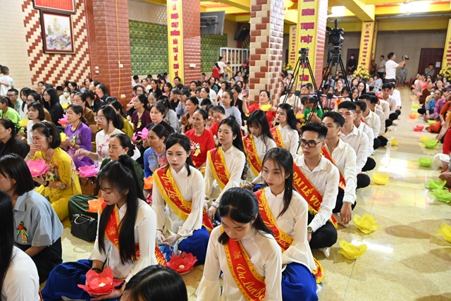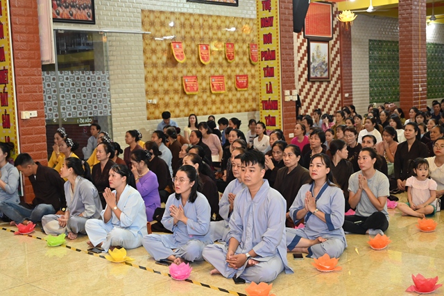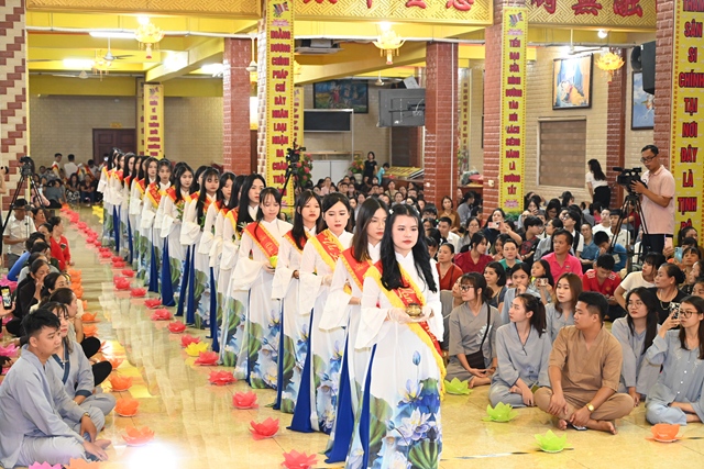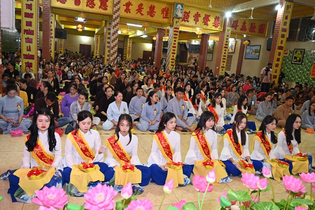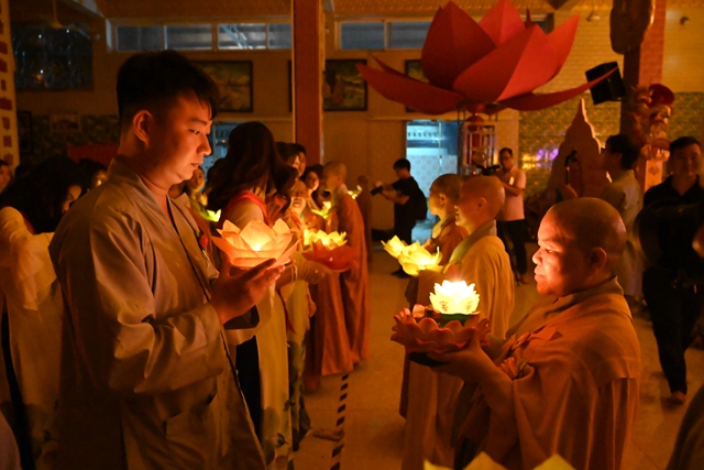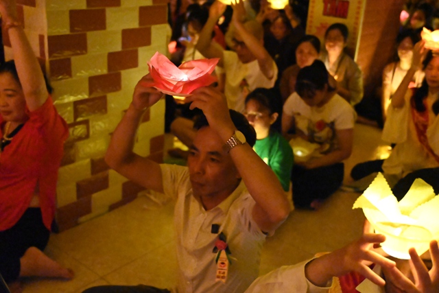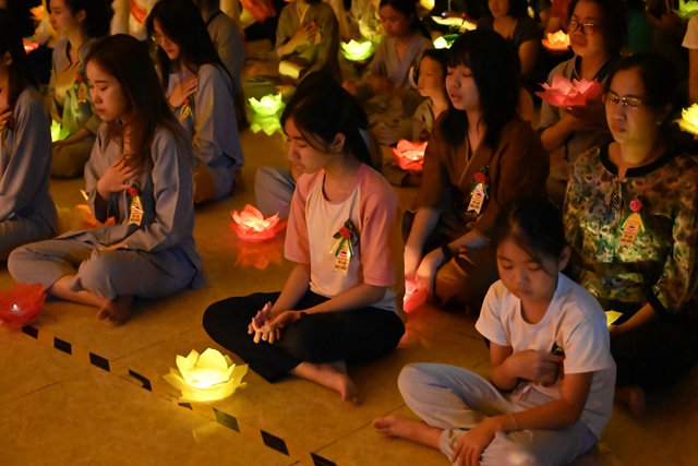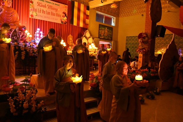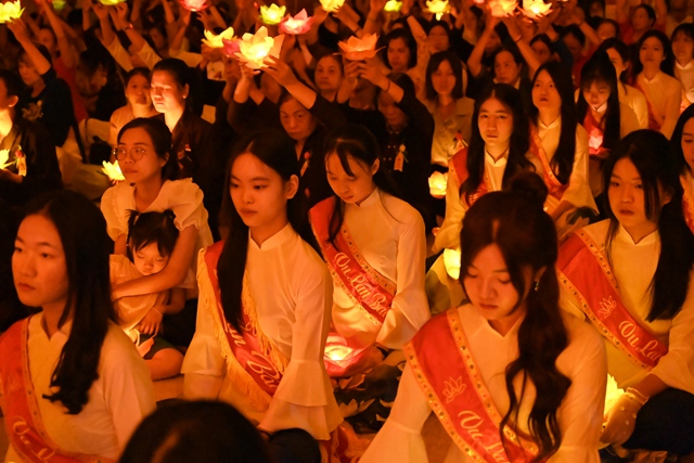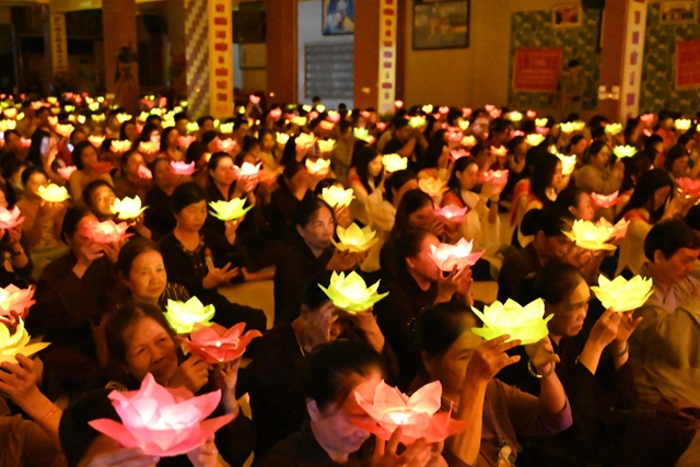 Thời khắc linh thiêng nhất của buổi lễ đã tới khi chư tôn đức Ni hiện tiền cử hành nghi lễ niêm hương bạch Phật, cầu nguyện thế giới hòa bình, chúng sinh an lạc. Tiếp đó, Ni sư Thích Tâm Chính – Trưởng Ban tổ chức đại lễ đã đón nhận ánh sáng đầu tiên từ ban Phật rồi truyền sang cho chư tôn đức Ni hiện tiền và toàn thể đại chúng, từng ngọn nến lung linh đã dần lan tỏa khắp giảng đường, càng làm cho buổi lễ trở nên linh thiêng và huyền ảo hơn. Trên tay mỗi Phật tử là ngọn hoa đăng tượng trưng cho tình thương của cha mẹ dành cho con cái, mỗi người con sẽ thầm nguyện với lòng mình, nguyện giữ cho ngọn lửa đó, để ngọn lửa không bao giờ tắt. Ngọn đèn này cũng được xem như tình thương của cha mẹ dành cho con cái. Đó là tình thương bao la, rộng lớn, tình thương không ngơi nghỉ và thầm cầu nguyện cầu ông bà cha mẹ hiện tiền được phúc thọ tăng long, ông bà cha mẹ quá vãng được sinh về Tây Phương Cực Lạc.