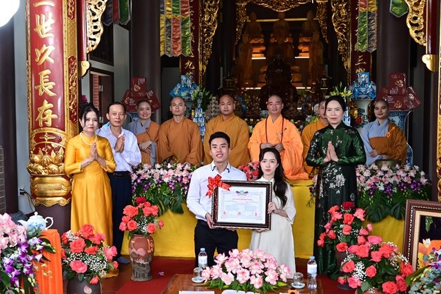 Sư cô Thích Diệu Ngọc – Trụ trì chùa Lại Sơn trao Giấy chứng nhận lễ Hằng Thuận cho đôi bạn trẻ