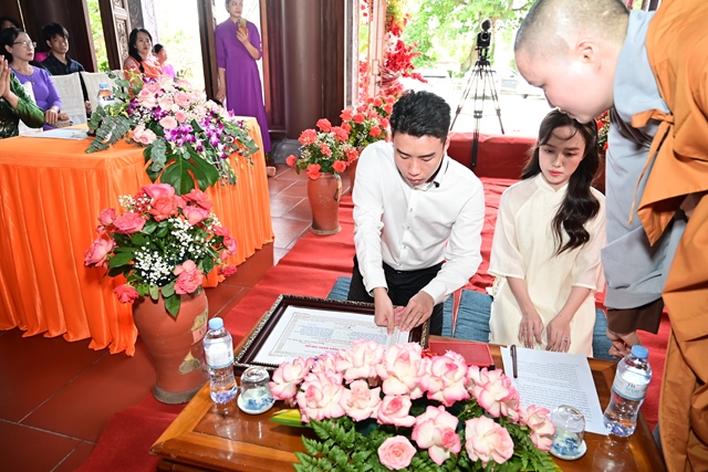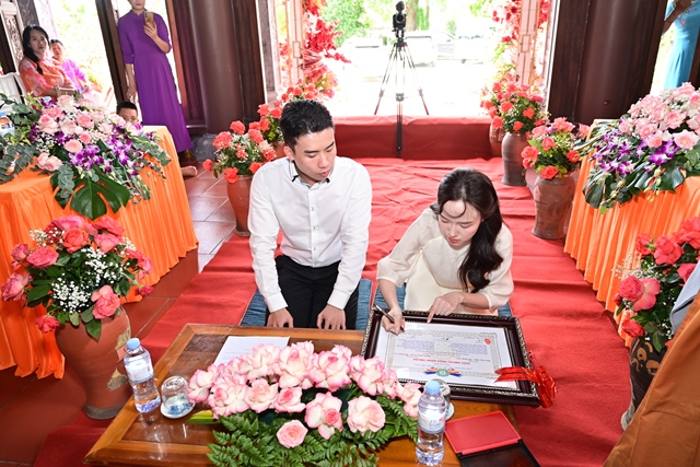 Đôi bạn trẻ ký ” Giấy chứng nhận lễ Hằng Thuận” tại chùa Lại Sơn trước sự chứng minh của chư tôn đức Tăng Ni và hai bên gia đình